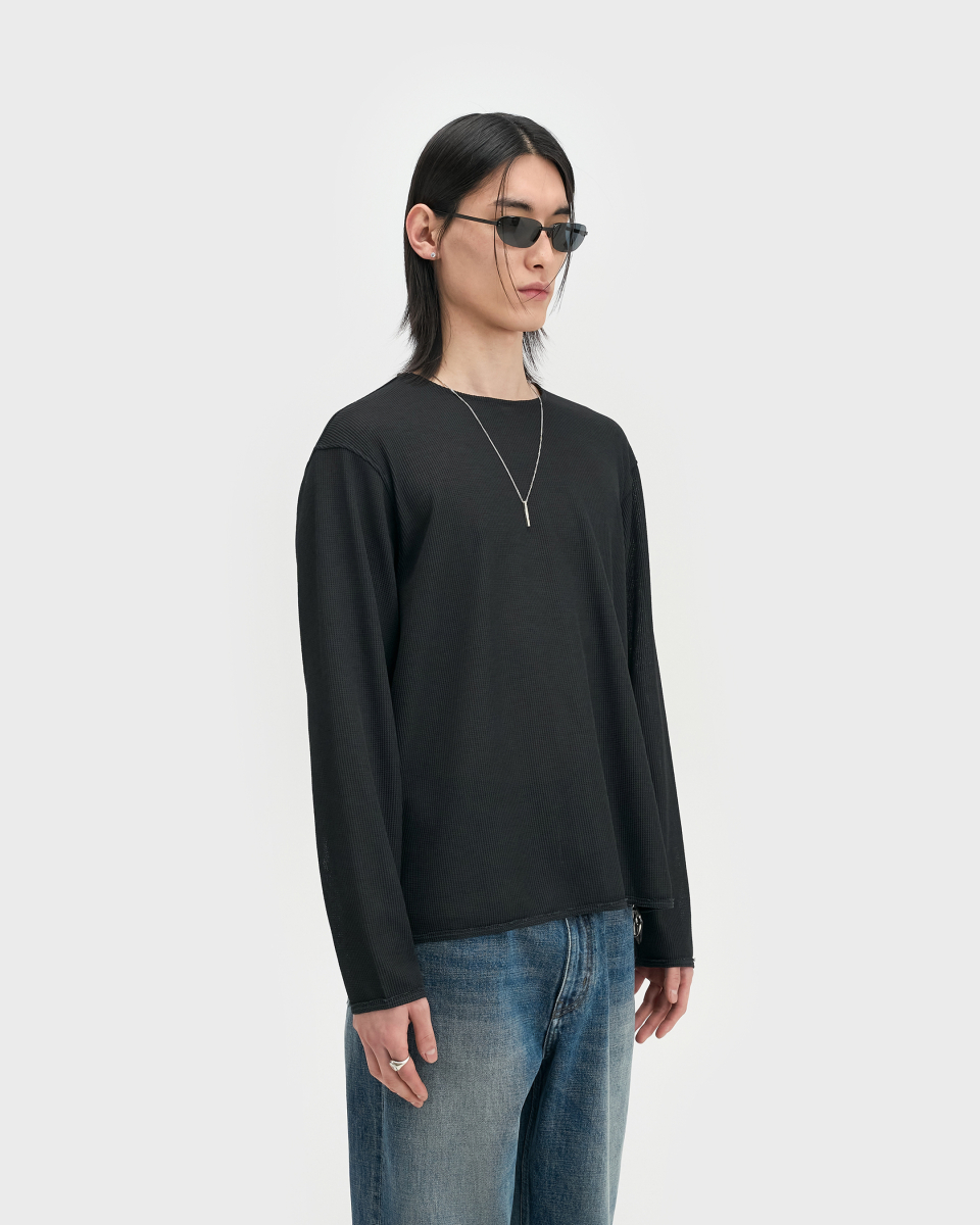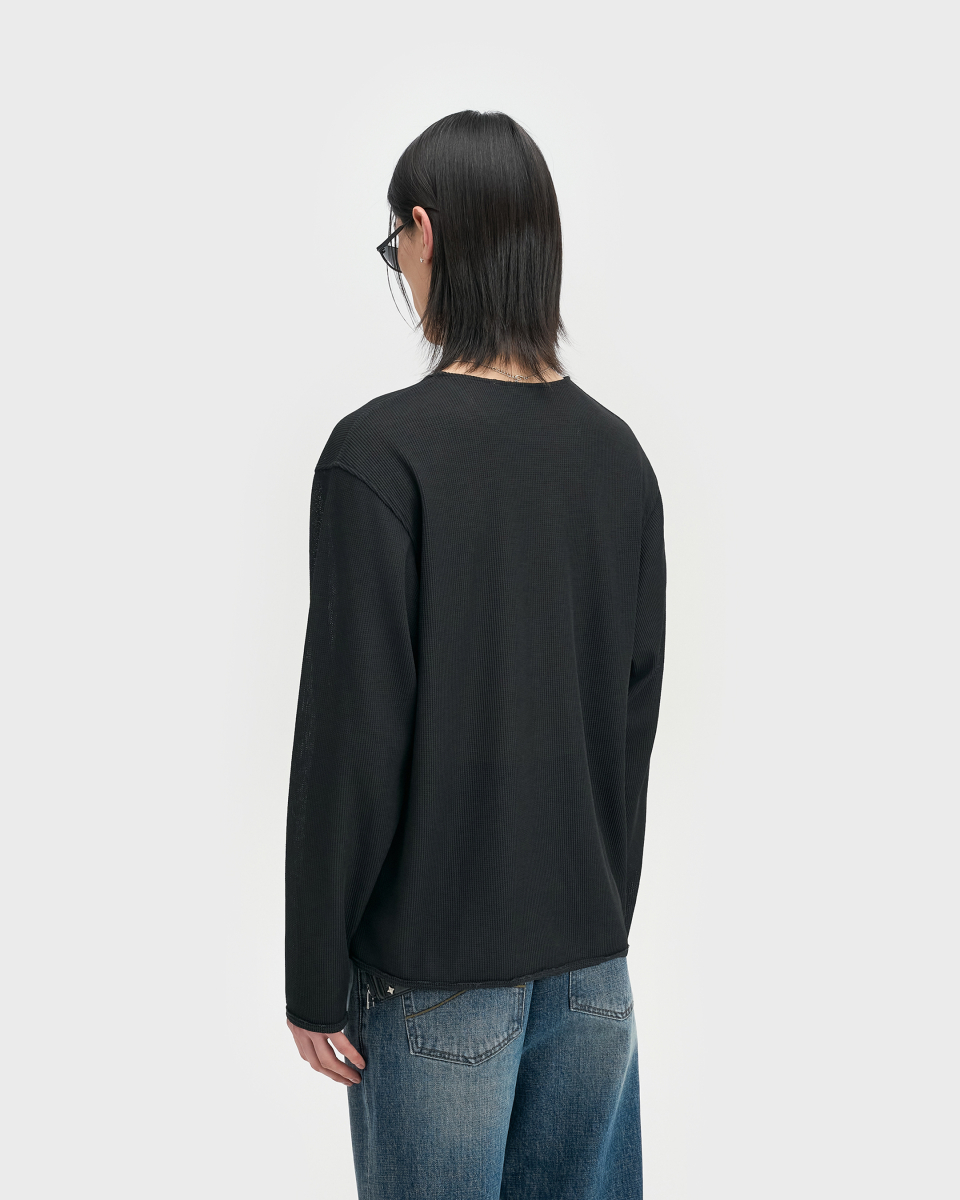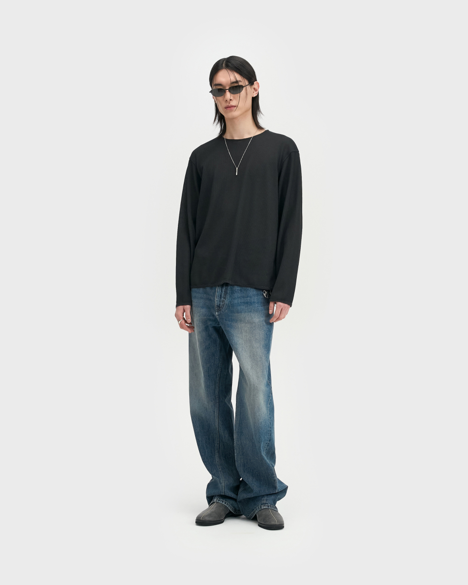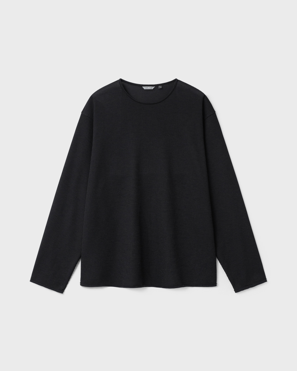 린넨 터치 원사의 드라이한 촉감과 멜란지 컬러가 돋보이는 롱슬리브. 가볍고 쾌적한 기능성 위에 불균일한 색감을 더해, 도시 환경 속에서도 빈티지한 깊이가 자연스럽게 드러나도록 설계된 아이템.