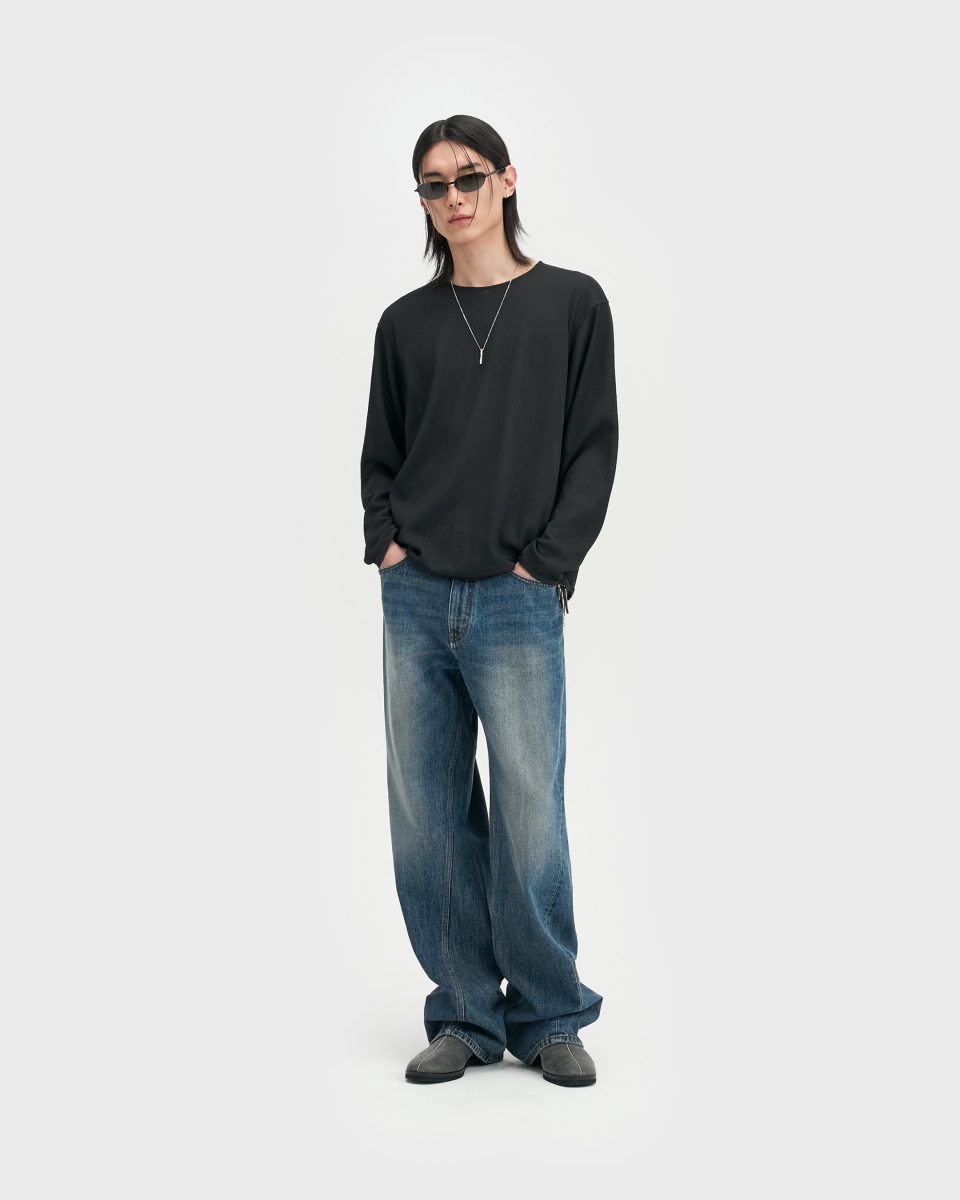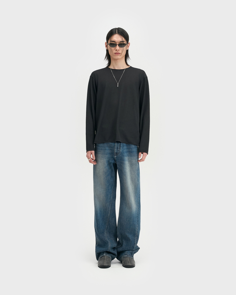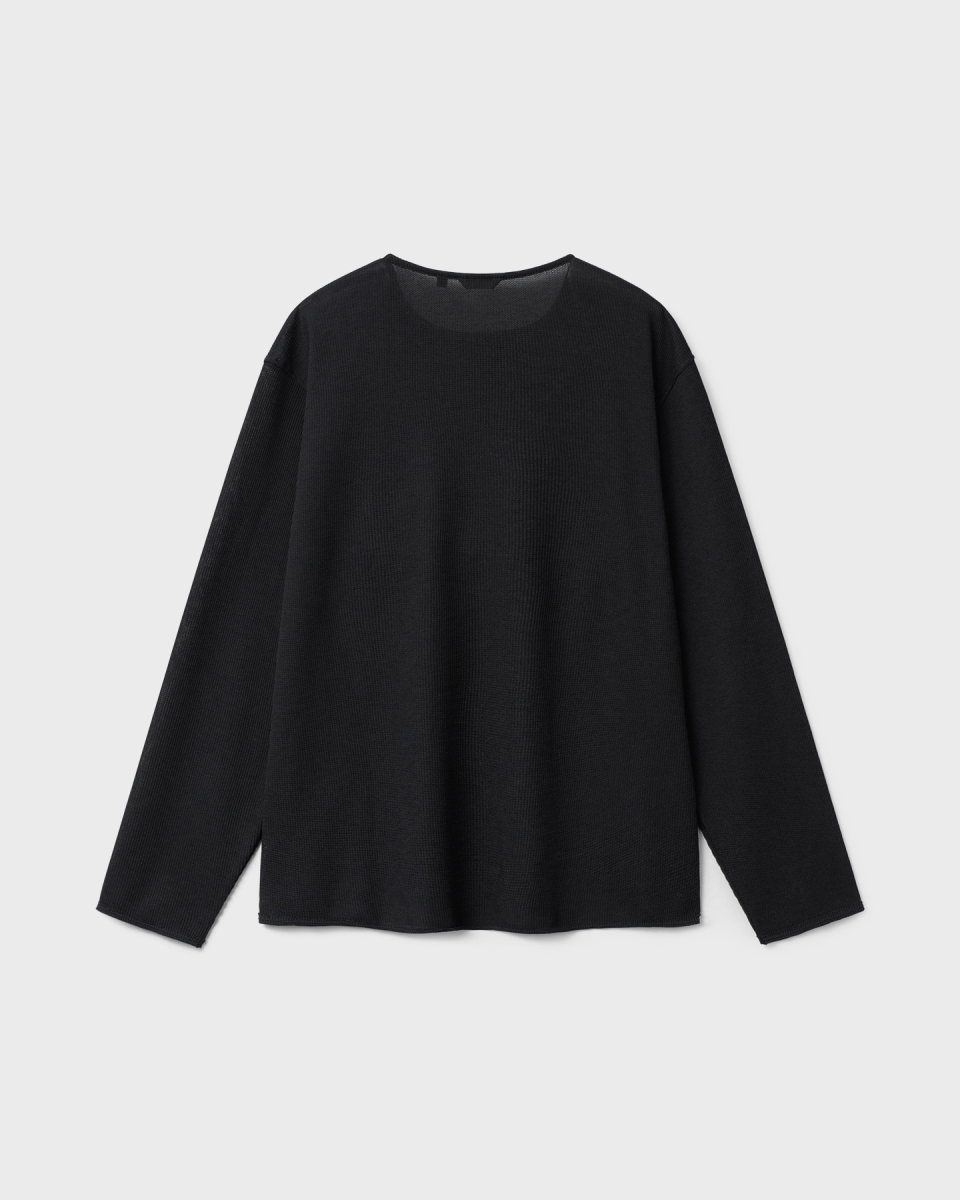 린넨 터치 원사의 드라이한 촉감과 멜란지 컬러가 돋보이는 롱슬리브. 가볍고 쾌적한 기능성 위에 불균일한 색감을 더해, 도시 환경 속에서도 빈티지한 깊이가 자연스럽게 드러나도록 설계된 아이템.