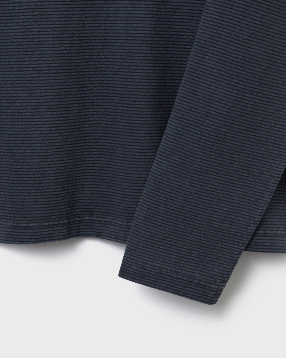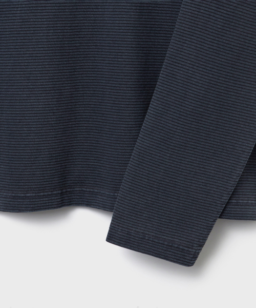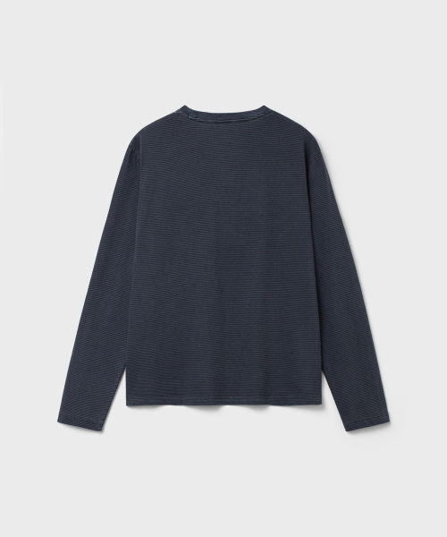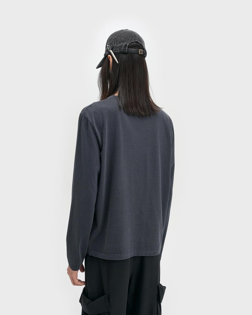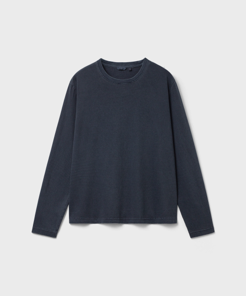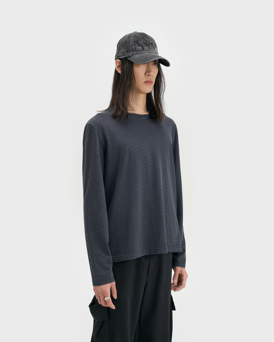 잔 스트라이프 패턴 위로 가먼트 피그먼트 다잉을 적용한 롱슬리브.
