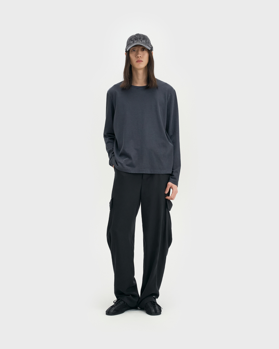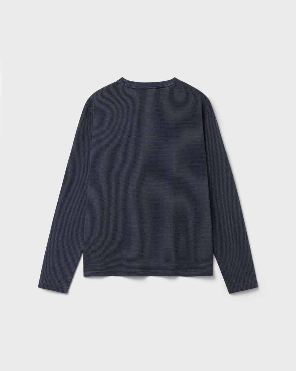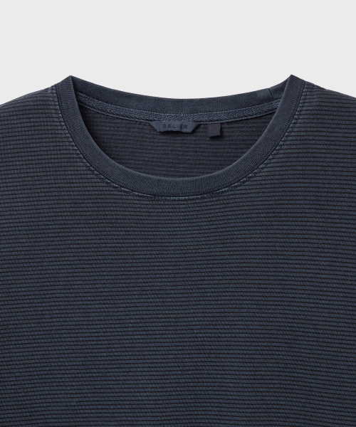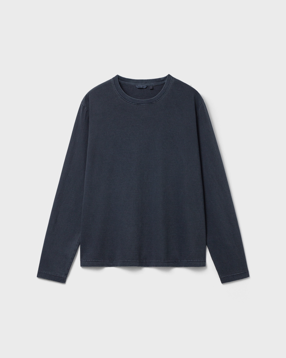 잔 스트라이프 패턴 위로 가먼트 피그먼트 다잉을 적용한 롱슬리브.