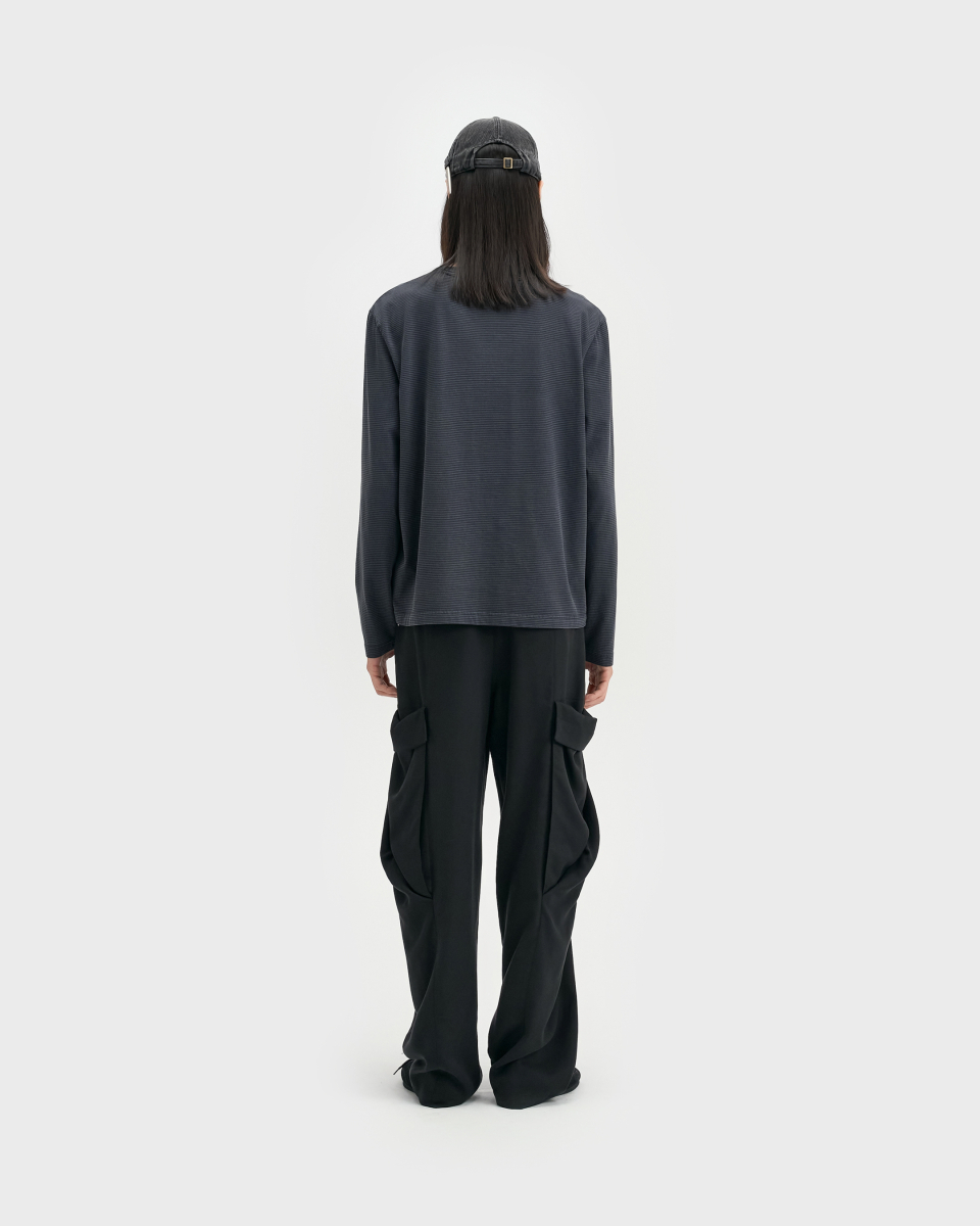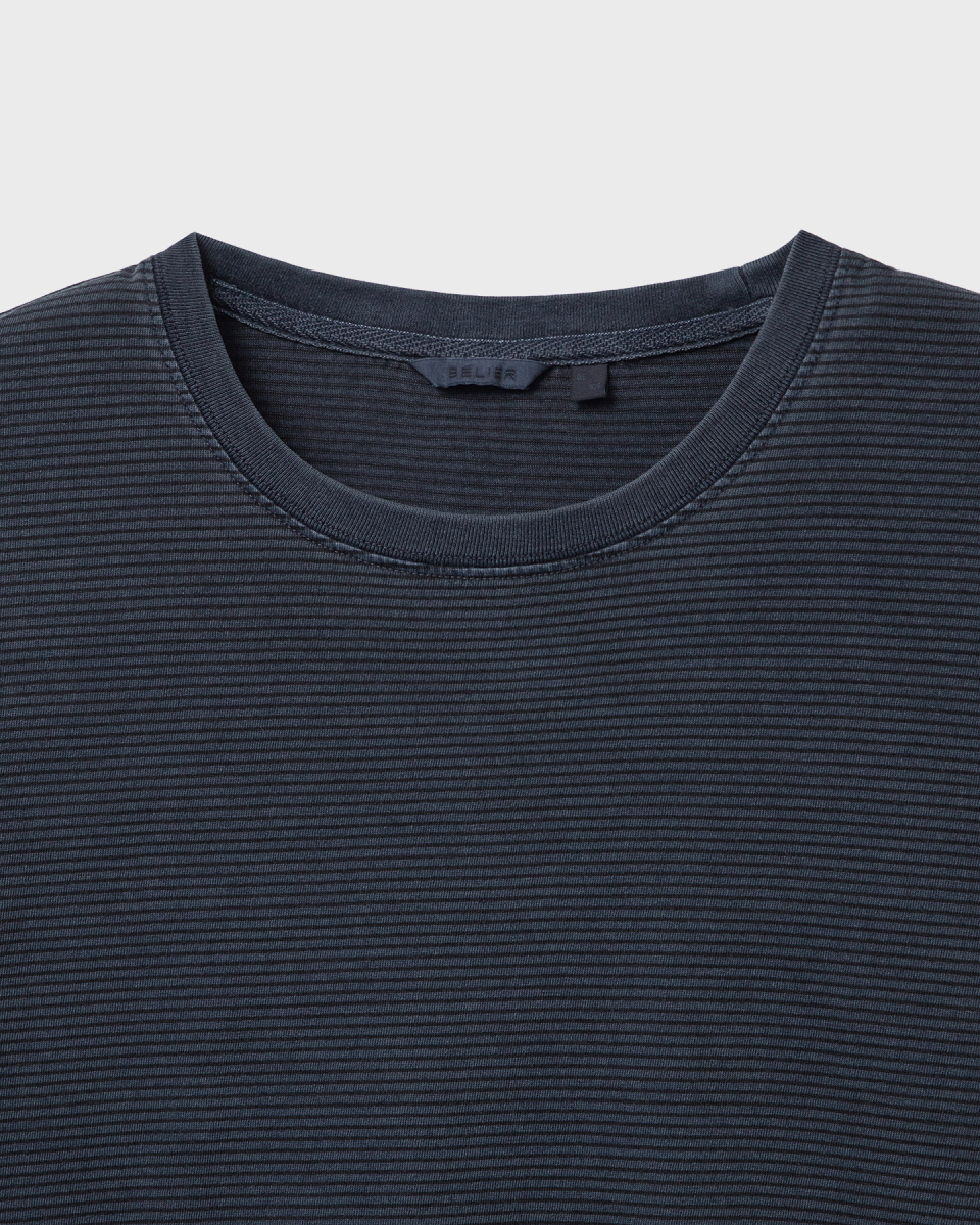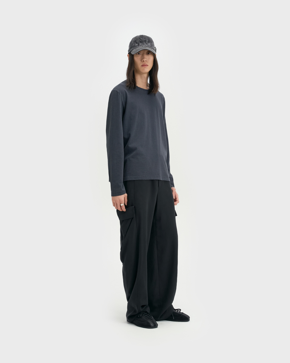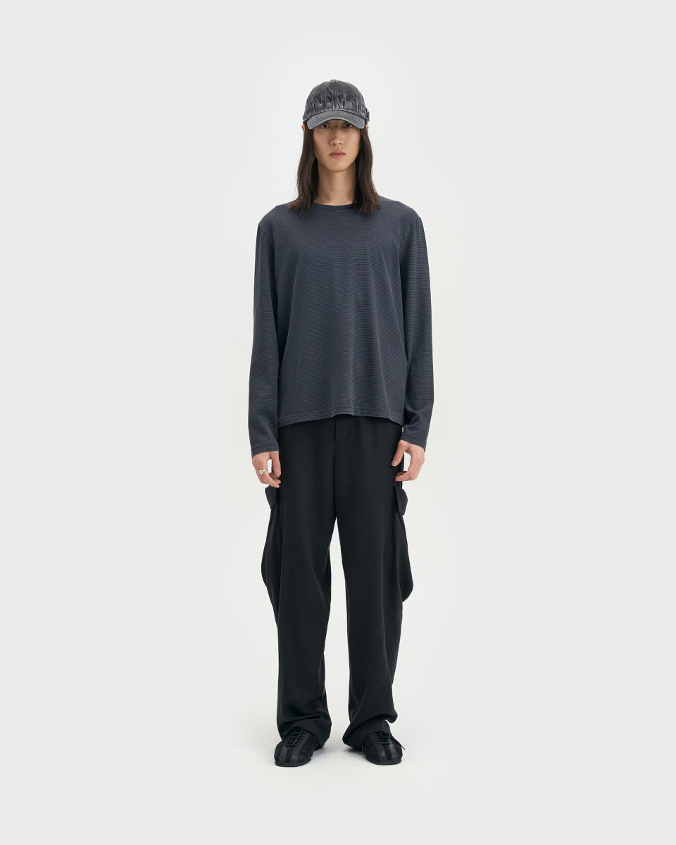 잔 스트라이프 패턴 위로 가먼트 피그먼트 다잉을 적용한 롱슬리브.
