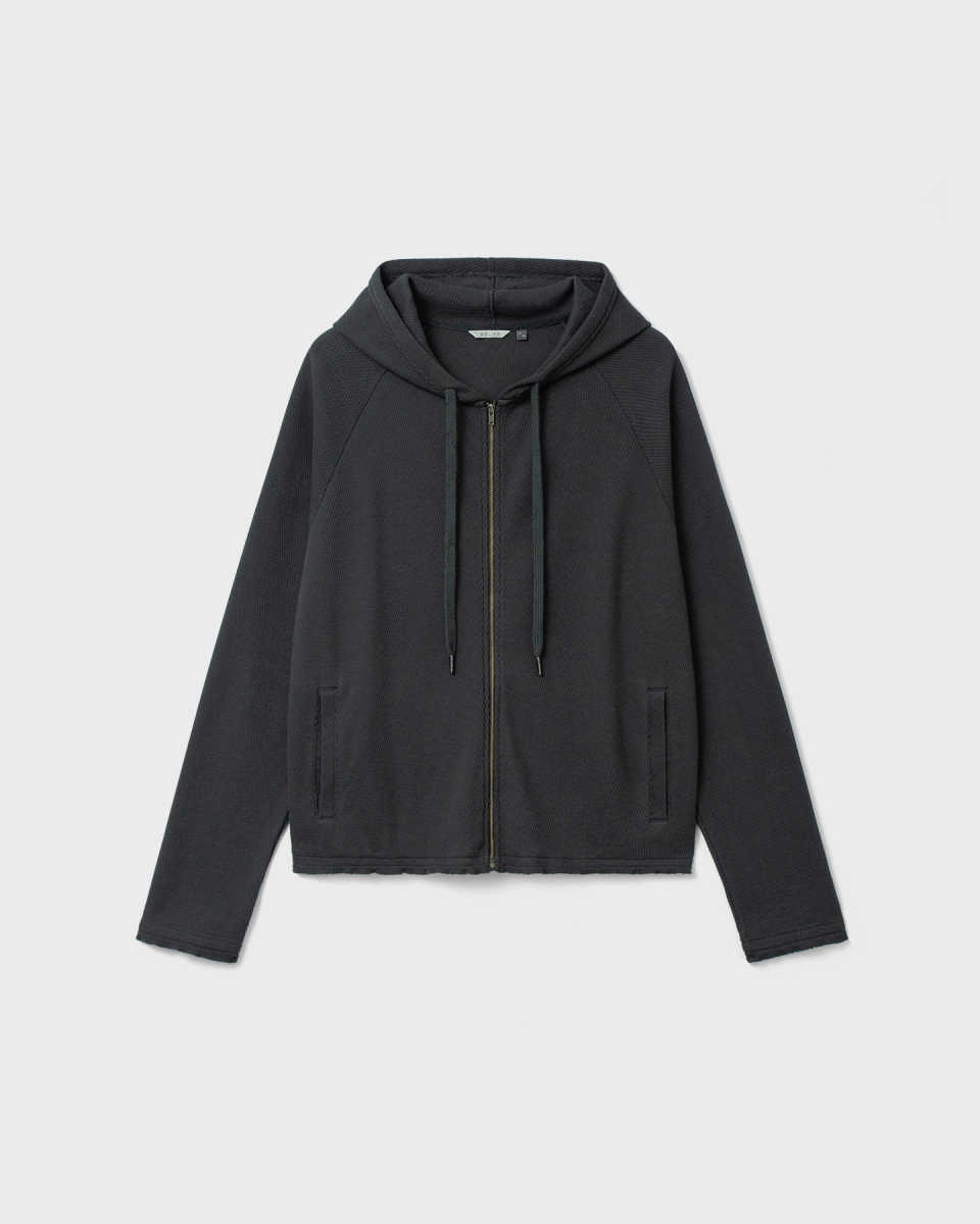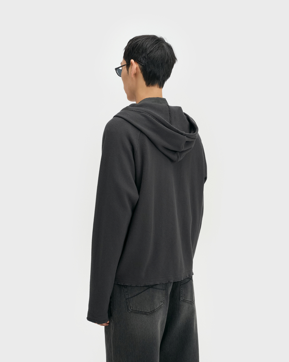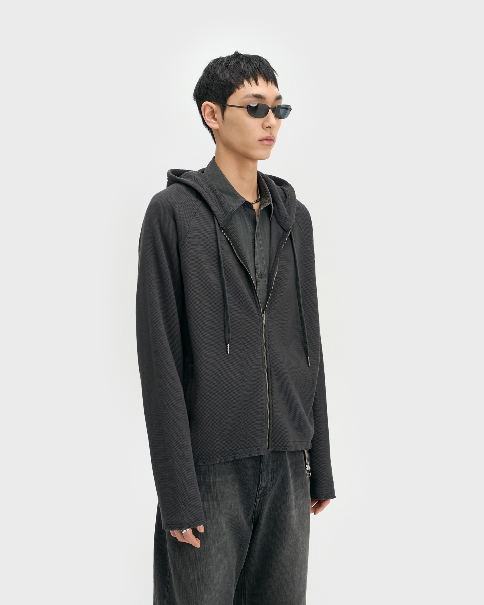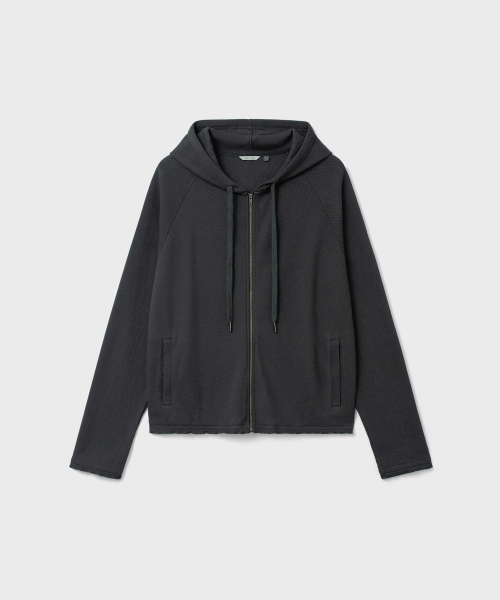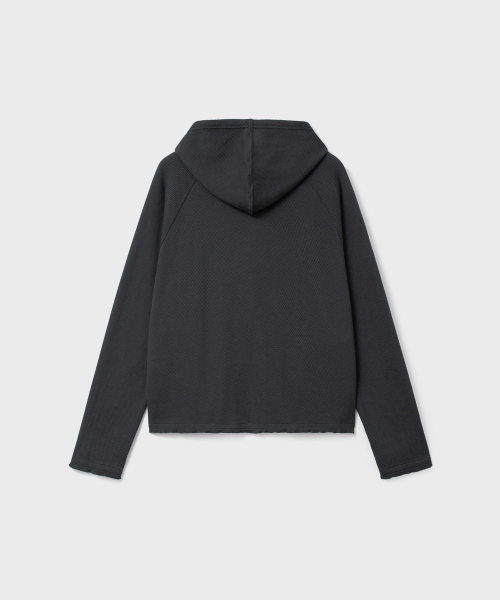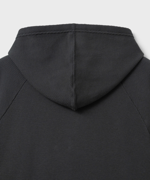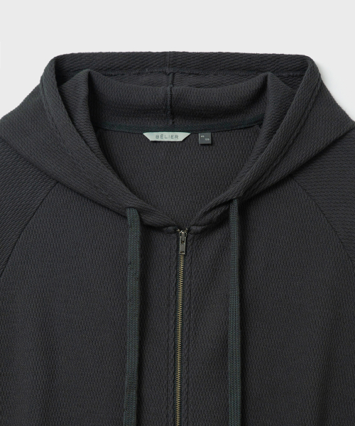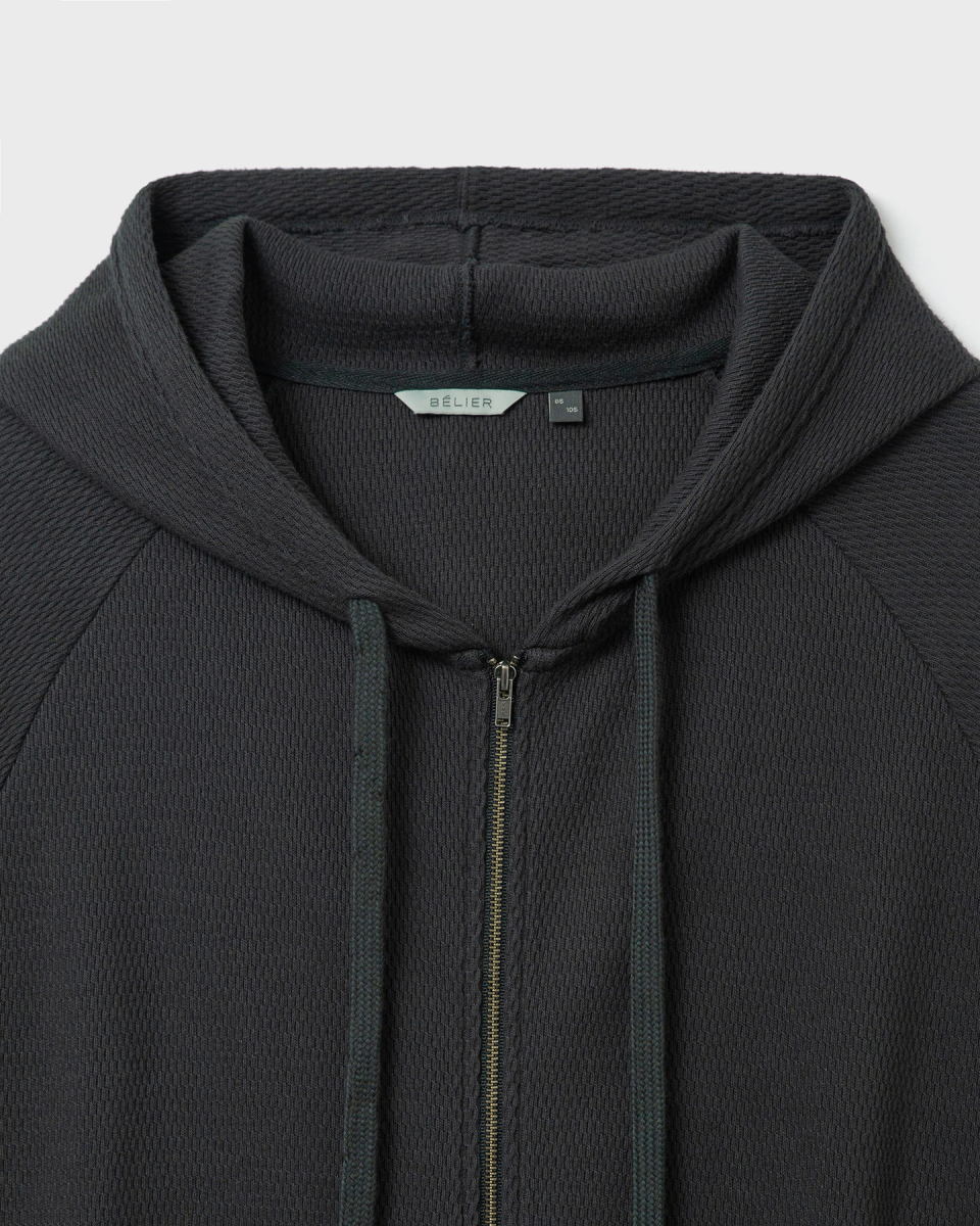 입체적인 텍스처의 와플 원단으로 완성한 크롭 후드 집업. 특유의 드라이한 착용감이 쾌적함을 제공하며, 경쾌하게 떨어지는 크롭 기장이 벨리에만의 정제된 도시적 실루엣을 강조하는 제품.