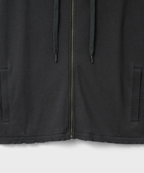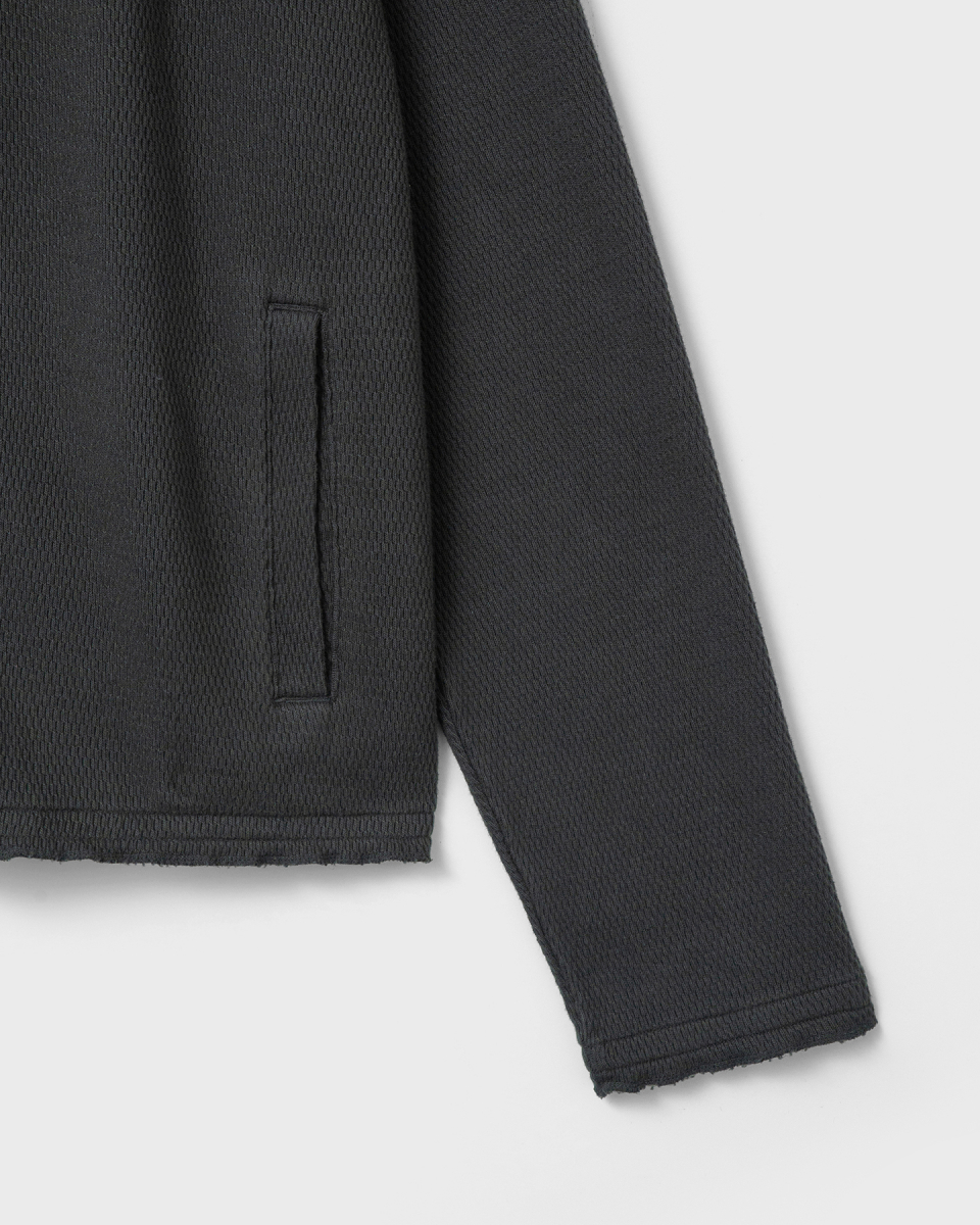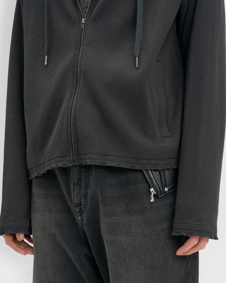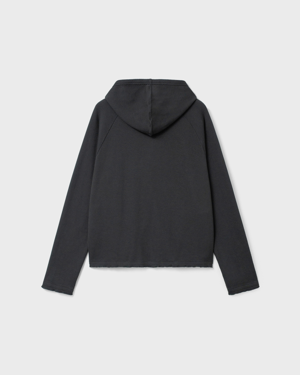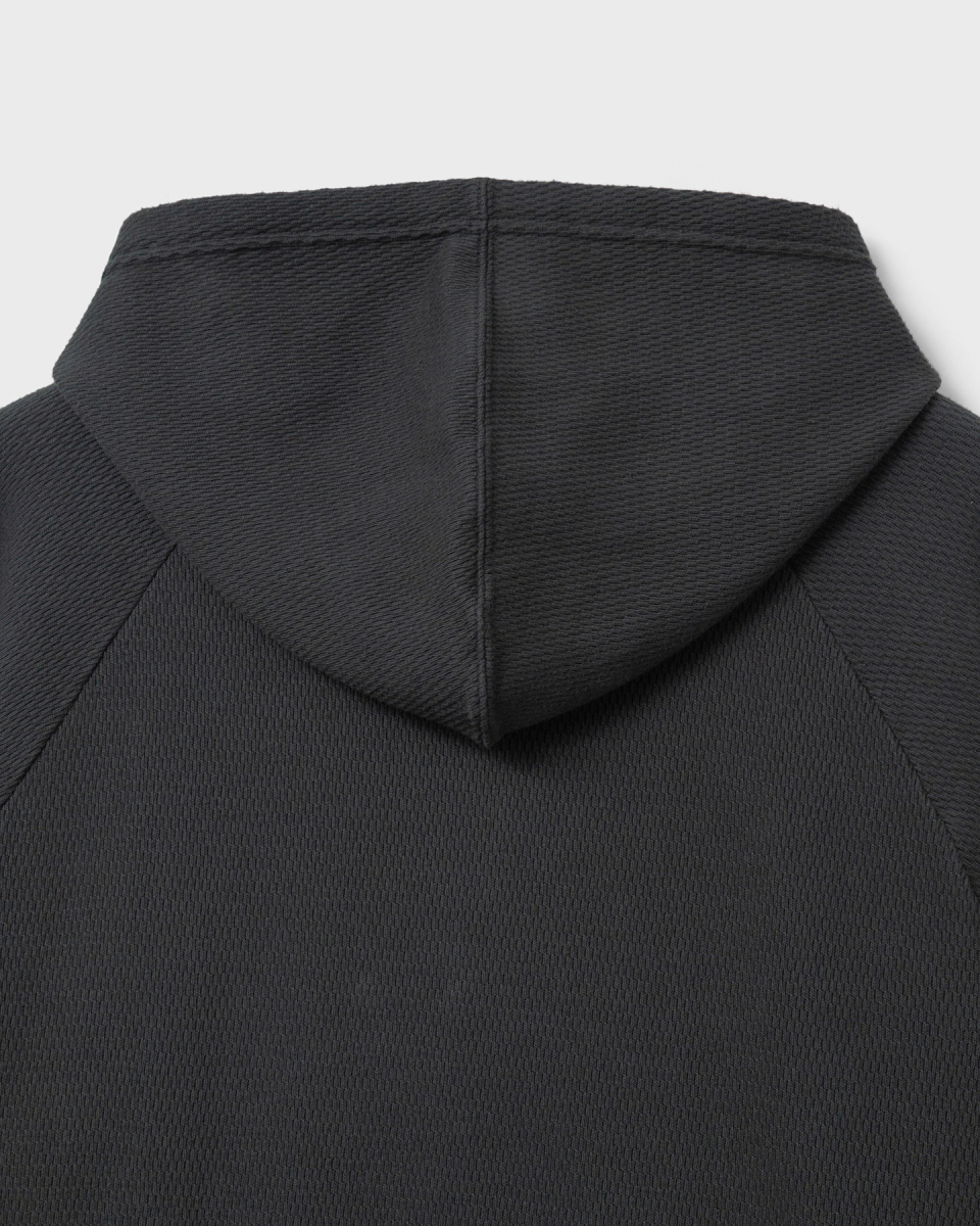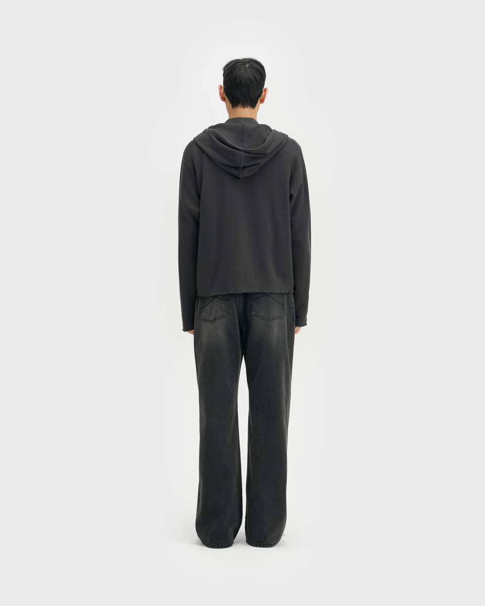 입체적인 텍스처의 와플 원단으로 완성한 크롭 후드 집업. 특유의 드라이한 착용감이 쾌적함을 제공하며, 경쾌하게 떨어지는 크롭 기장이 벨리에만의 정제된 도시적 실루엣을 강조하는 제품.