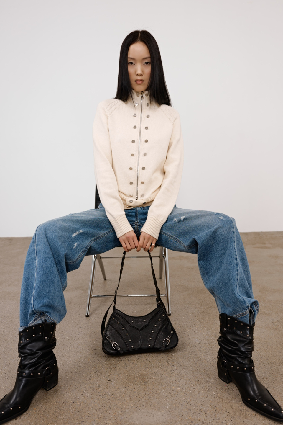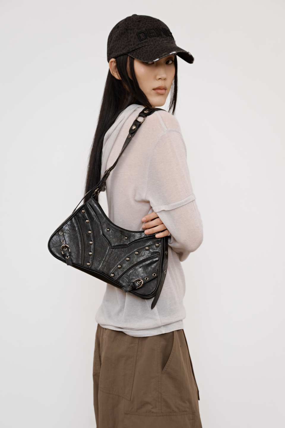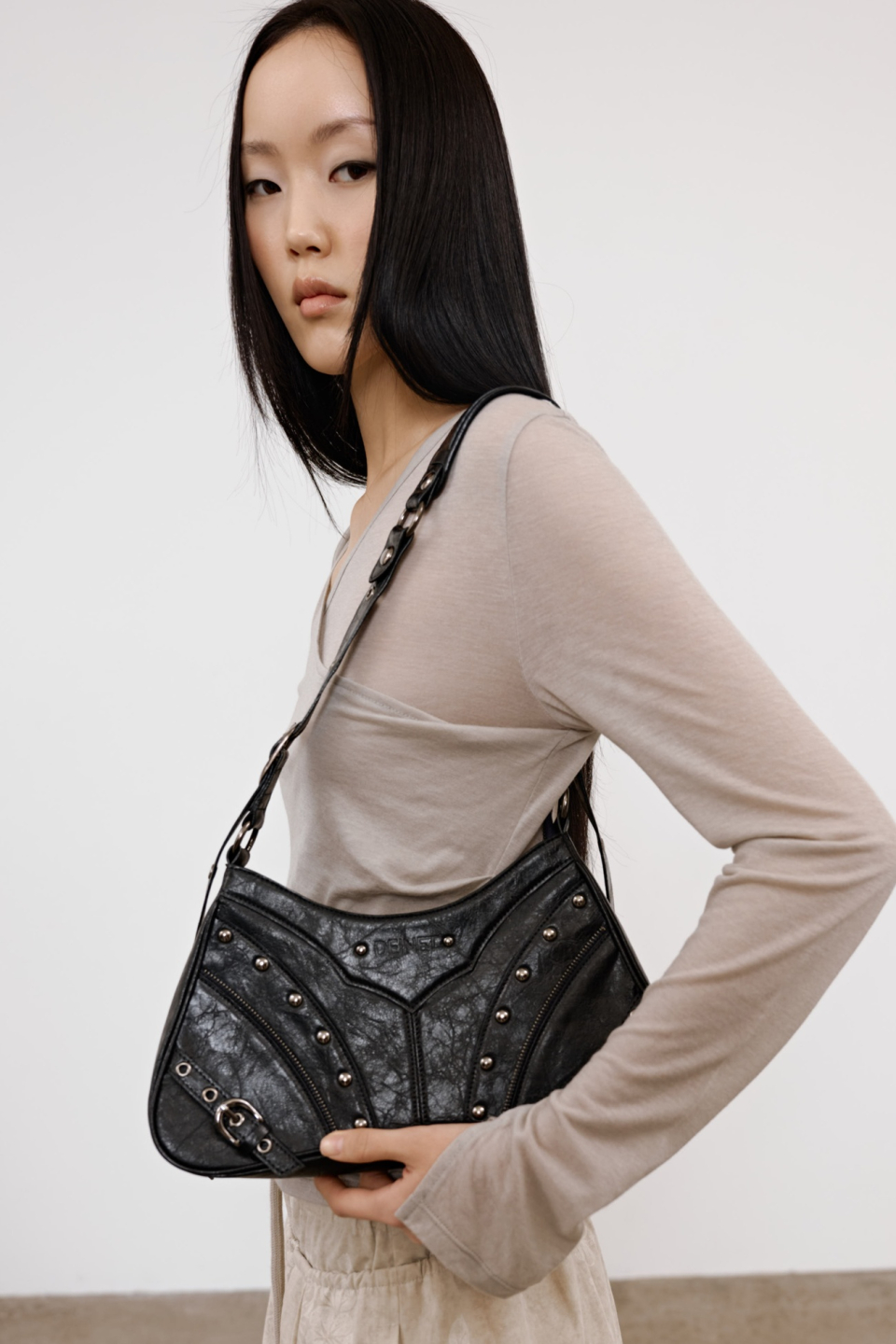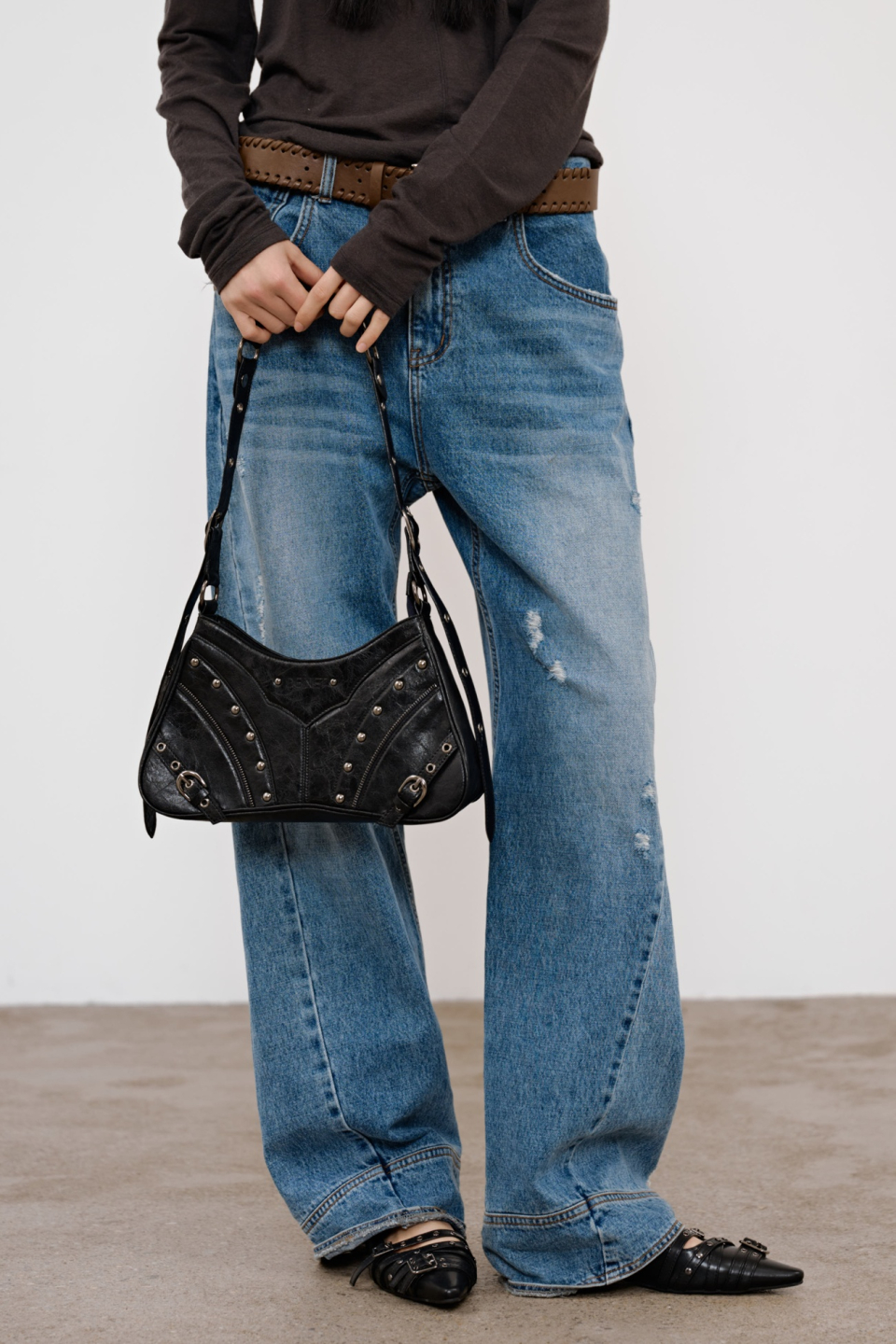 STUD ZIPPER POINT MINI SHOULDER BAG IN BLACK