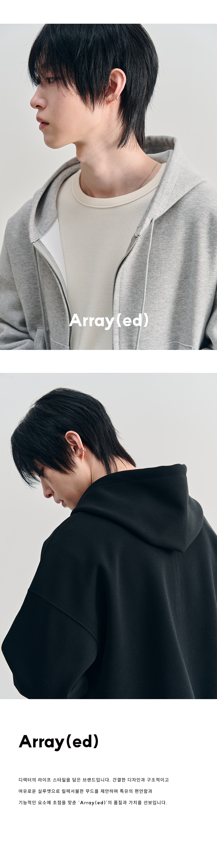 어레이드(ARRAYED)는 '특별히 멋진 옷을 입은'이라는 뜻을 기반으로 쉽게 접근할 수 있는 아이템을 재해석하여 실루엣과 디테일에 집중한 디자인을 중점적으로 전개합니다. 잘 만들어진 아이템 하나로 트렌디하고 패셔너블한 대상으로 보이게끔 하고자 합니다. 또한 '배열하다'라는 이중적 뜻을 담아 의류에만 국한된 브랜드가 아닌 라이프스타일과 뷰티 아이템 등 다양한 각도에서 모습을 보여주고자 합니다.