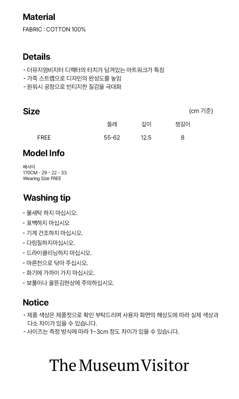더뮤지엄비지터(THE MUSEUM VISITOR)는 2016년 디렉터 박문수의 독일 베를린 여정에서부터 시작된 브랜드입니다. 거리와 사람들에게서 느낀 자유와 사랑, 행복, 예술이 담긴 도시에서 받은 영감을 많은 이들에게 전하고자 합니다. 주로 꽃과 하트, 자연, 아이들이 디자인적 요소로 나타나며, 수작업이 가미된 차별적인 디자인 덕에 많은 마니아층의 사랑을 받고 있습니다.