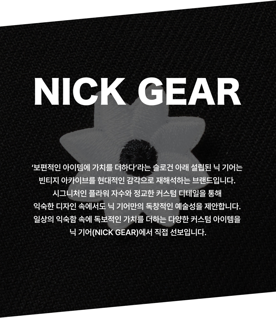 닉 기어(NICK GEAR)는 빈티지 아카이브를 현대적으로 재해석해 플라워 자수와 정교한 커스텀 디테일로 보편적인 아이템에 독창적 가치를 더하는 브랜드입니다.