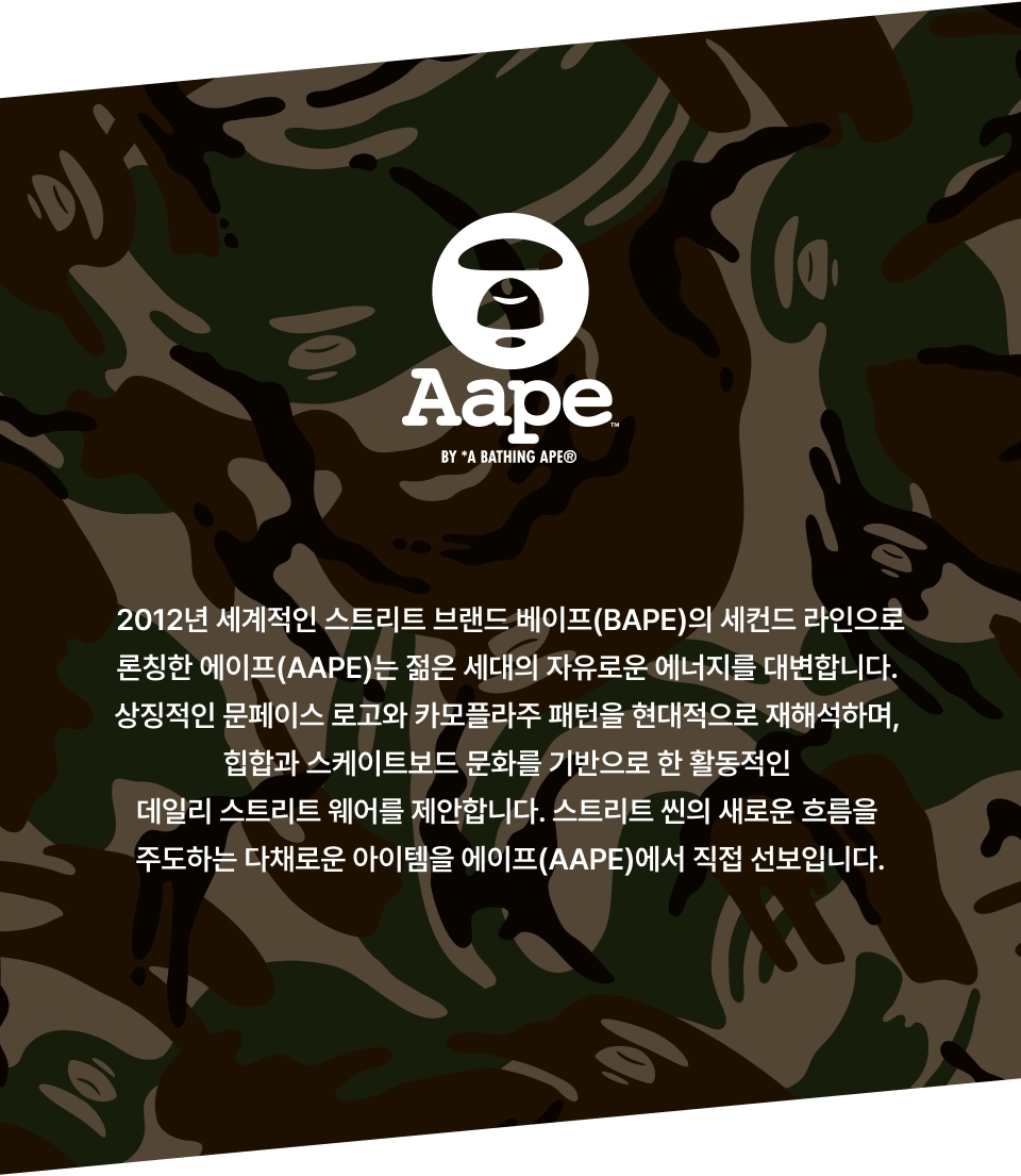 에이프(AAPE)는 문페이스 로고와 카모플라주 패턴을 현대적으로 풀어내며 젊고 활동적인 스트리트 감성을 제안하는 브랜드입니다.