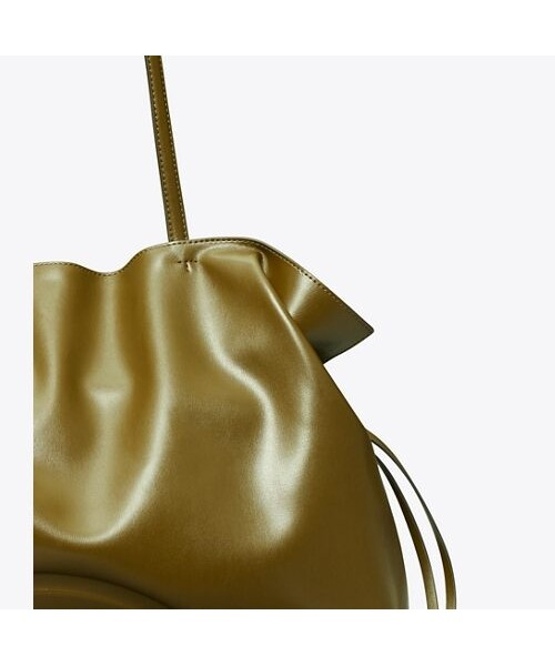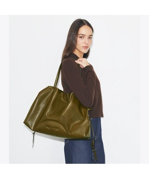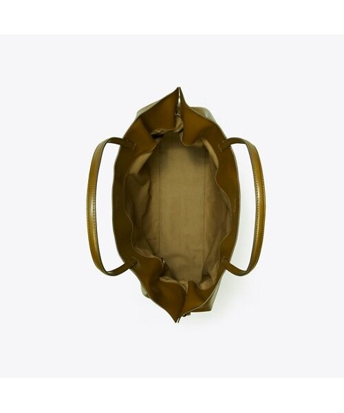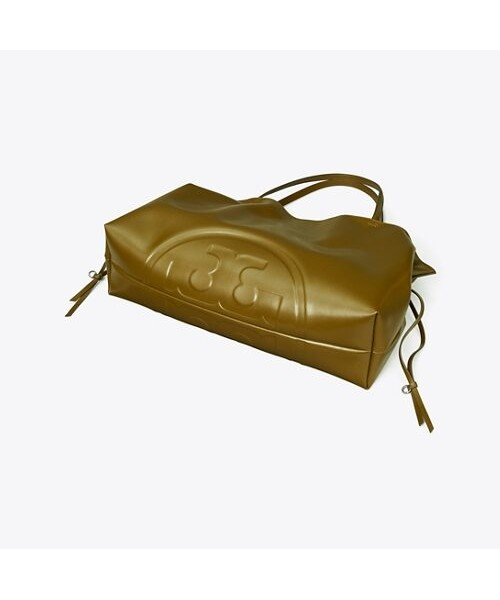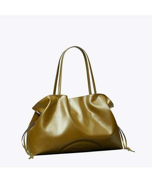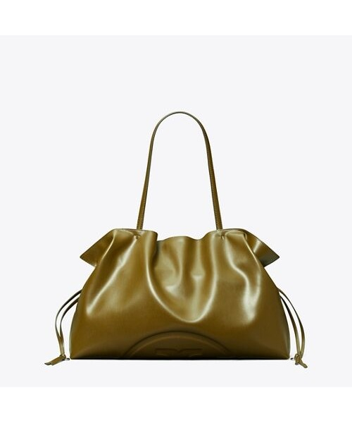 이번 시즌 새롭게 선보이는 엘라 리사이클 드로우스트링 토트입니다. 리사이클 소재로 제작되었으며 드로우스트링 조임 정도에 따라 다양한 실루엣으로 연출되는 쉐입이 멋스럽습니다. 빅백 사이즈로 제작되어 뛰어난 수납력에도, 굉장히 가벼운 무게감이 장점인 아이템입니다. 바닥에 새겨진 토리버치 로고로 포인트를 더했습니다.