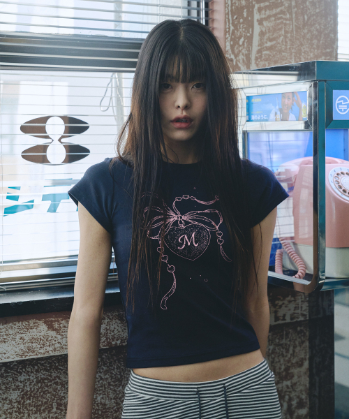 M 하트 팬던트 반팔 티셔츠 네이비