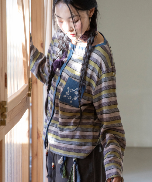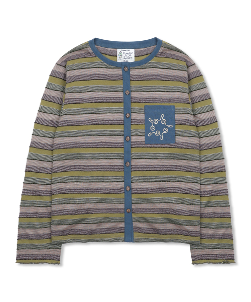 WXJ038 유야케 스트라이프 배색 가디건 (KHAKI)