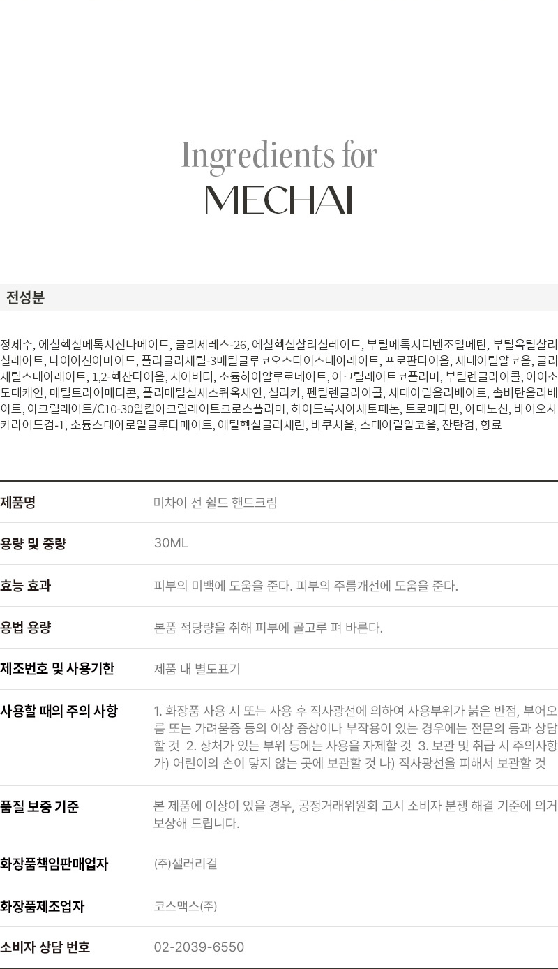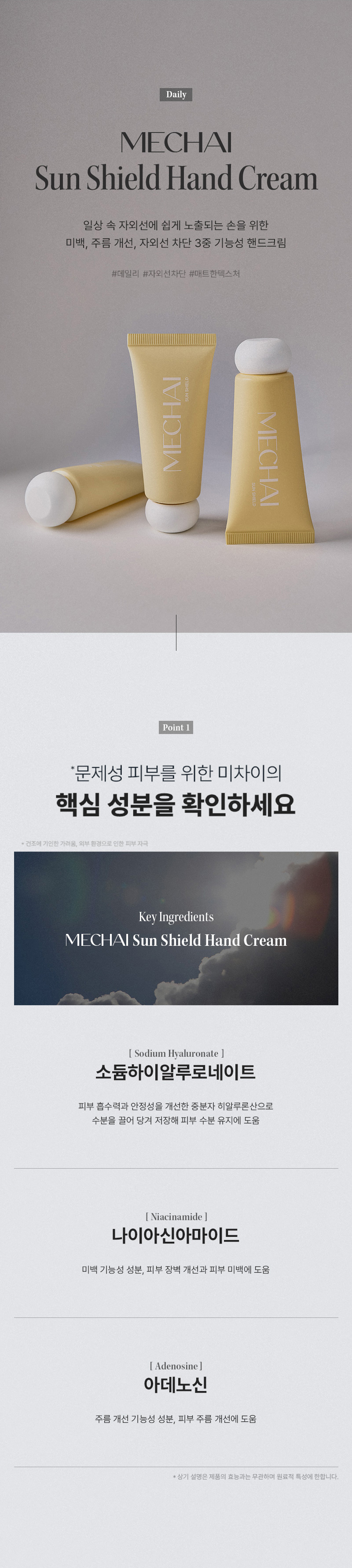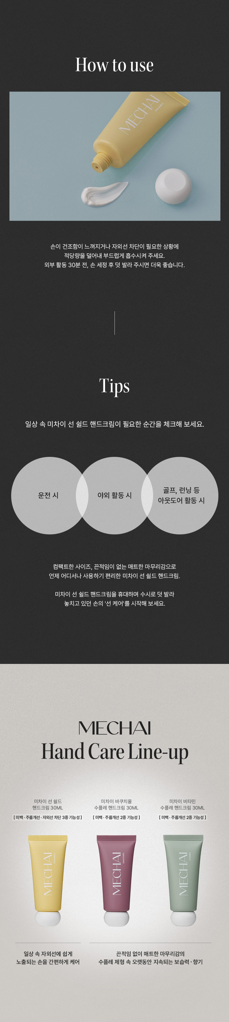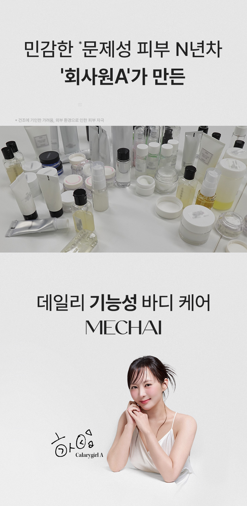 미차이(MECHAI)는 문제성 피부를 위한 바디 케어 브랜드입니다. 고기능, 고효능의 원료에 감각적인 즐거움을 더함은 물론 문제성 피부를 효과적으로 솔루션하기 위한 방법과 루틴을 제안하기 위해 끊임없이 연구하고 고민합니다.
