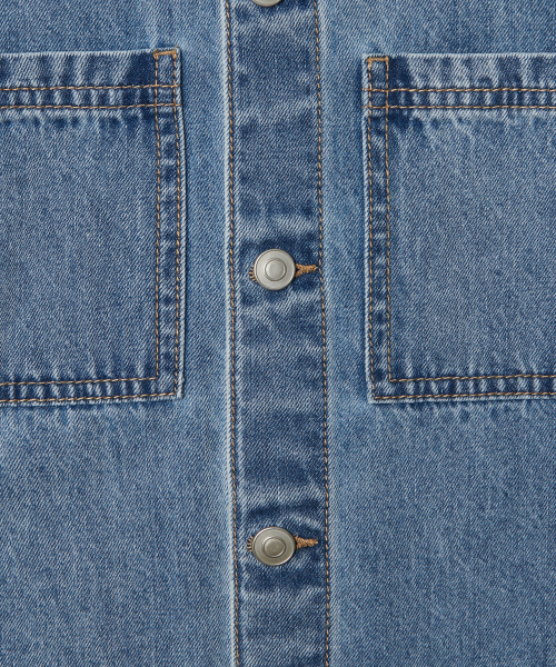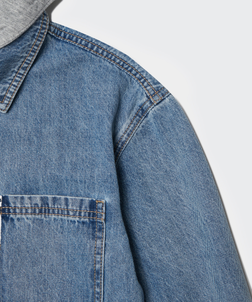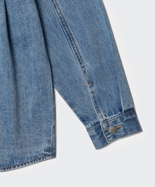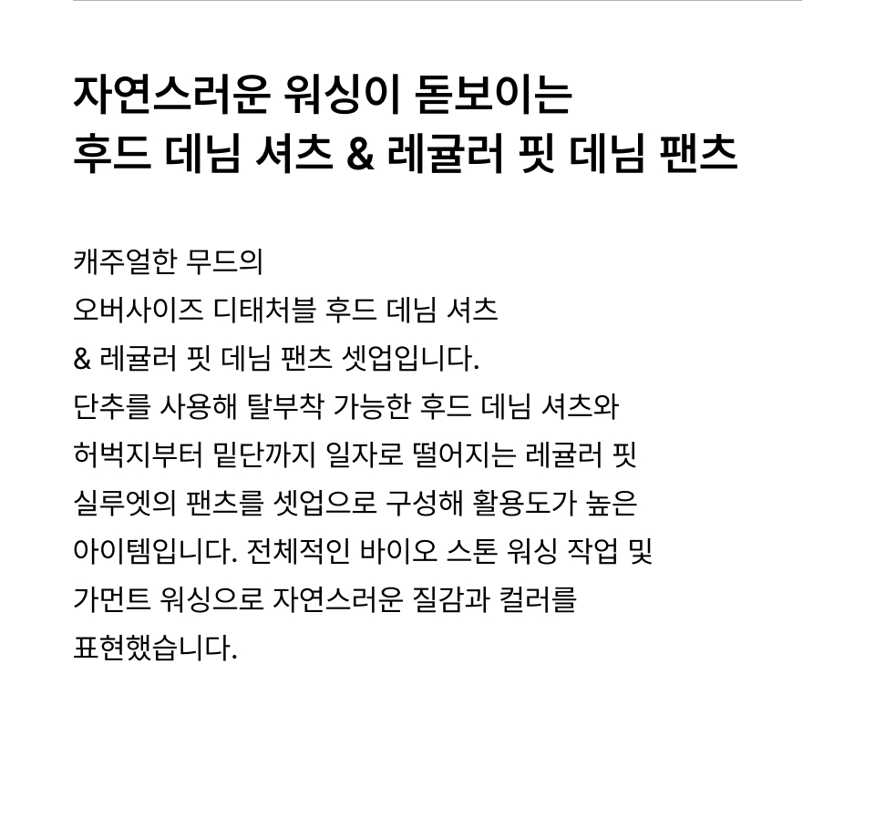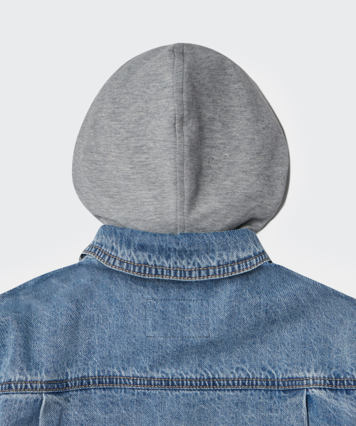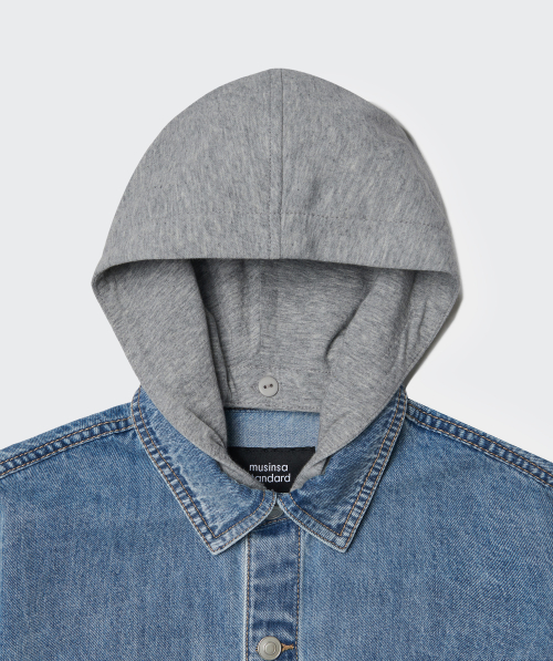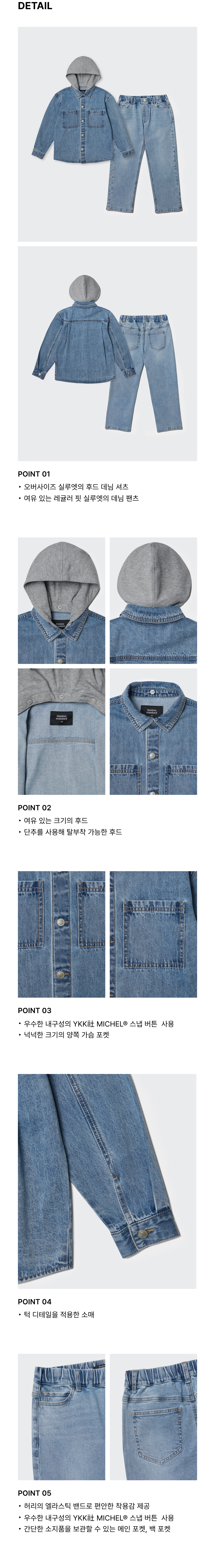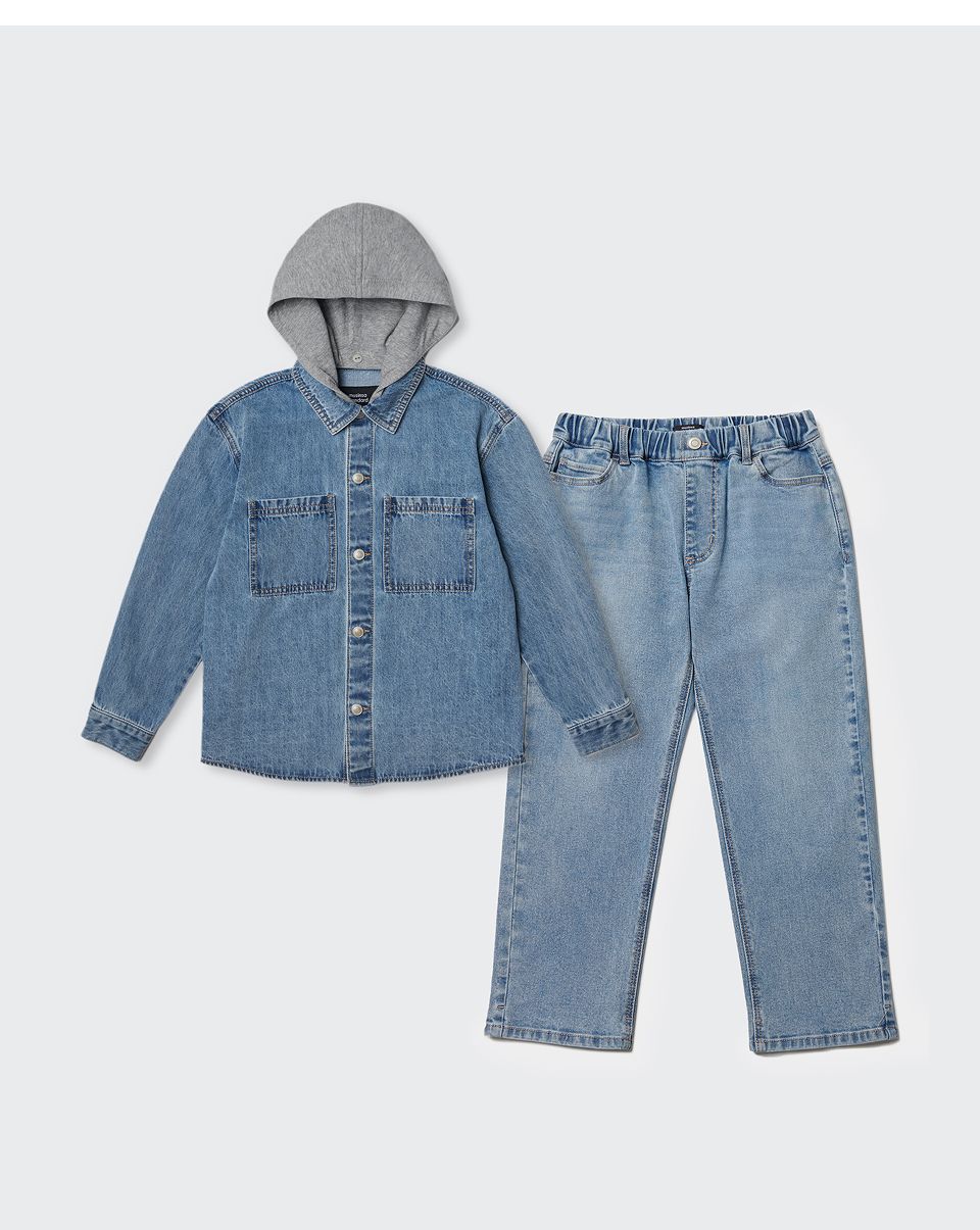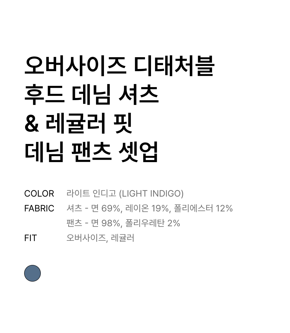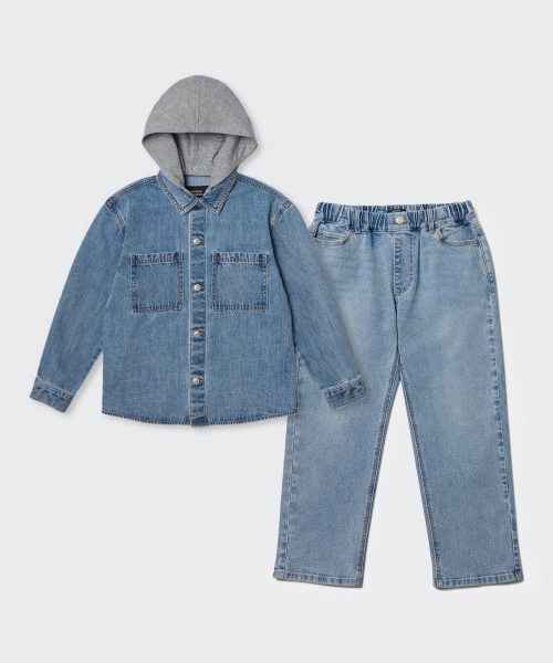 오버사이즈 디태처블 후드 데님 셔츠 & 레귤러 핏 데님 팬츠 셋업 [라이트 인디고]