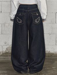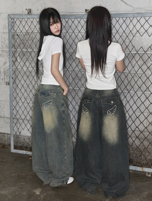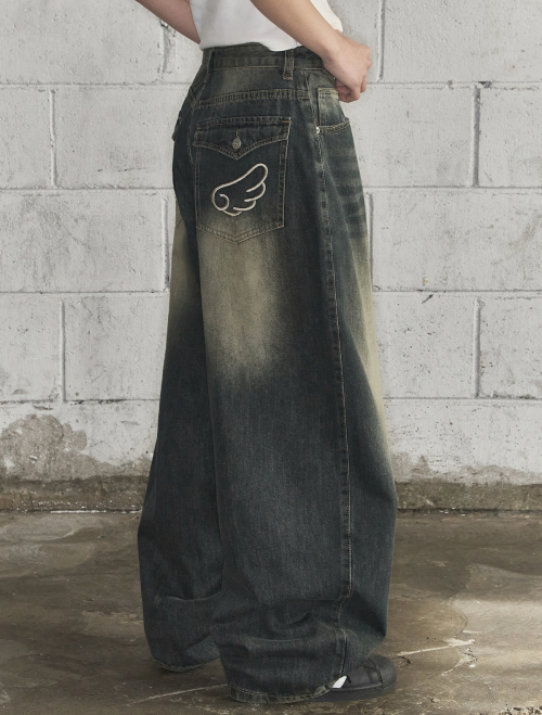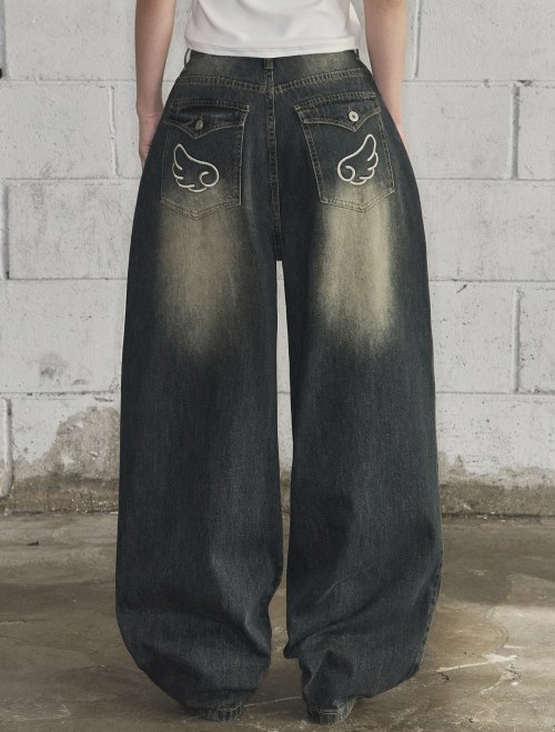 엔젤 윙 워싱 백포켓 벌룬 와이드 데님 팬츠 빈티지진청