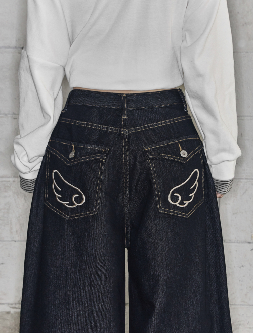 엔젤 윙 워싱 백포켓 벌룬 와이드 데님 팬츠 흑청