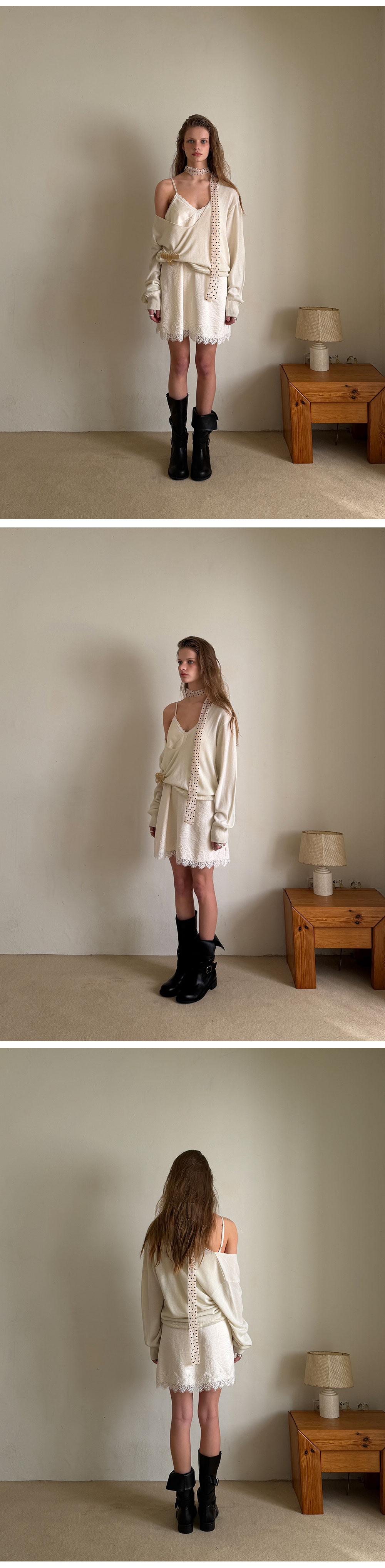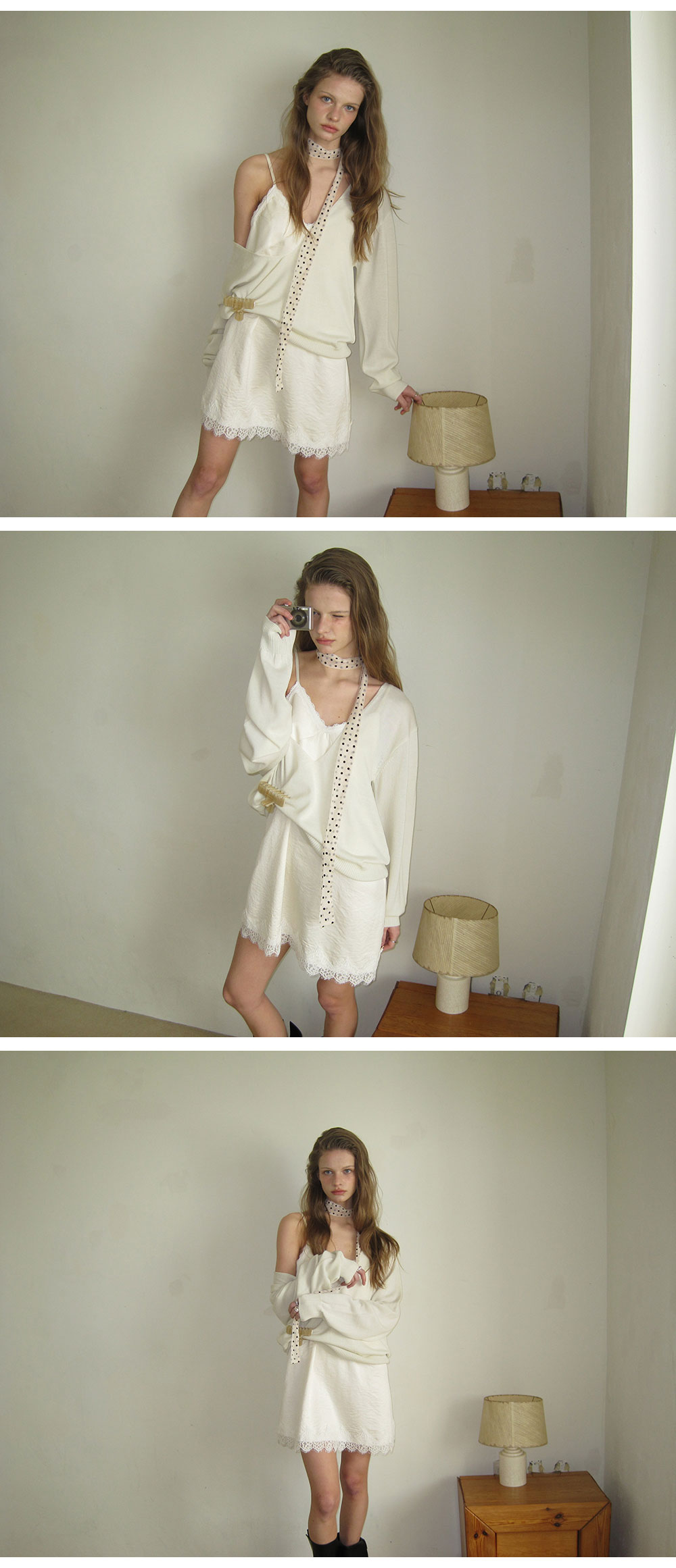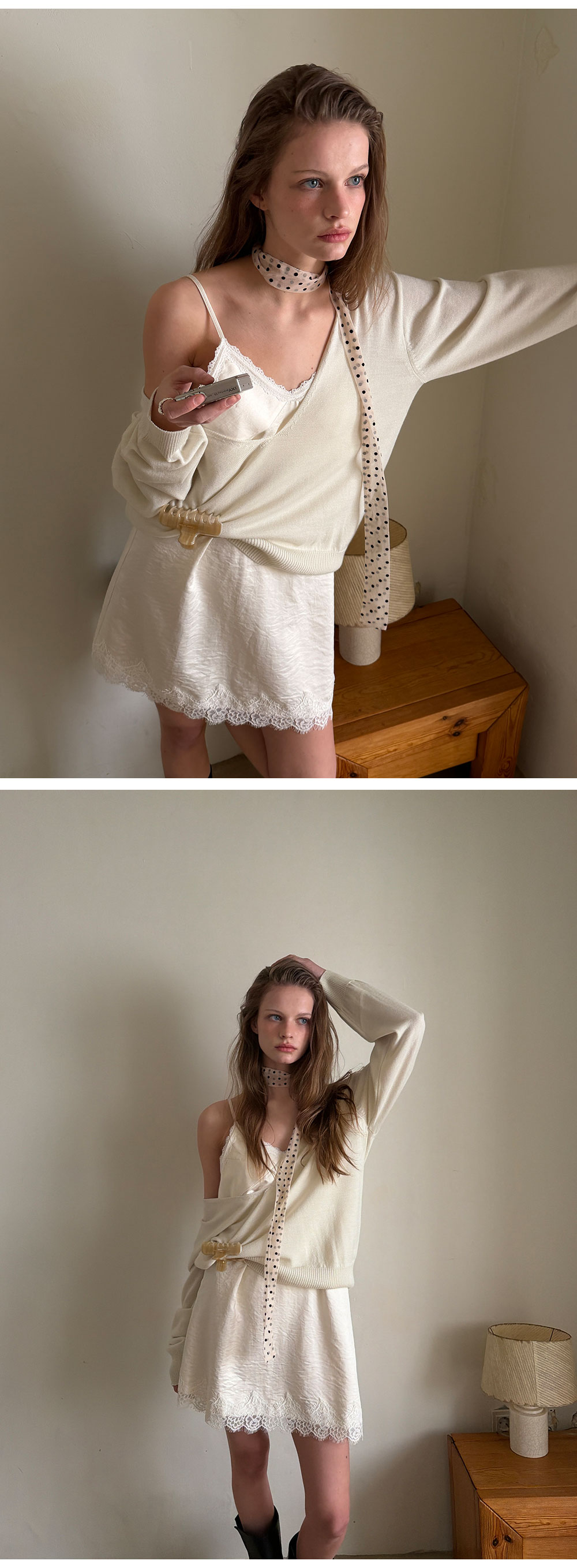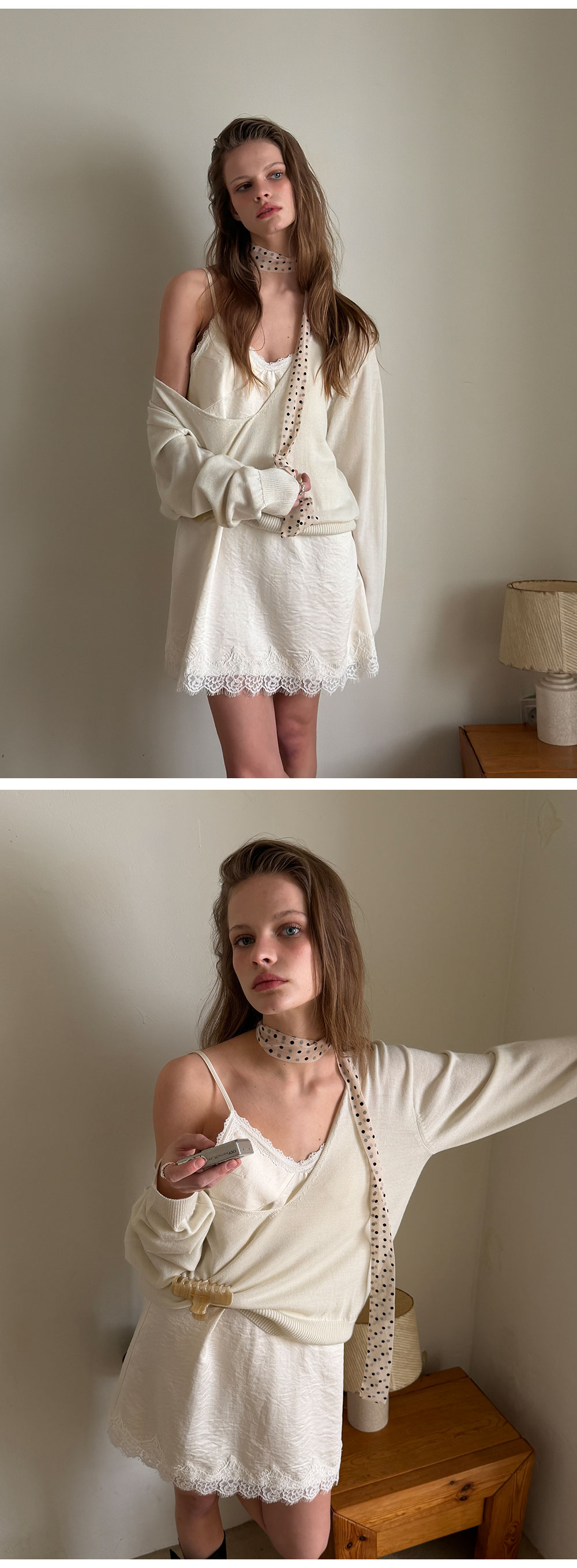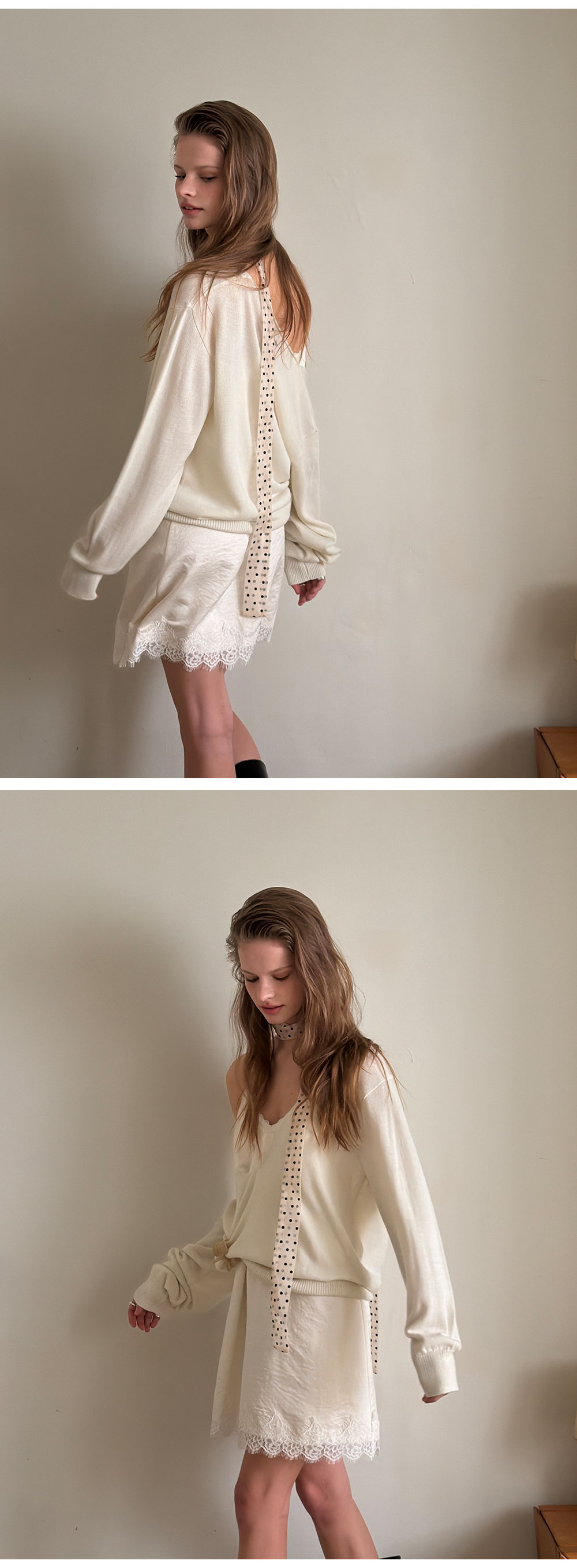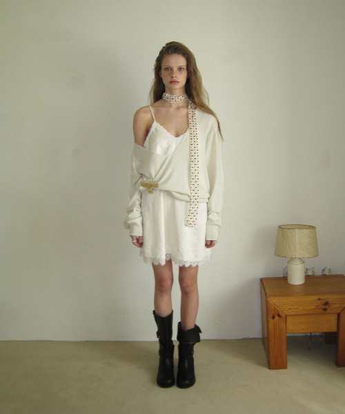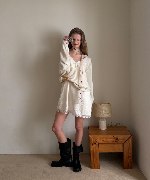 - 넥 라인과 밑단에 더해진 레이스 디테일로 페미닌한 포인트