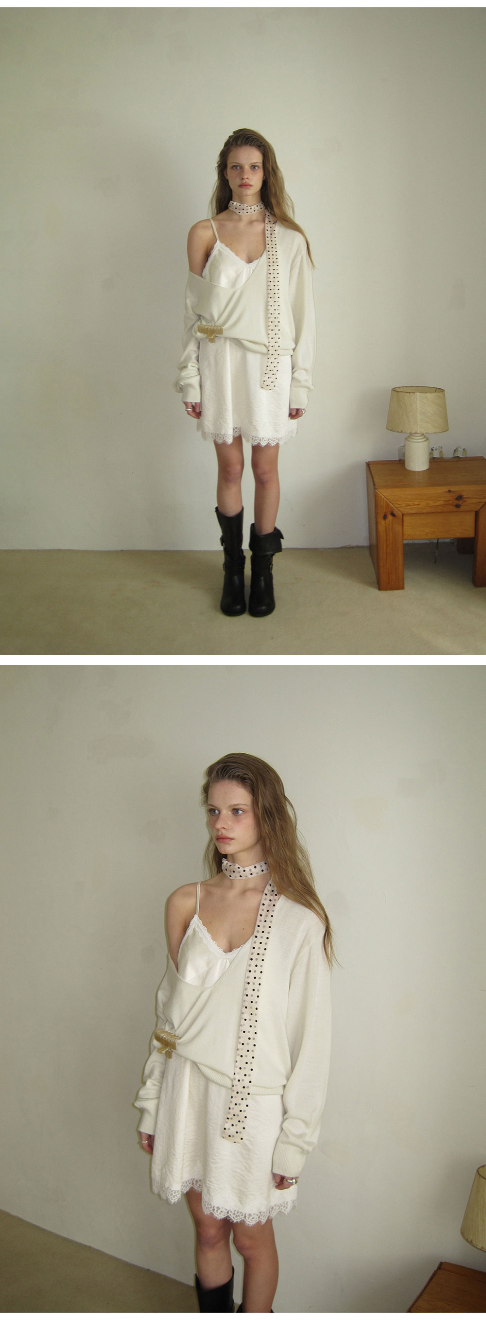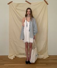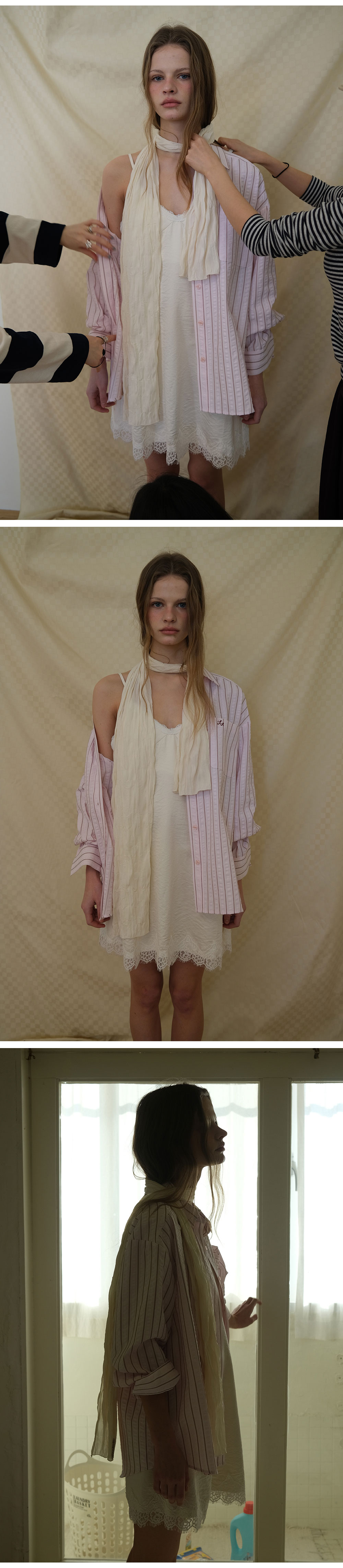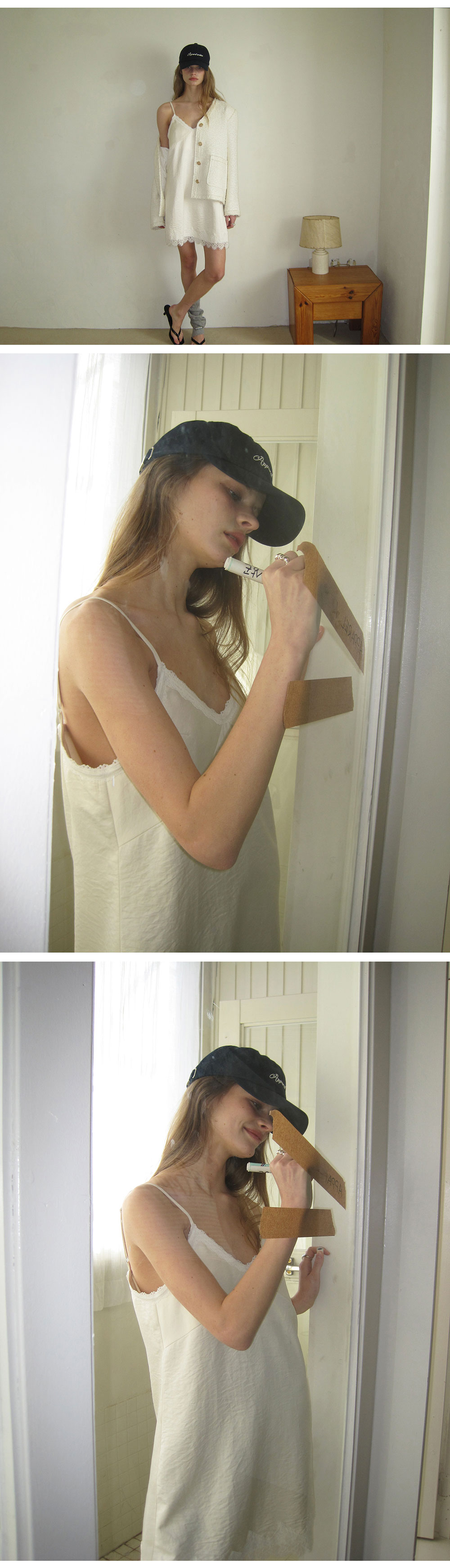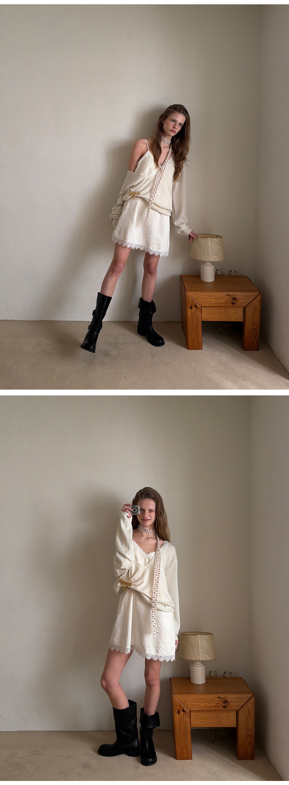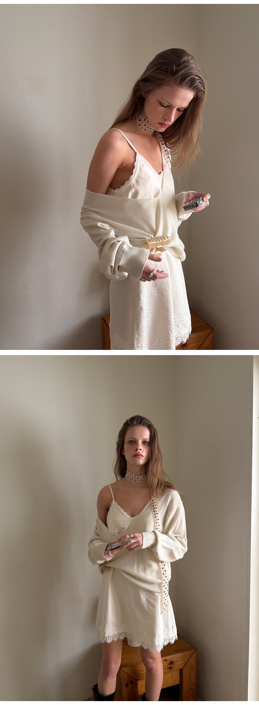 - 넥 라인과 밑단에 더해진 레이스 디테일로 페미닌한 포인트