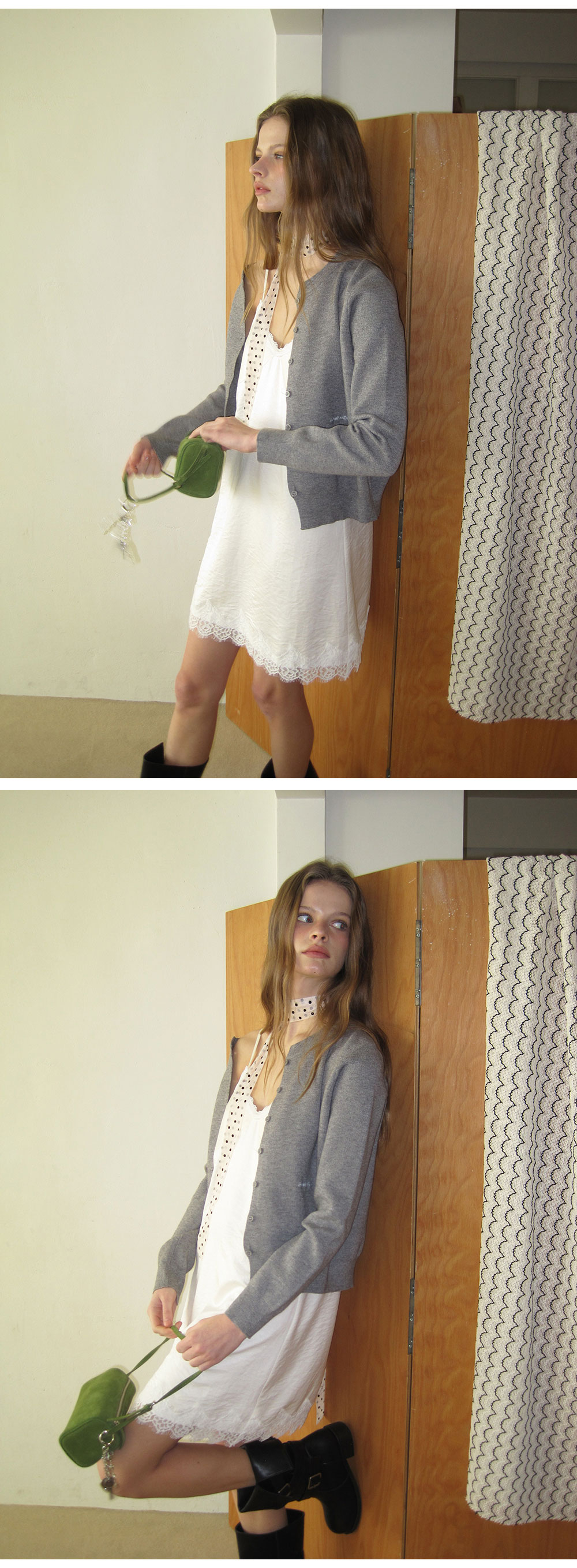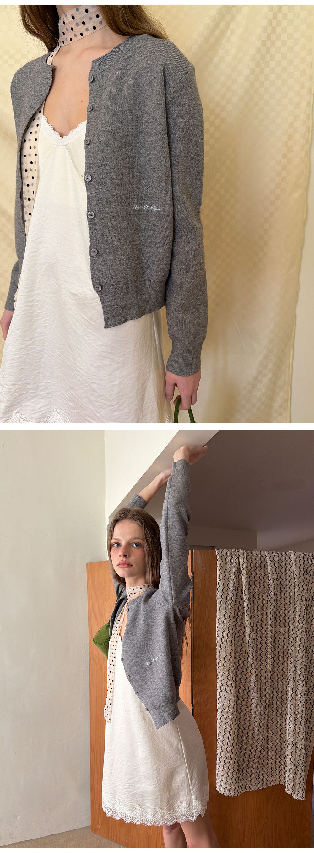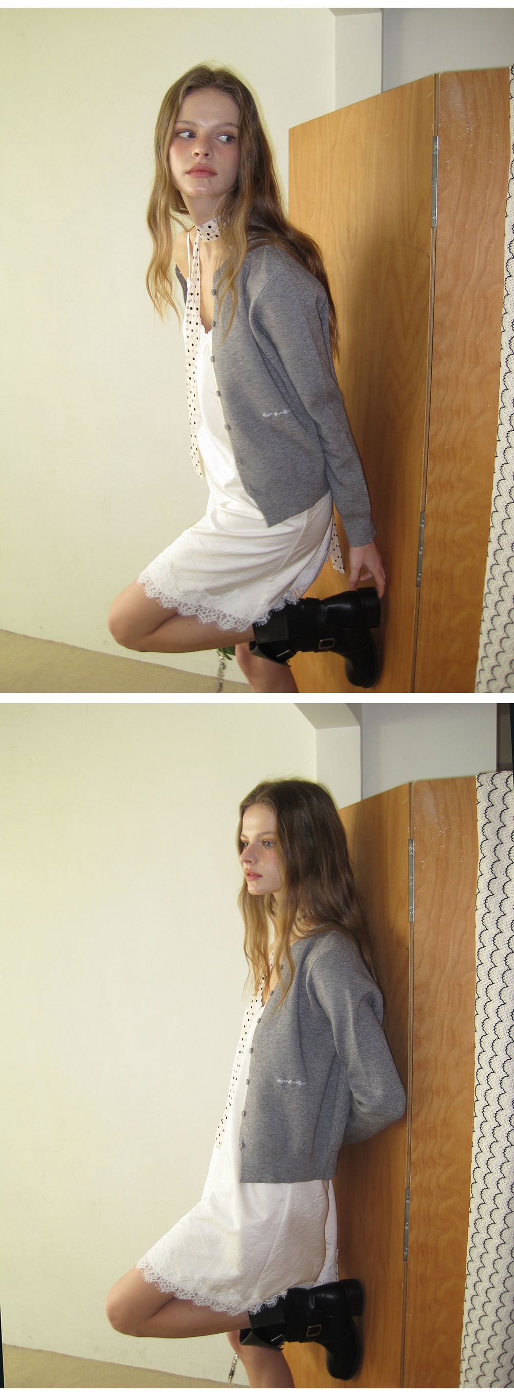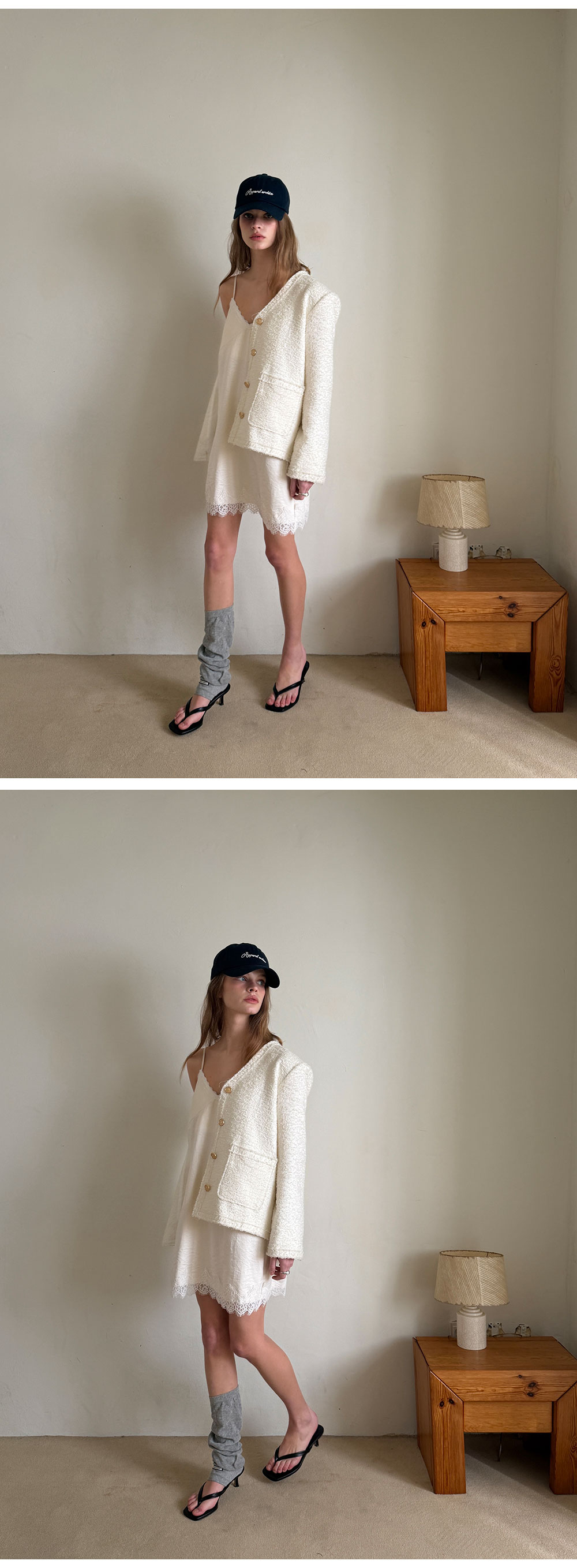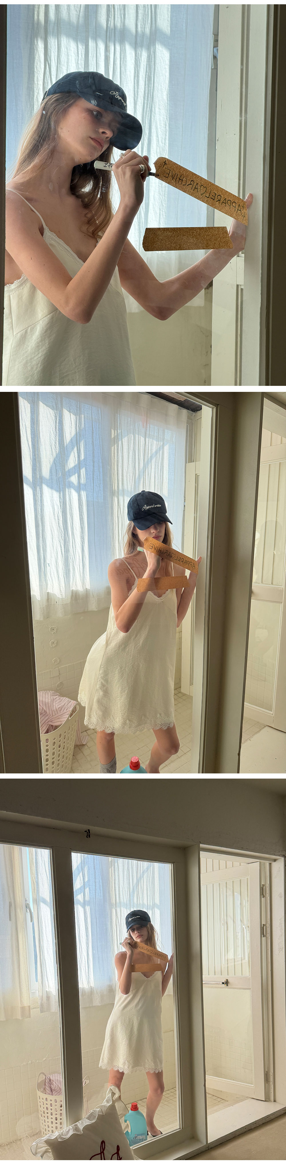 - 넥 라인과 밑단에 더해진 레이스 디테일로 페미닌한 포인트