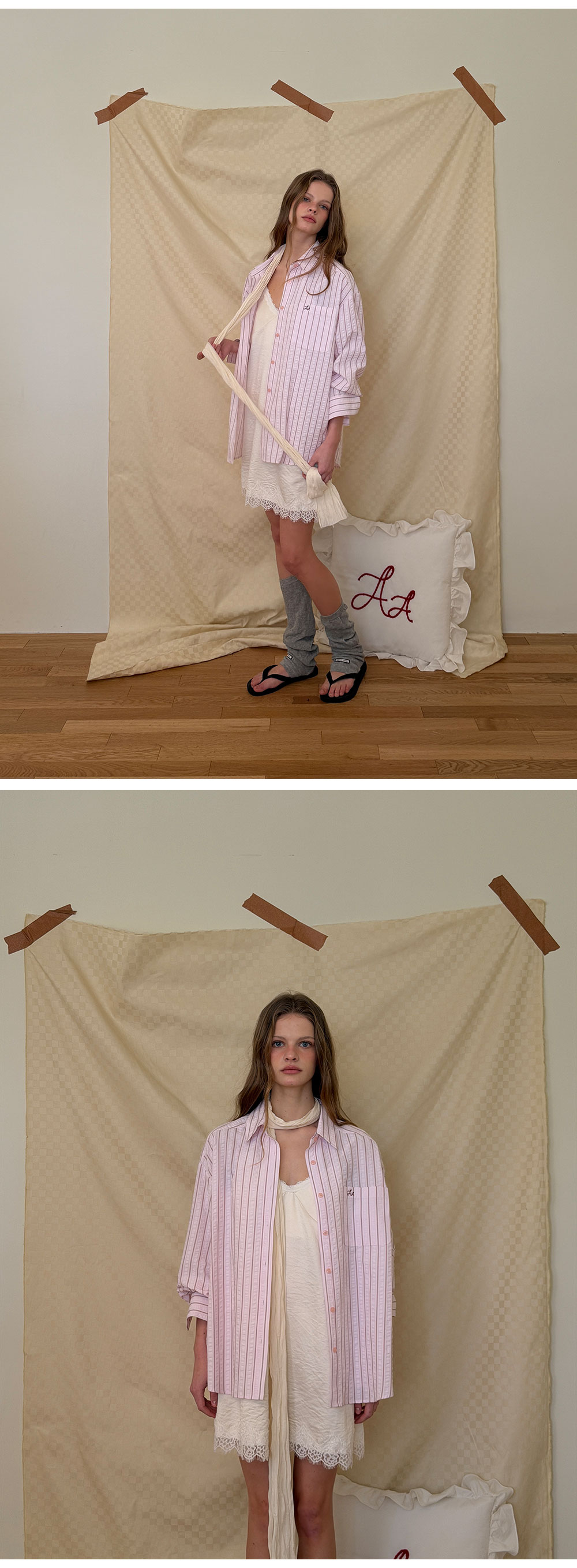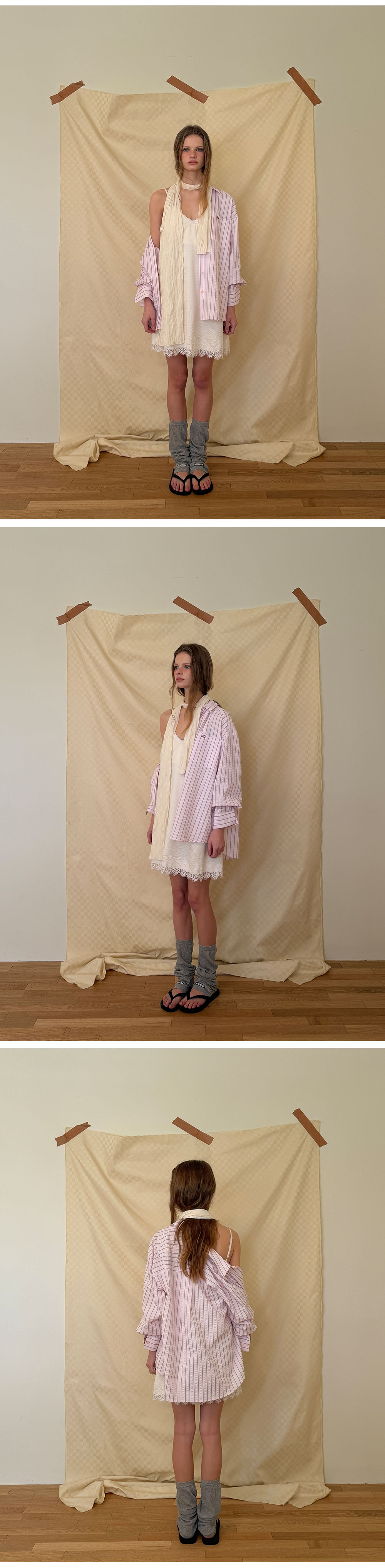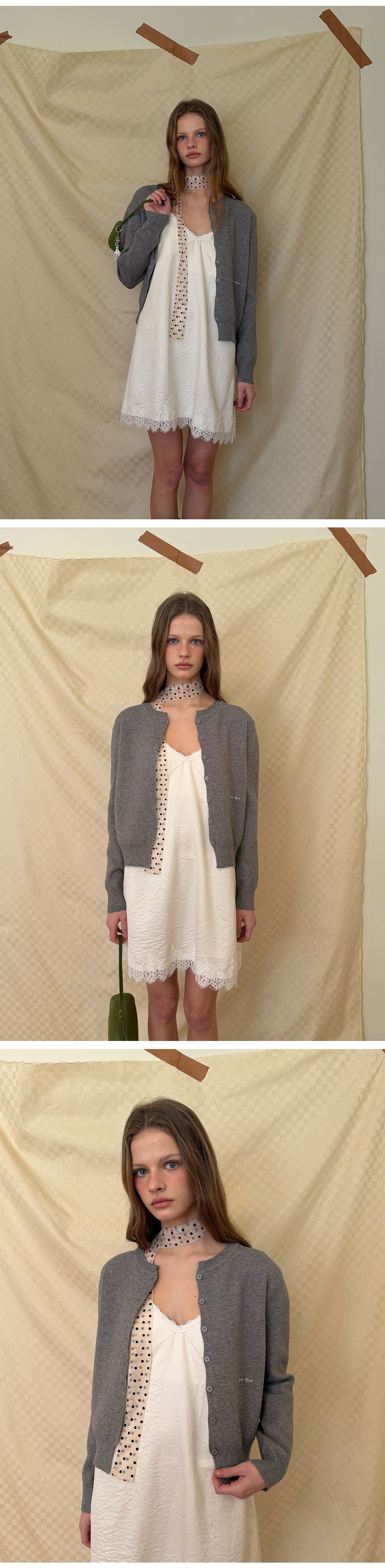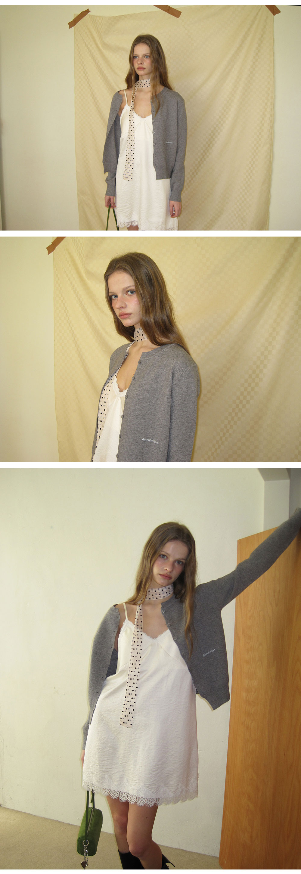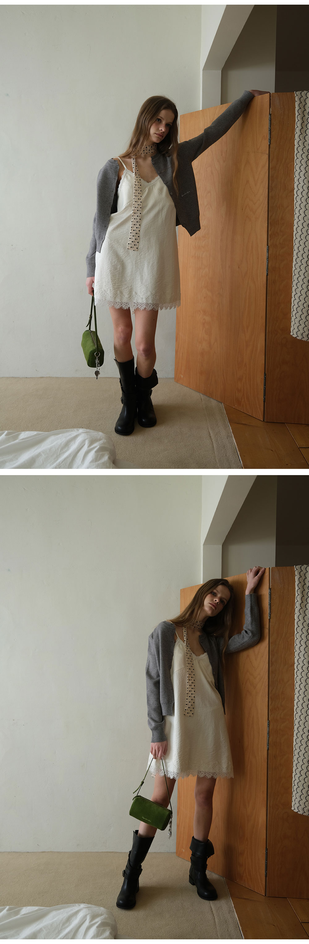 - 넥 라인과 밑단에 더해진 레이스 디테일로 페미닌한 포인트