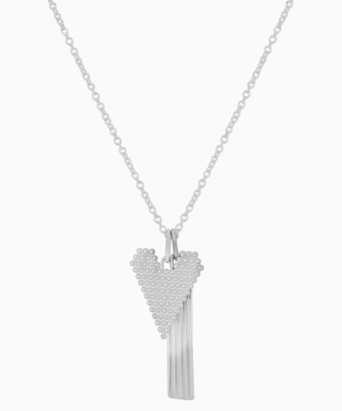 길이 조절 가능한 롱 네크리스. 파티클 하트 팬던트와 슬레이트 팬던트.