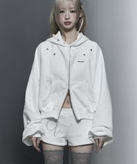 Hotfix Detail Cropped Two-Way Zip Hoodie (White)