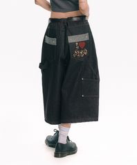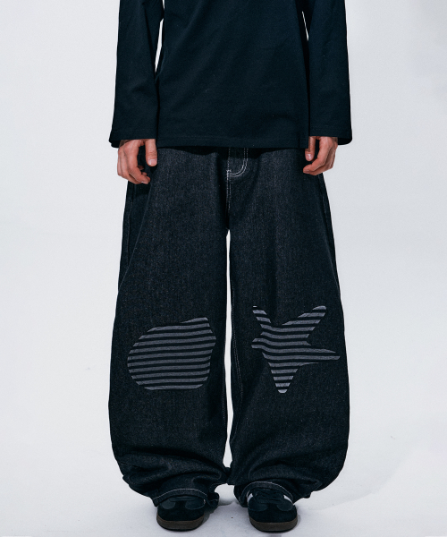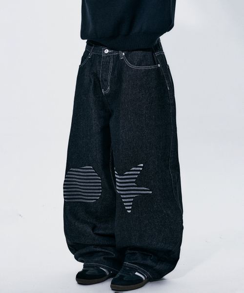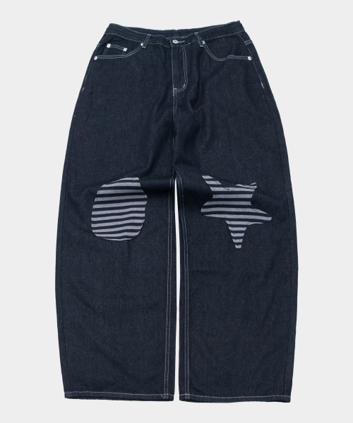스트라이프 스타 서클 패치 아플리케 와이드 생지 데님 팬츠 [진청]