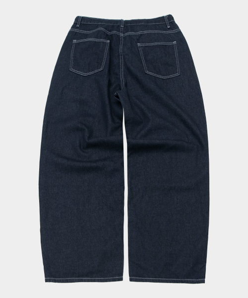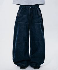 베이직 체크 배색 포켓 포인트 셀비지 워싱 와이드 데님 팬츠 [진청]