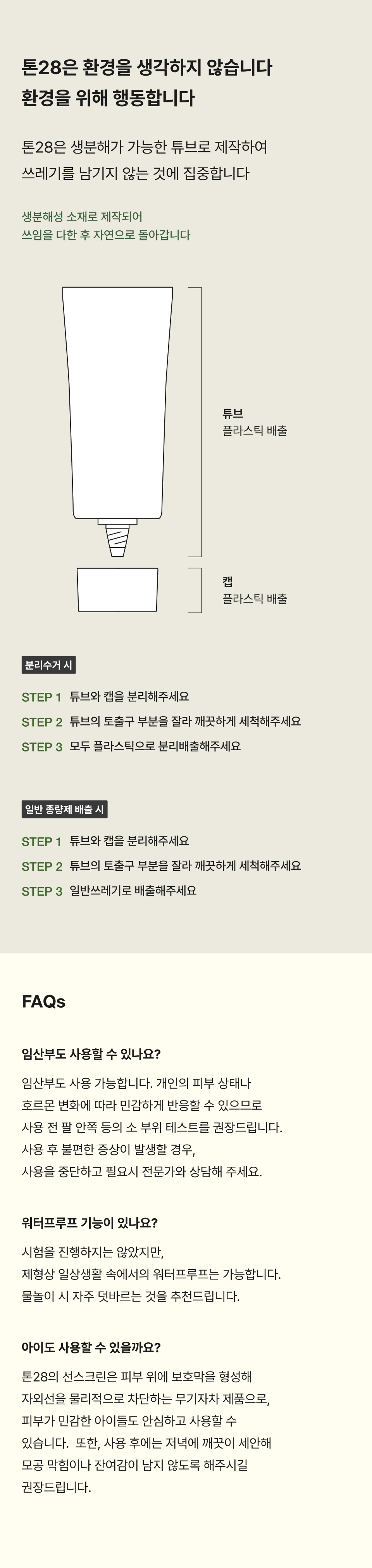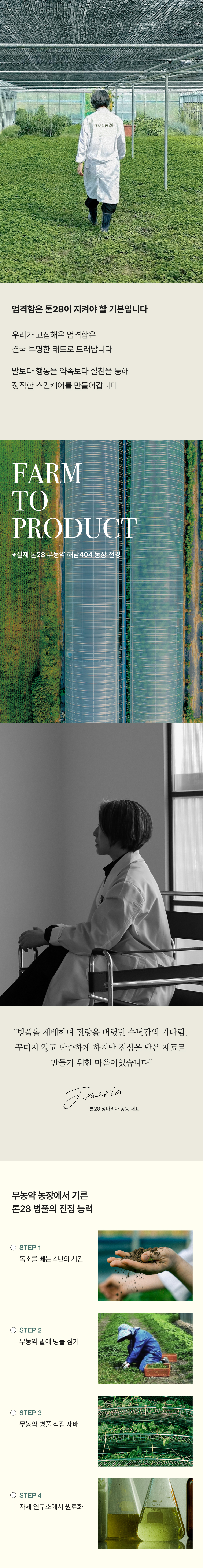 톤28(TOUN28)은 화장품의 성분은 안정적으로 지키면서도 플라스틱 사용량을 줄여 환경에 무해한 종이 패키지를 만드는 데 성공하였습니다. 마케팅 위주가 아닌, 성분 90%와 용기 10%라는 원칙을 정직하게 지켜나가며 오직 격이 다른 성분의 화장품을 빚어내고 있습니다. 톤28은 사람과 자연 모두에게 유익하고 건강한 아름다움을 전하기 위해 행동합니다.