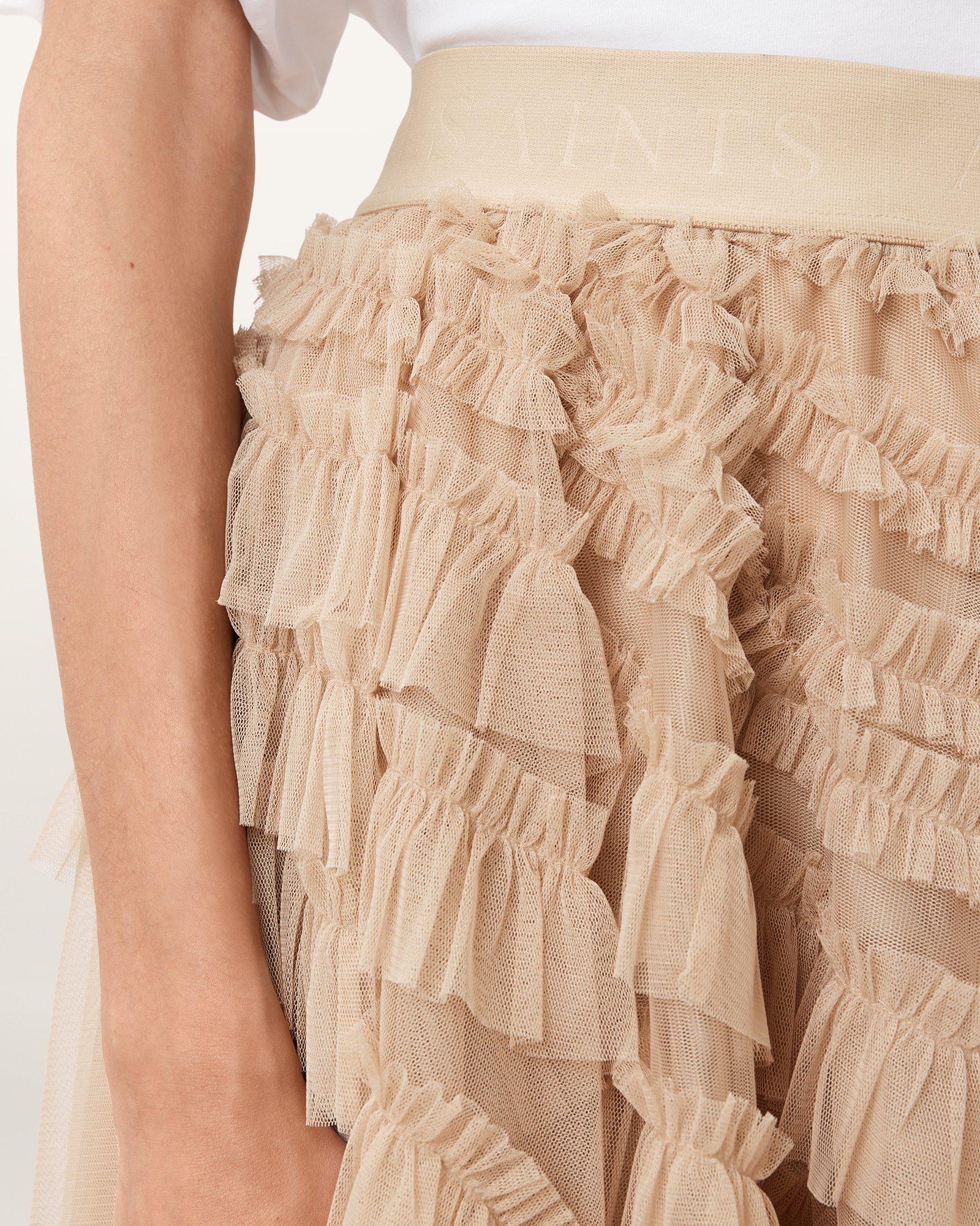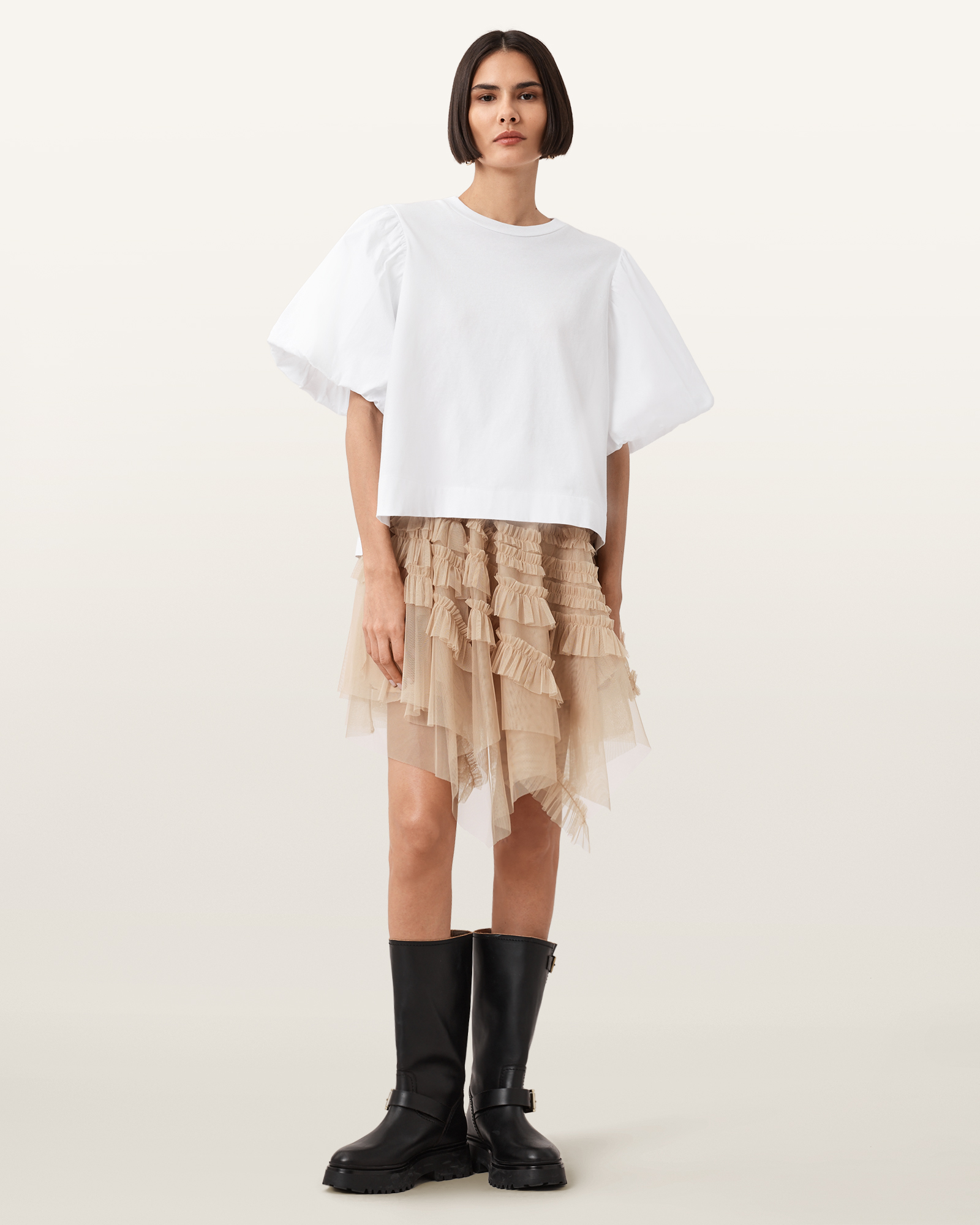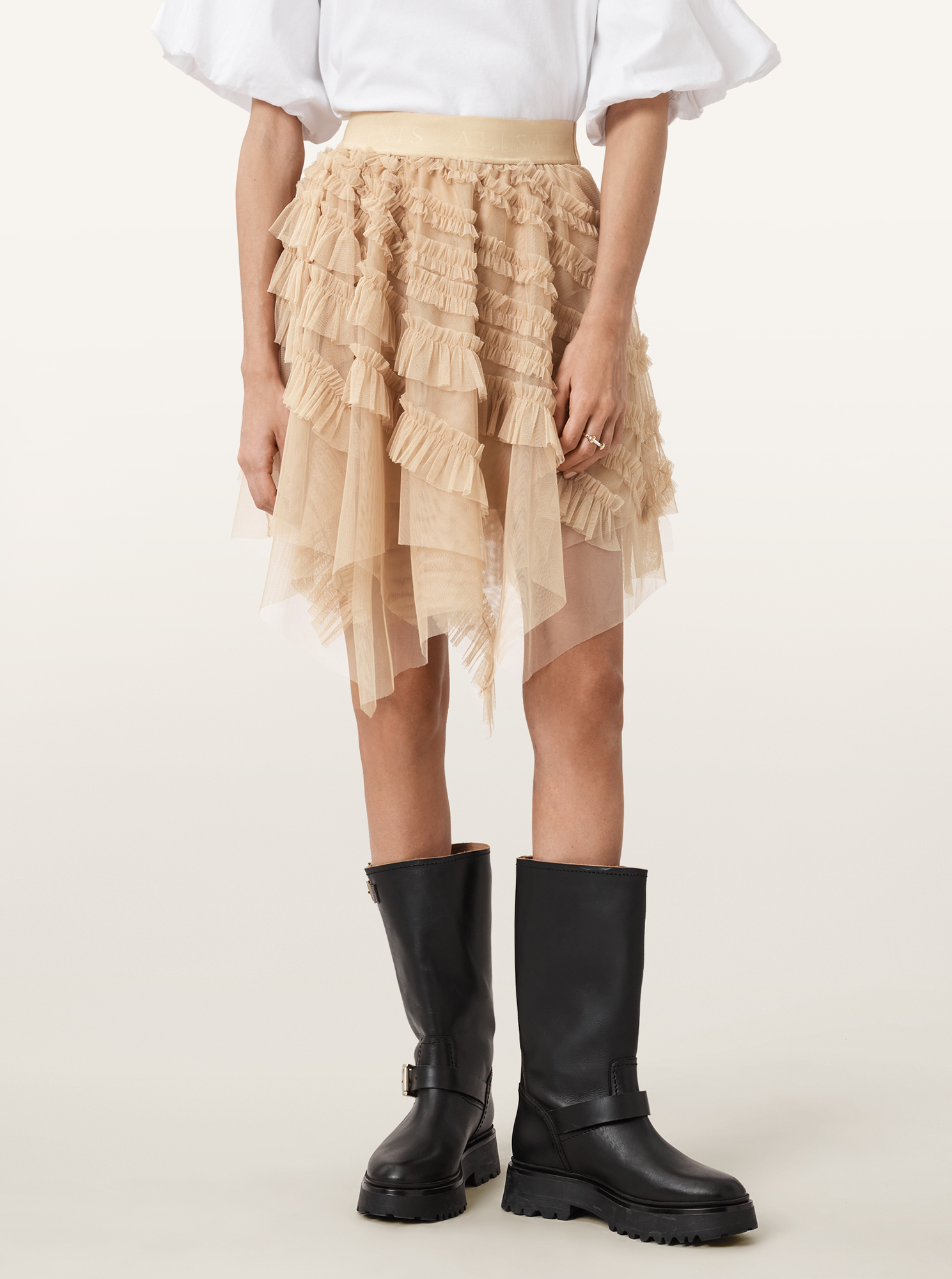 가벼운 인조 소재로 제작되었으며, 여러 겹의 튤 레이어와 비대칭 밑단이 어우러져 구조적인 실루엣을 완성합니다. 감각적인 디테일로 스타일에 강렬한 존재감을 더해주는 아이템입니다.