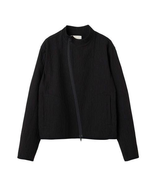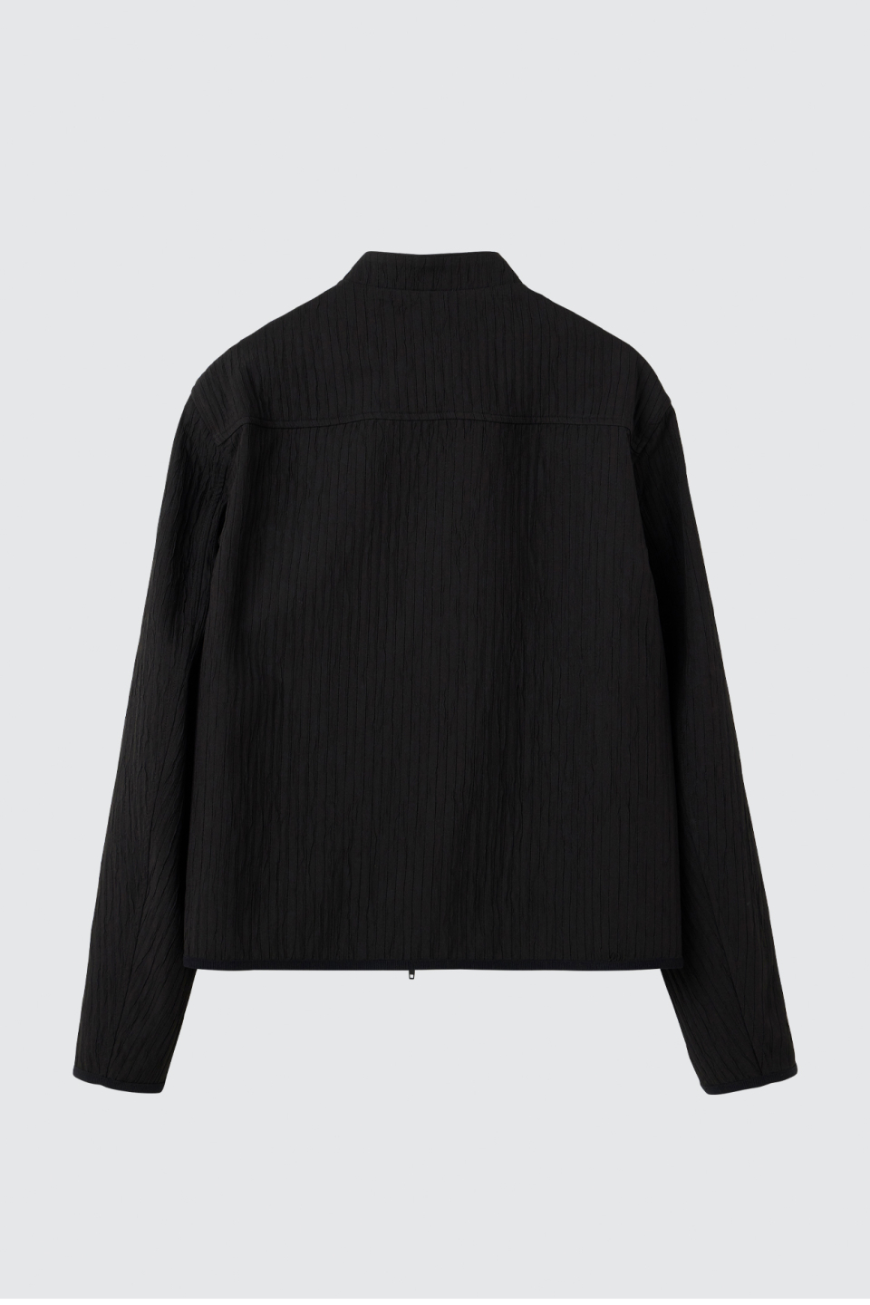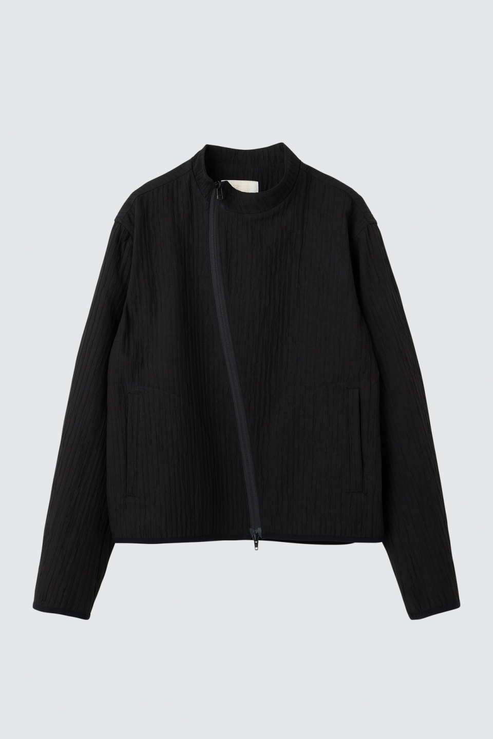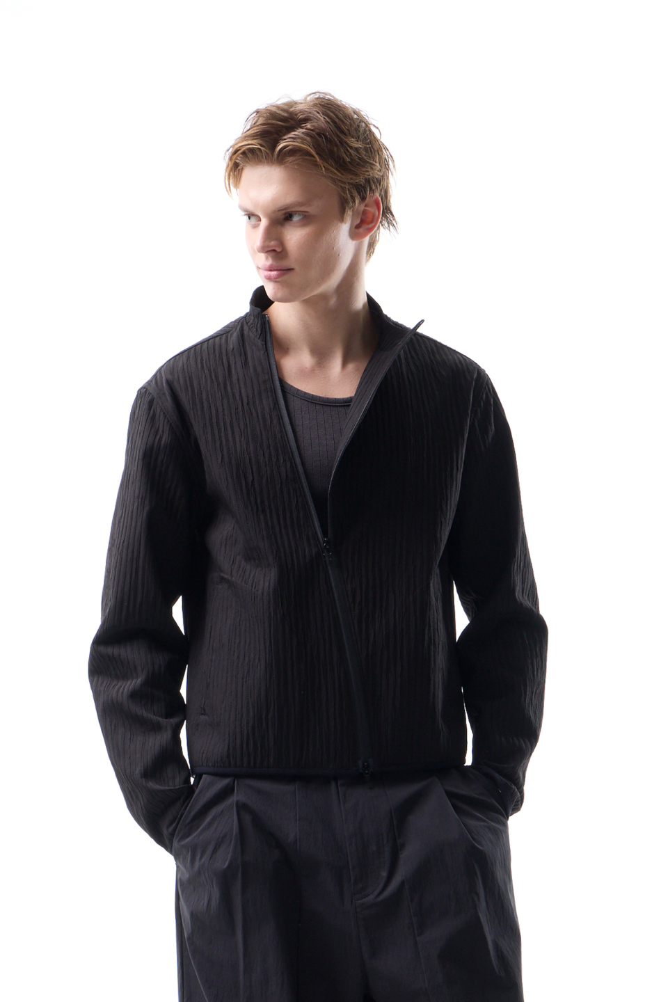 입체적인 크링클 텍스쳐와 사선 지퍼 라인으로 모던하면서 스포티한 스탠드 카라 자켓
