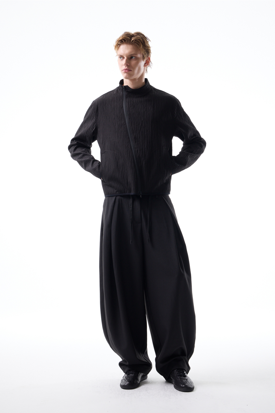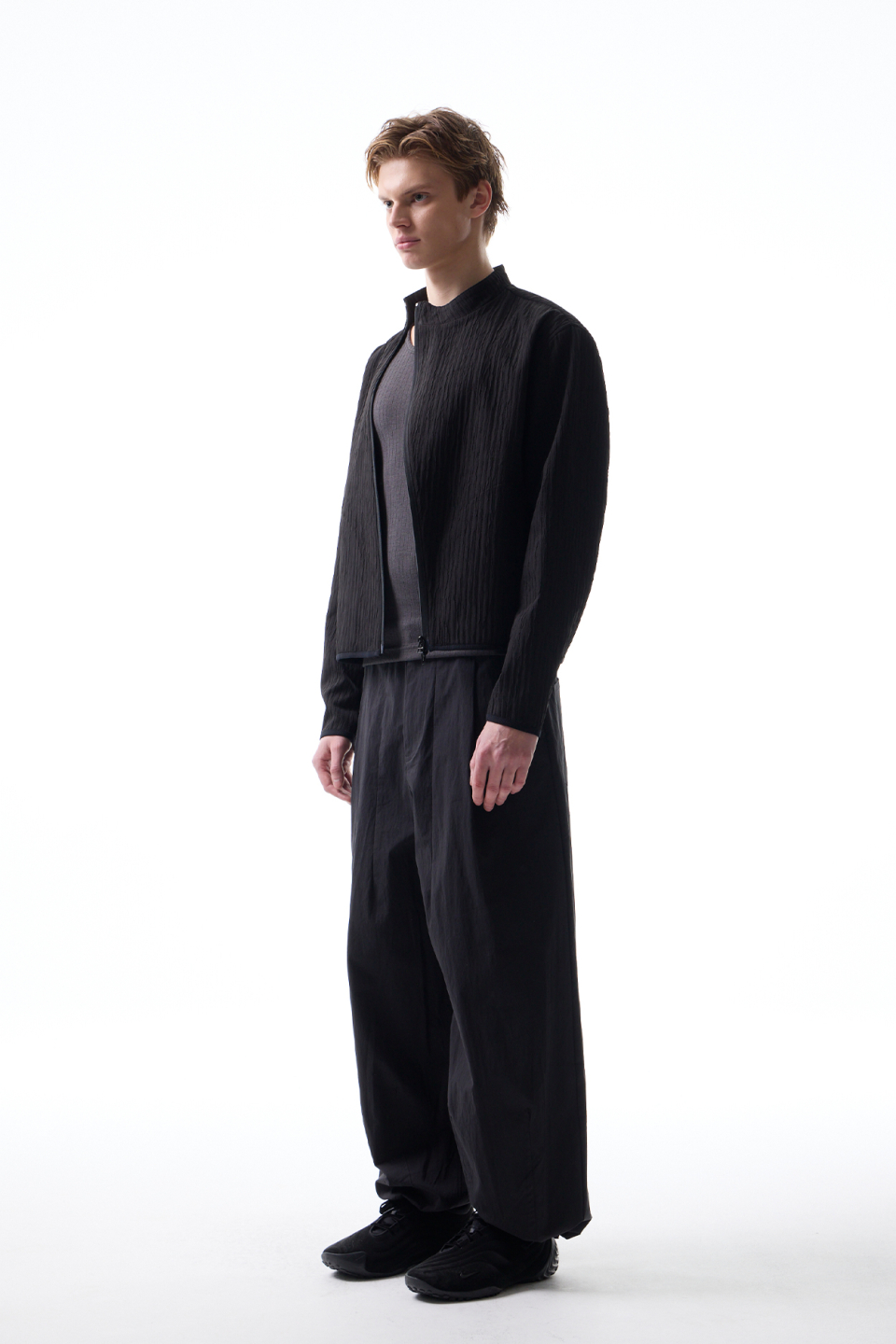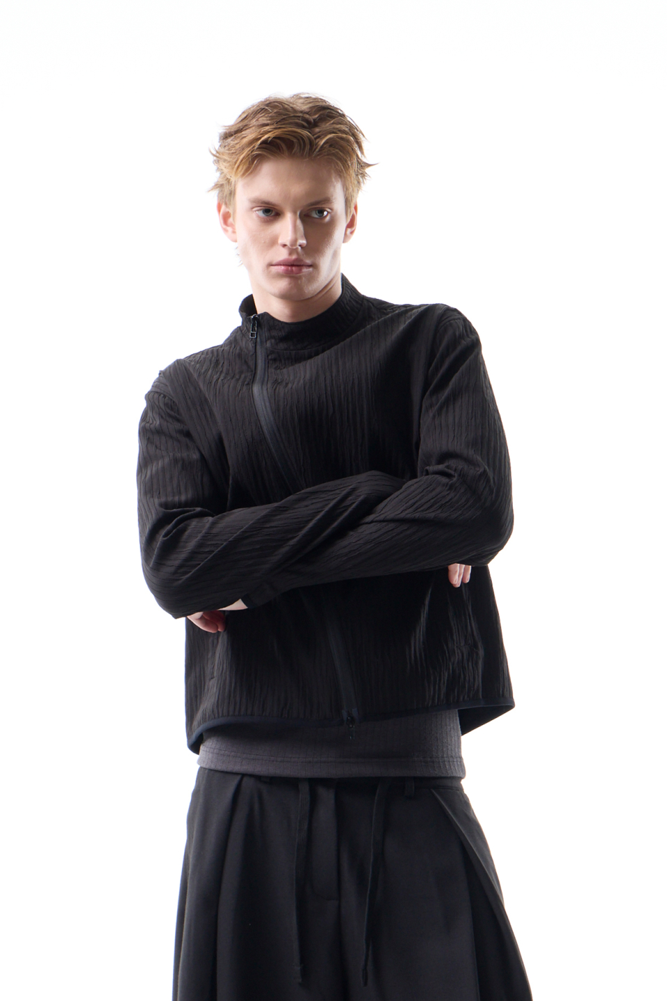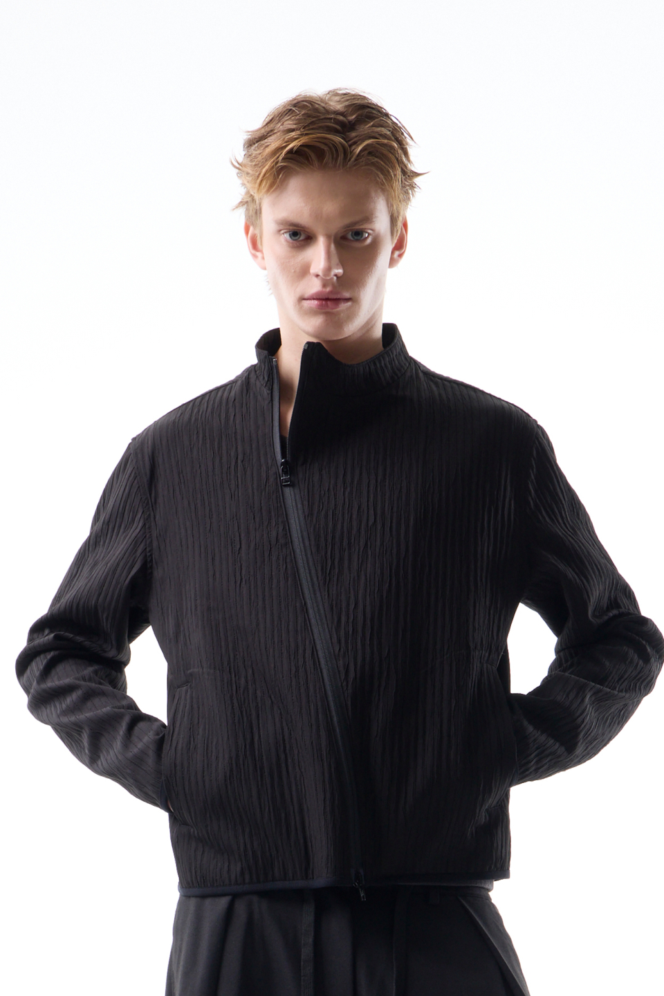 입체적인 크링클 텍스쳐와 사선 지퍼 라인으로 모던하면서 스포티한 스탠드 카라 자켓