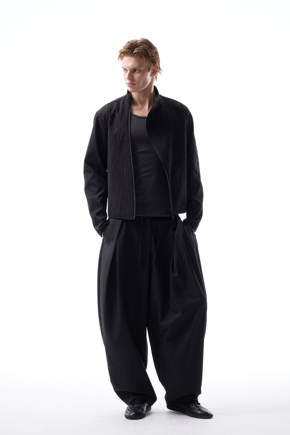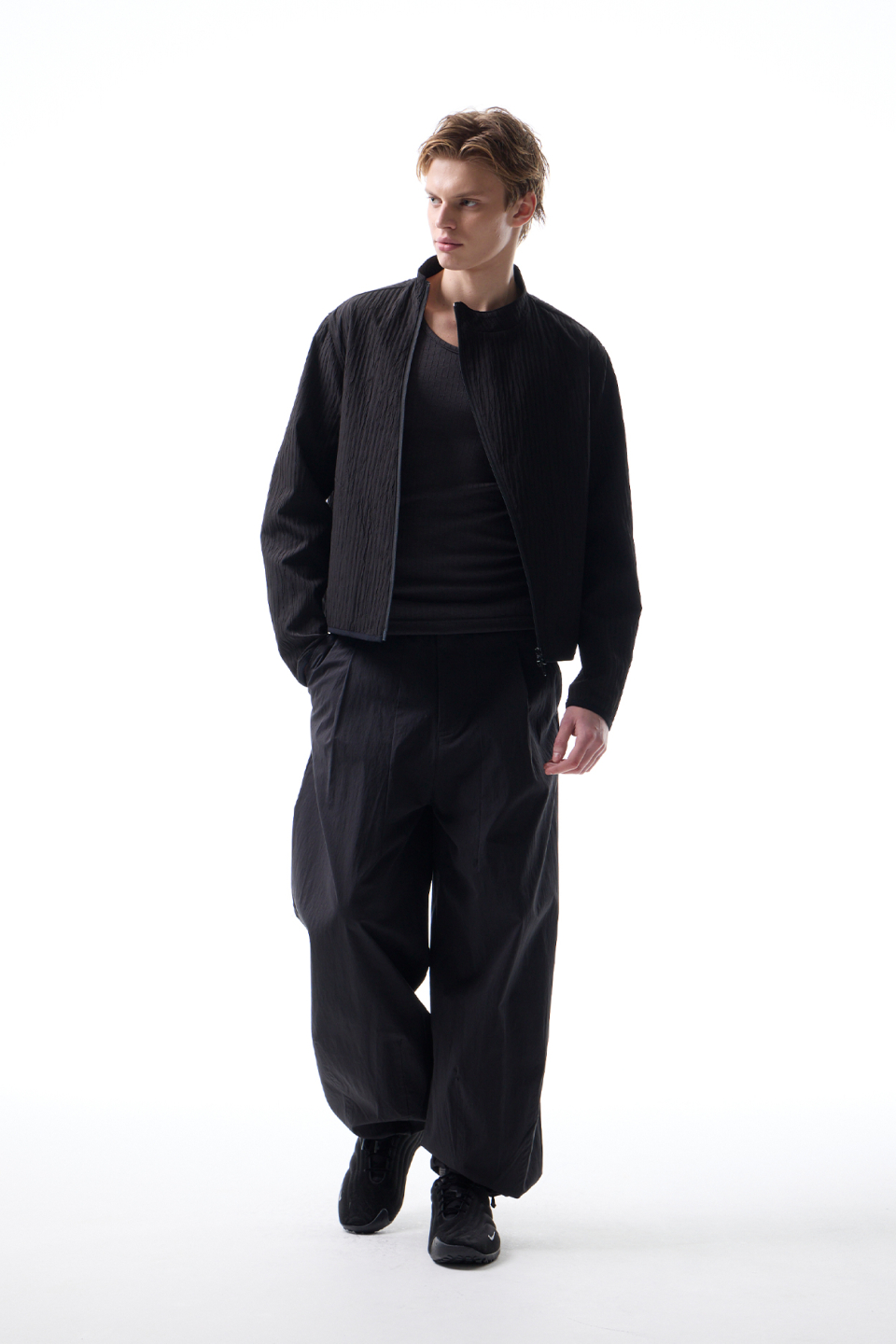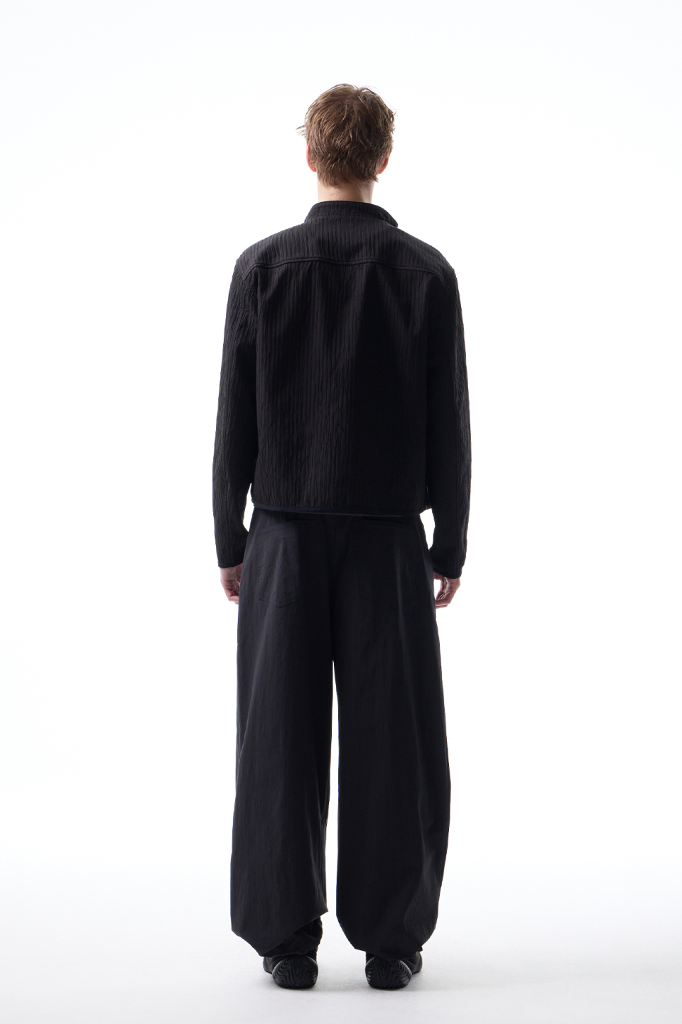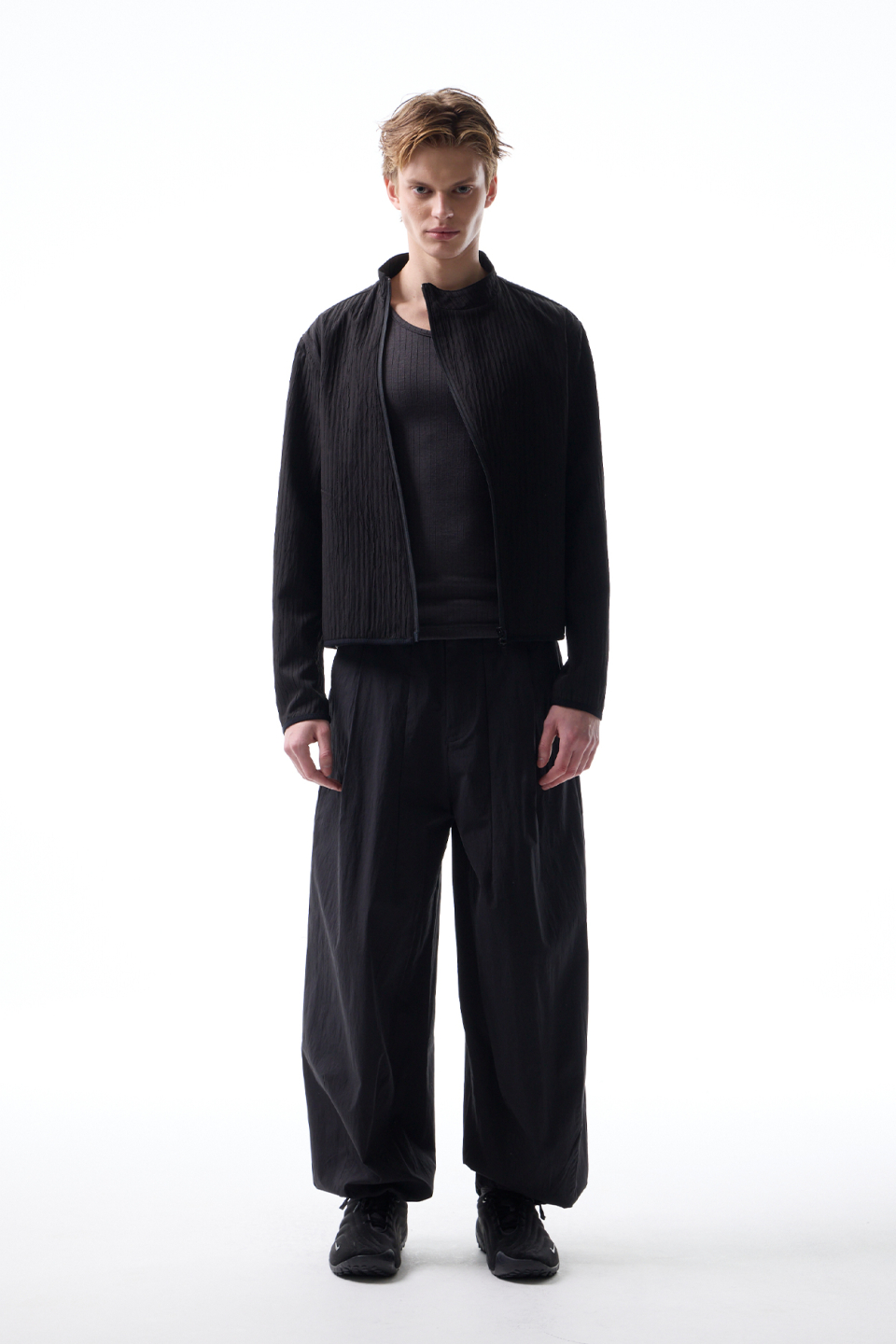 입체적인 크링클 텍스쳐와 사선 지퍼 라인으로 모던하면서 스포티한 스탠드 카라 자켓