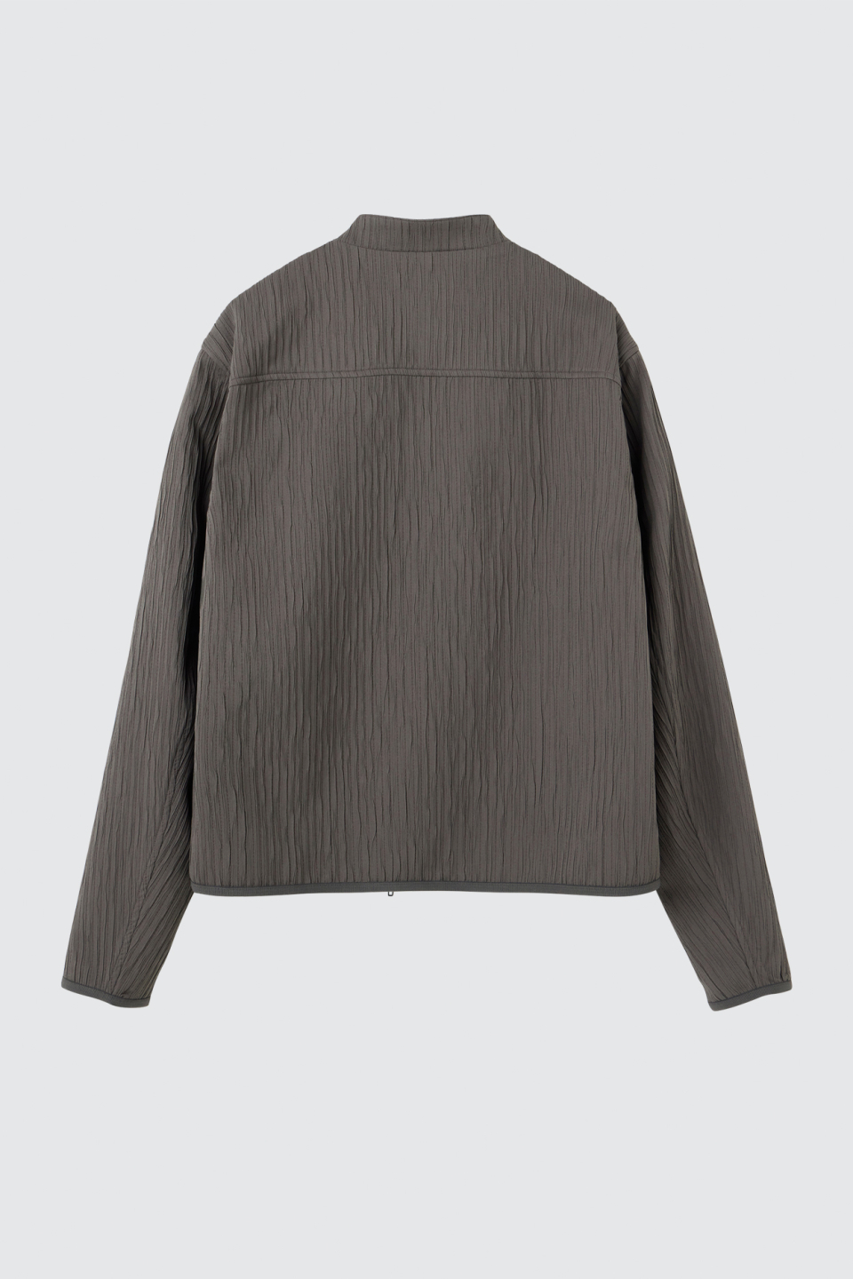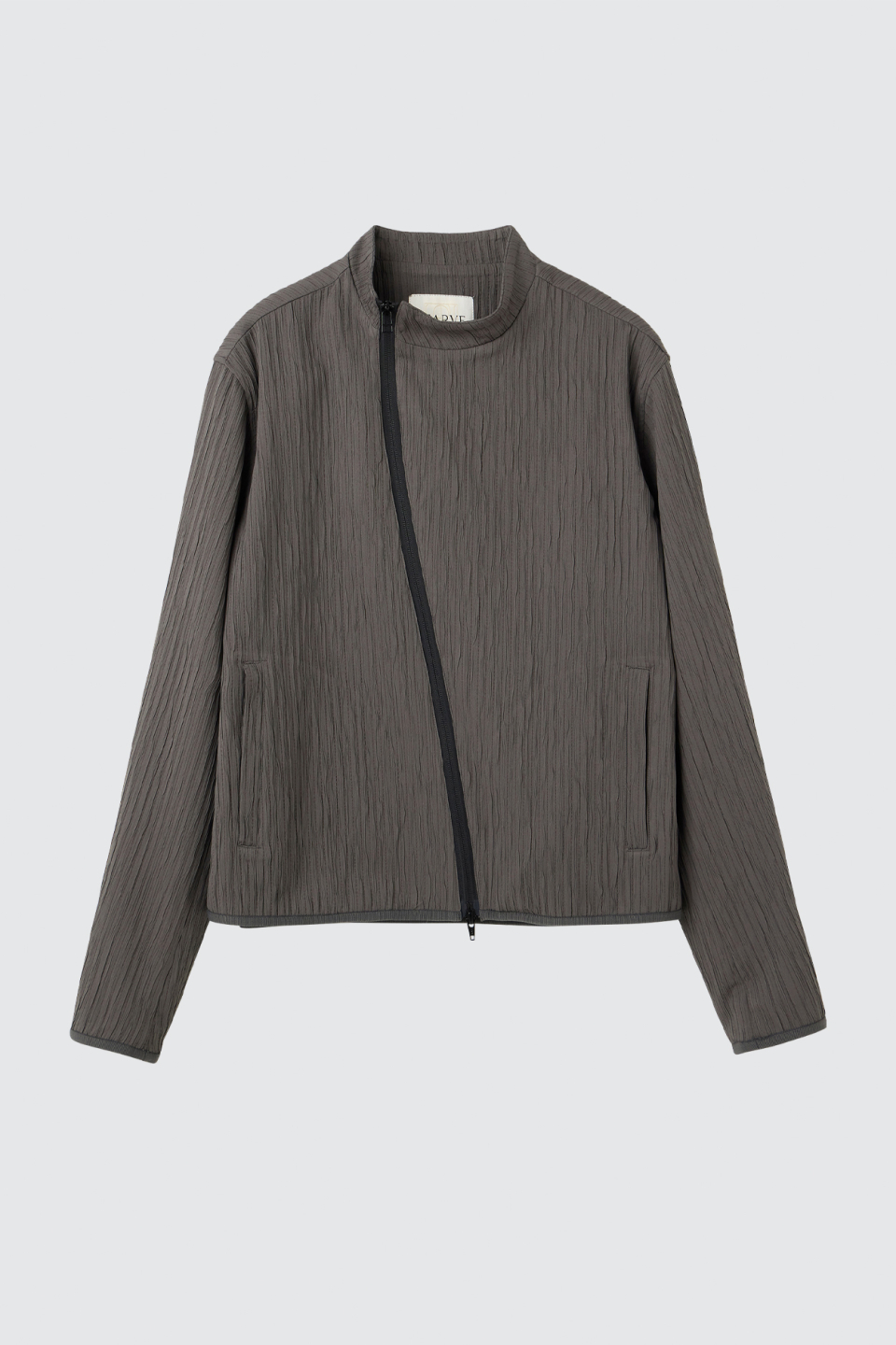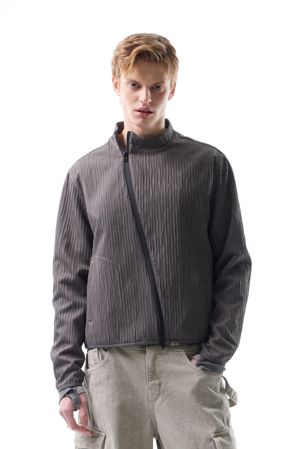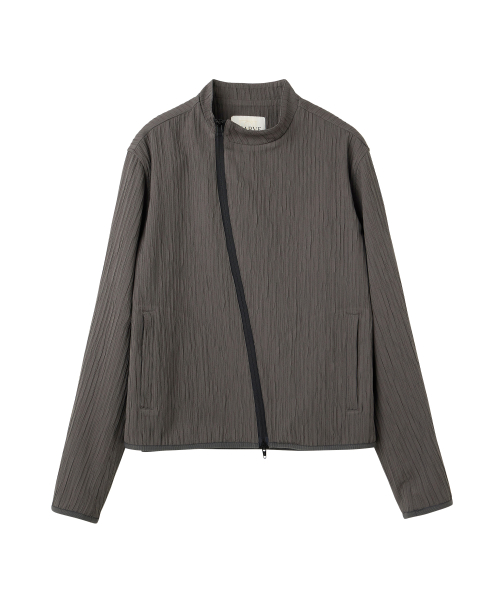 입체적인 크링클 텍스쳐와 사선 지퍼 라인으로 모던하면서 스포티한 스탠드 카라 자켓