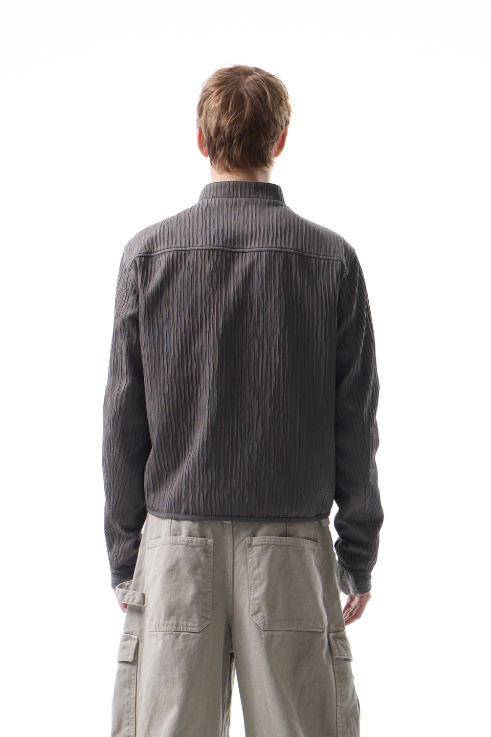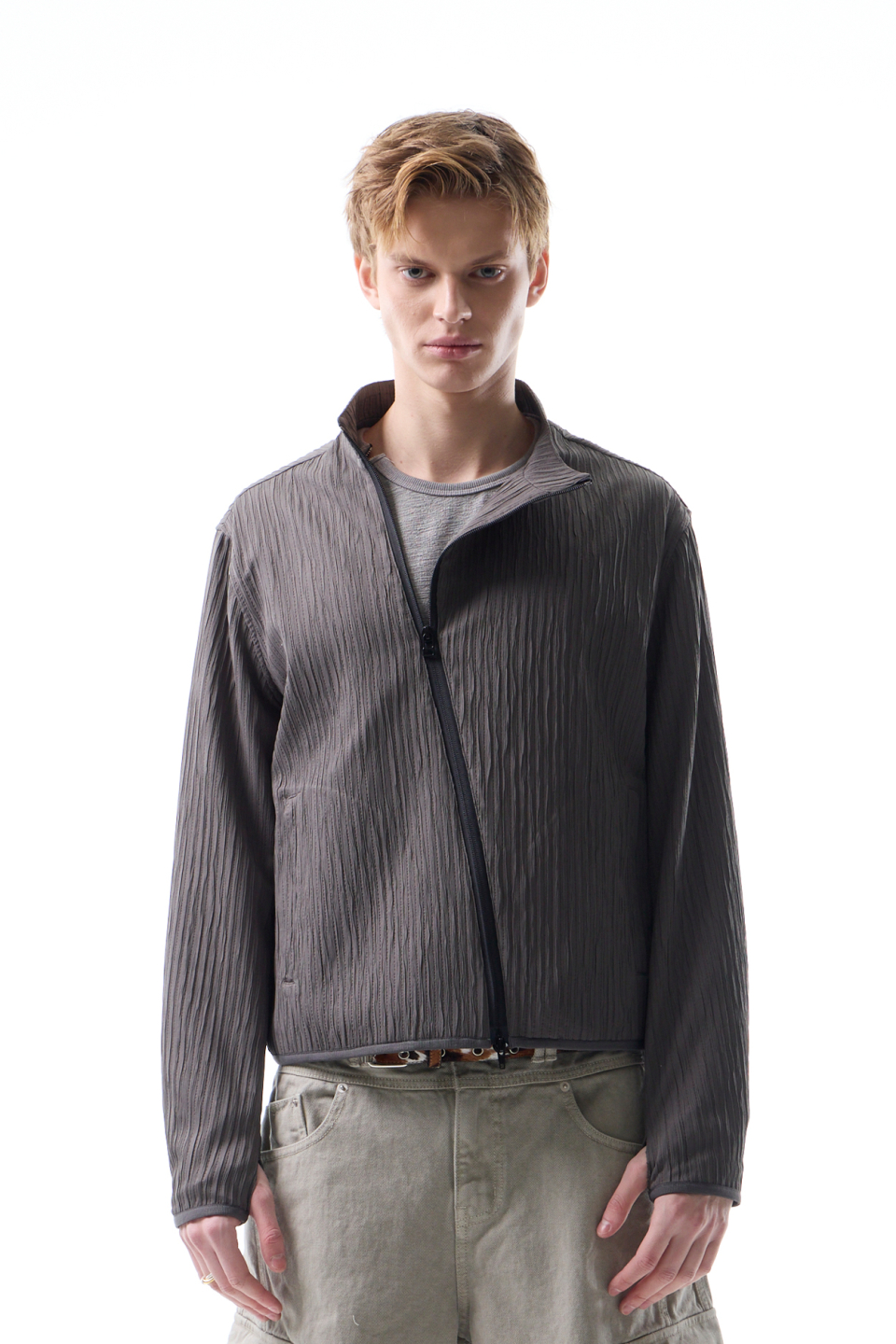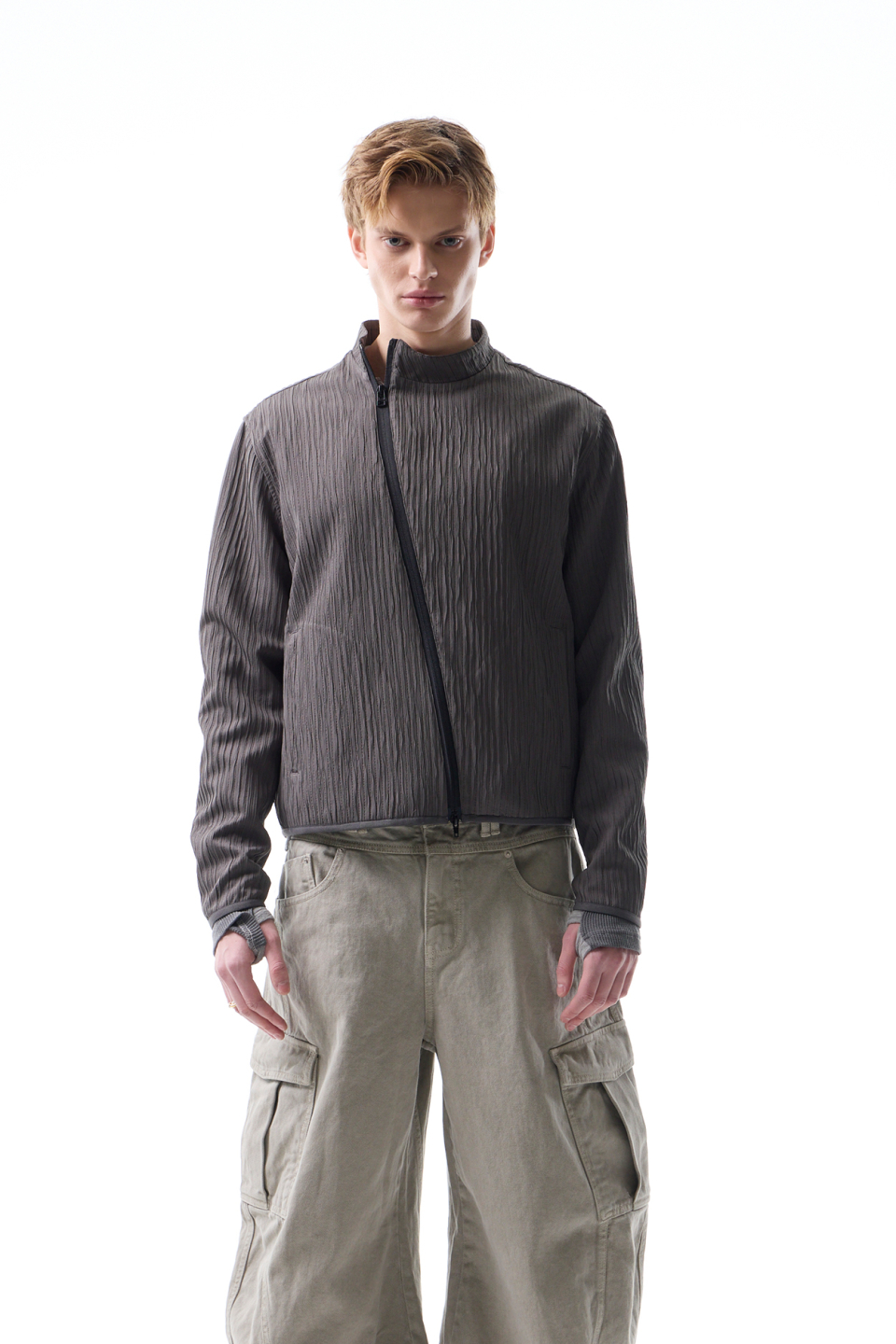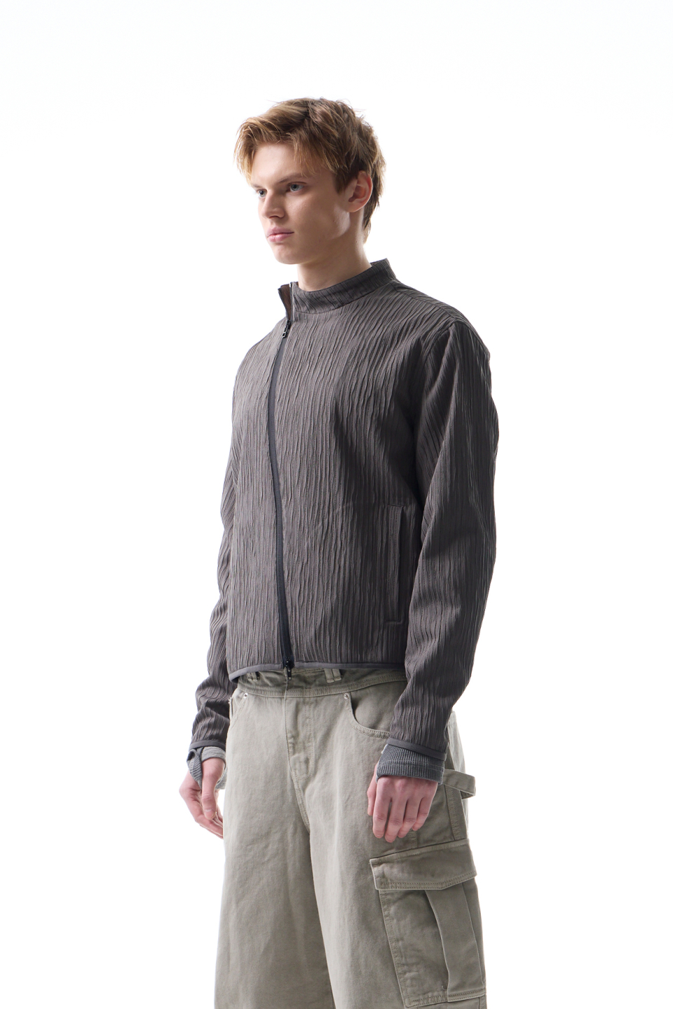 입체적인 크링클 텍스쳐와 사선 지퍼 라인으로 모던하면서 스포티한 스탠드 카라 자켓