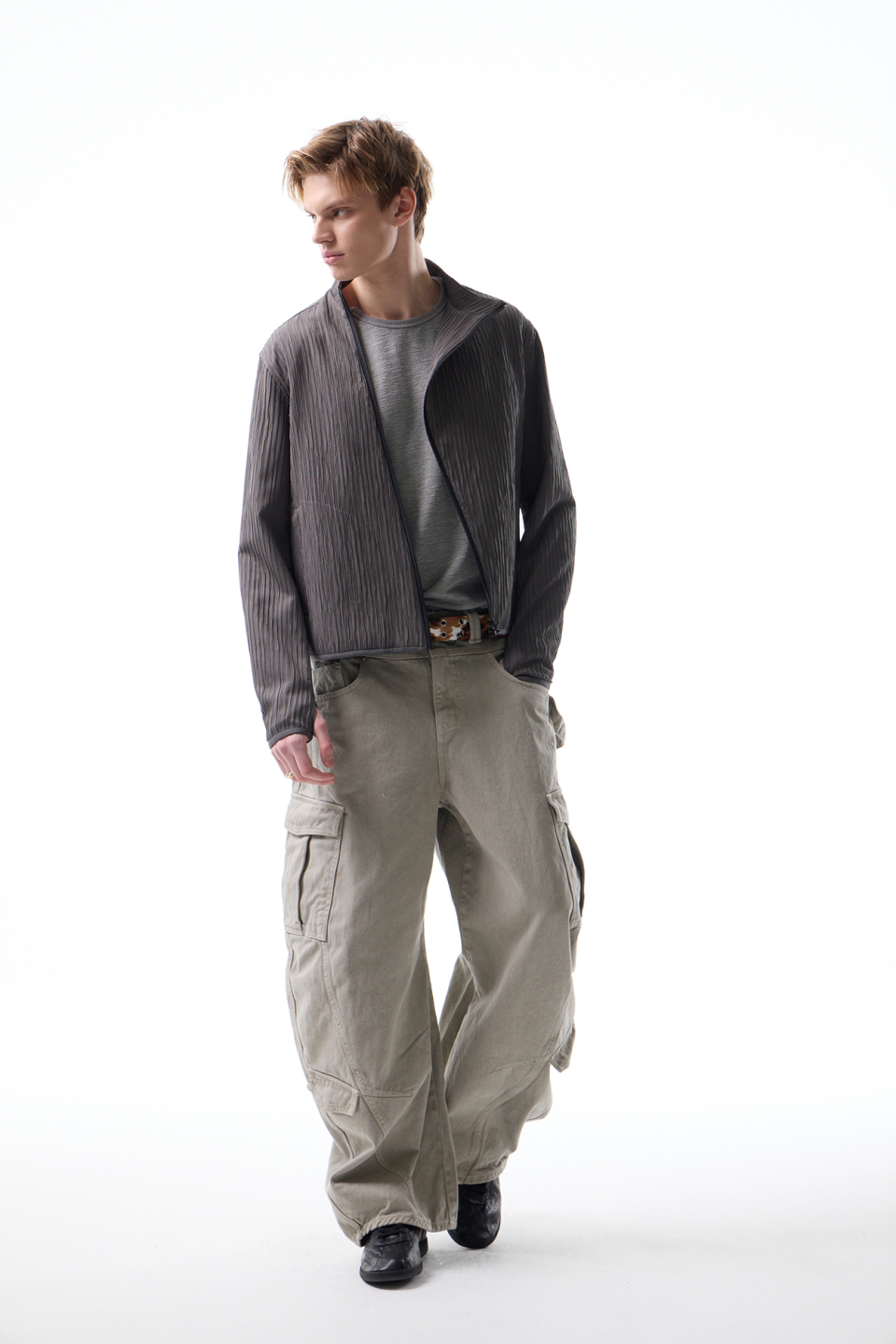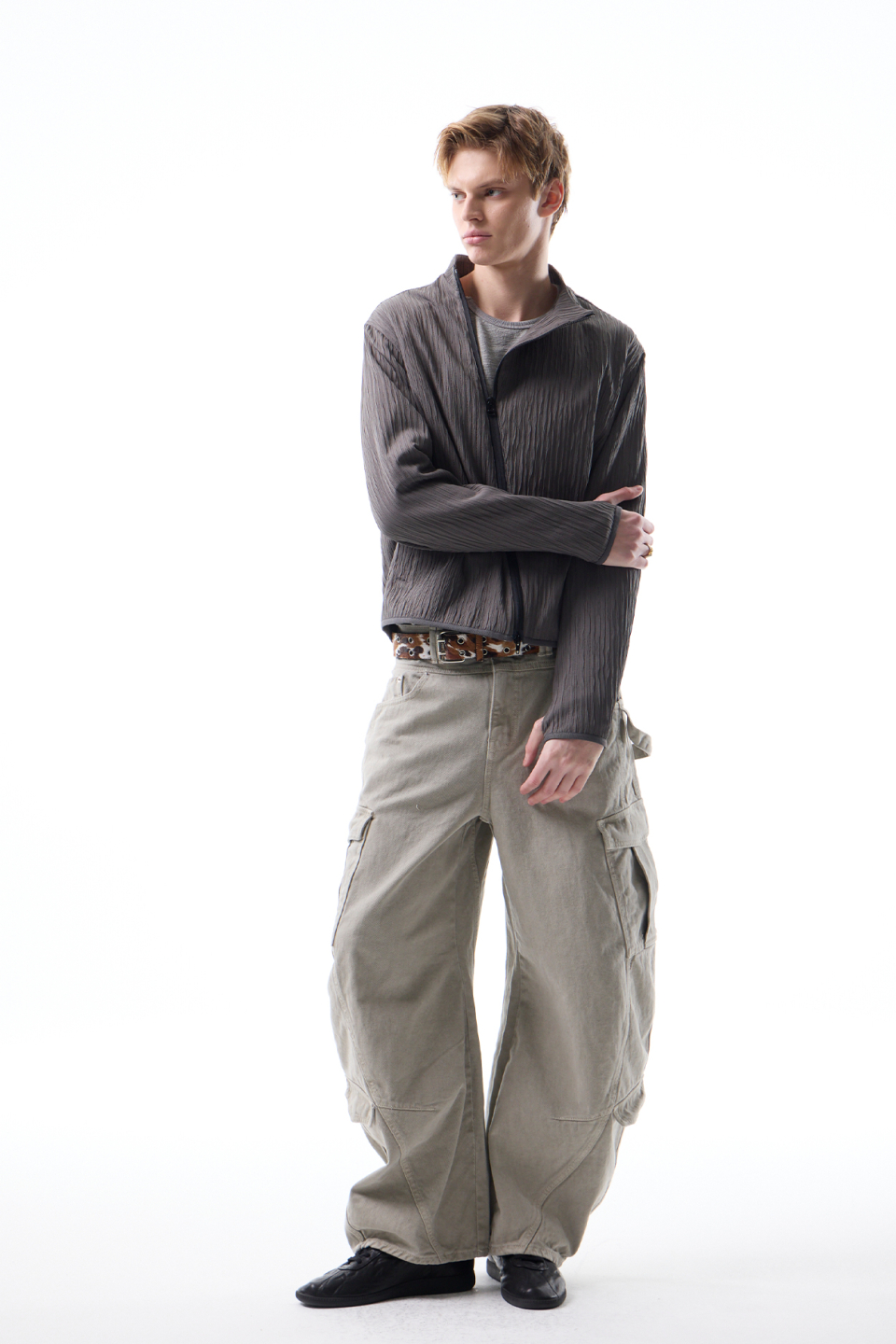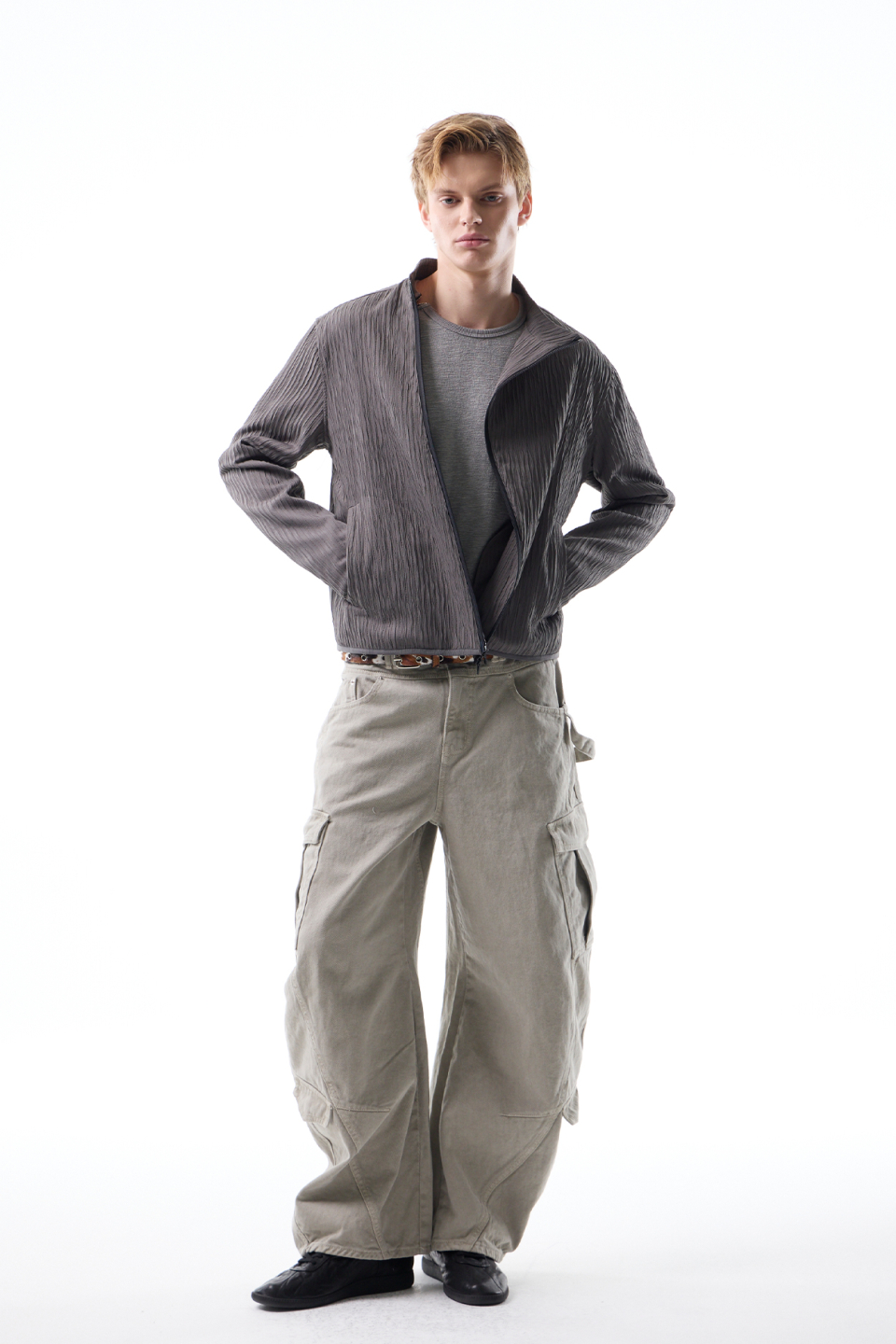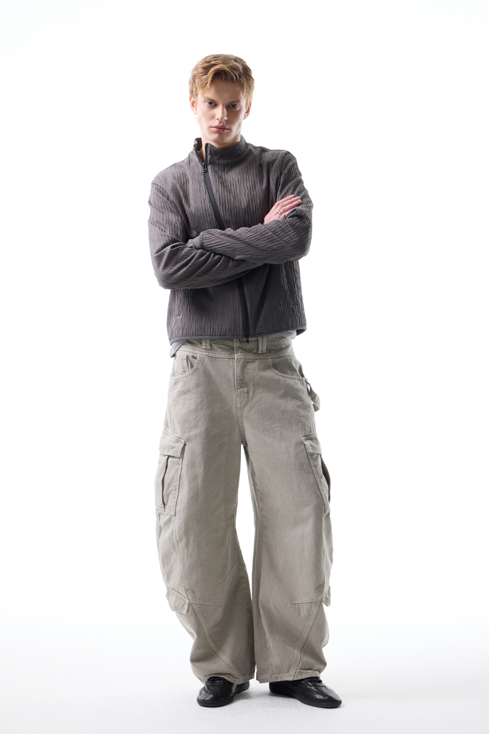 입체적인 크링클 텍스쳐와 사선 지퍼 라인으로 모던하면서 스포티한 스탠드 카라 자켓