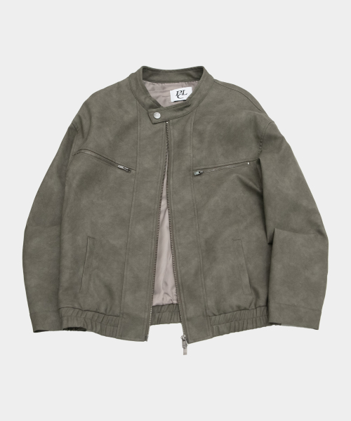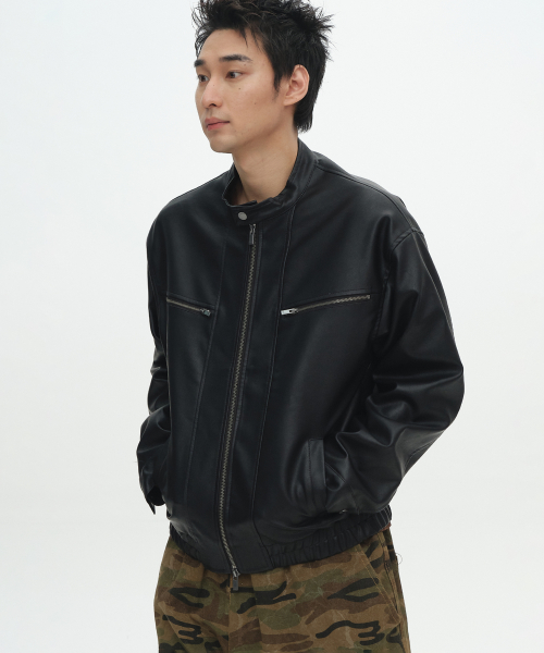 빈티지 오버핏 넥 버튼 투웨이 레더 레이싱 바이커 자켓_2COLOR
