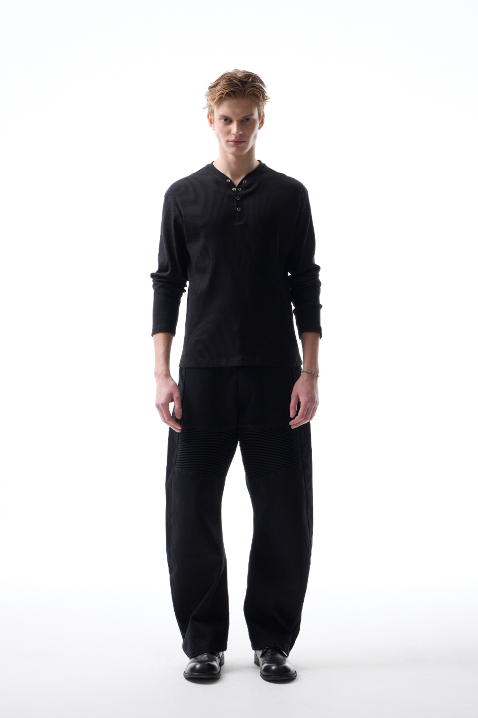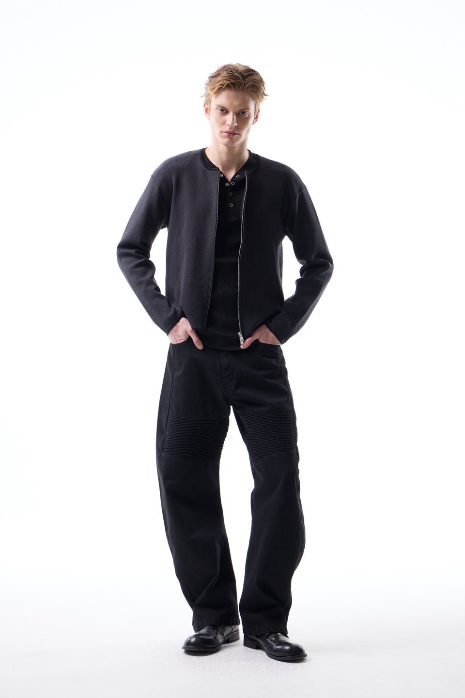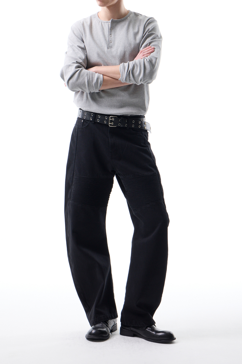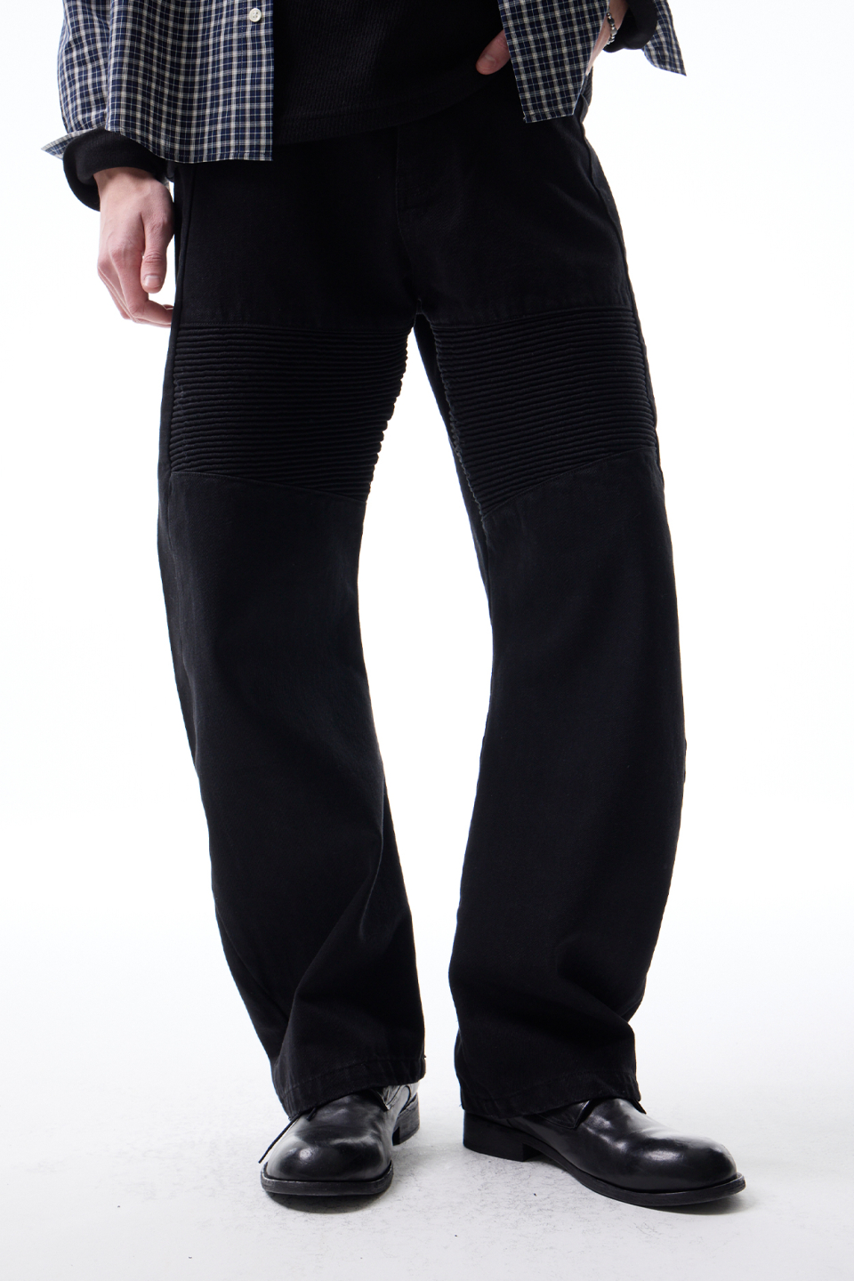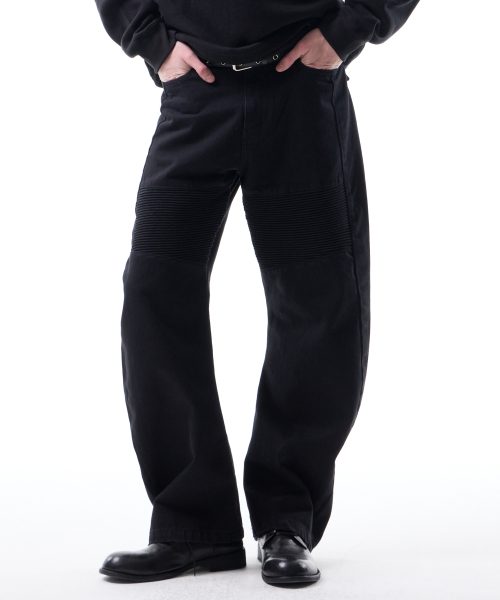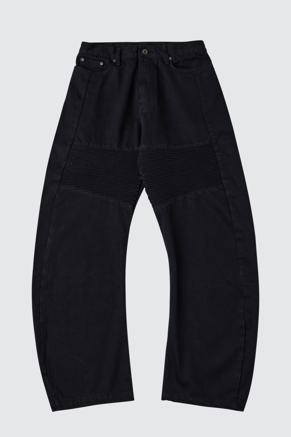 탄탄한 면 100% 데님 소재에 무릎 부분의 입체적인 바이커 리브 디테일이 포인트인 레귤러 데님 팬츠