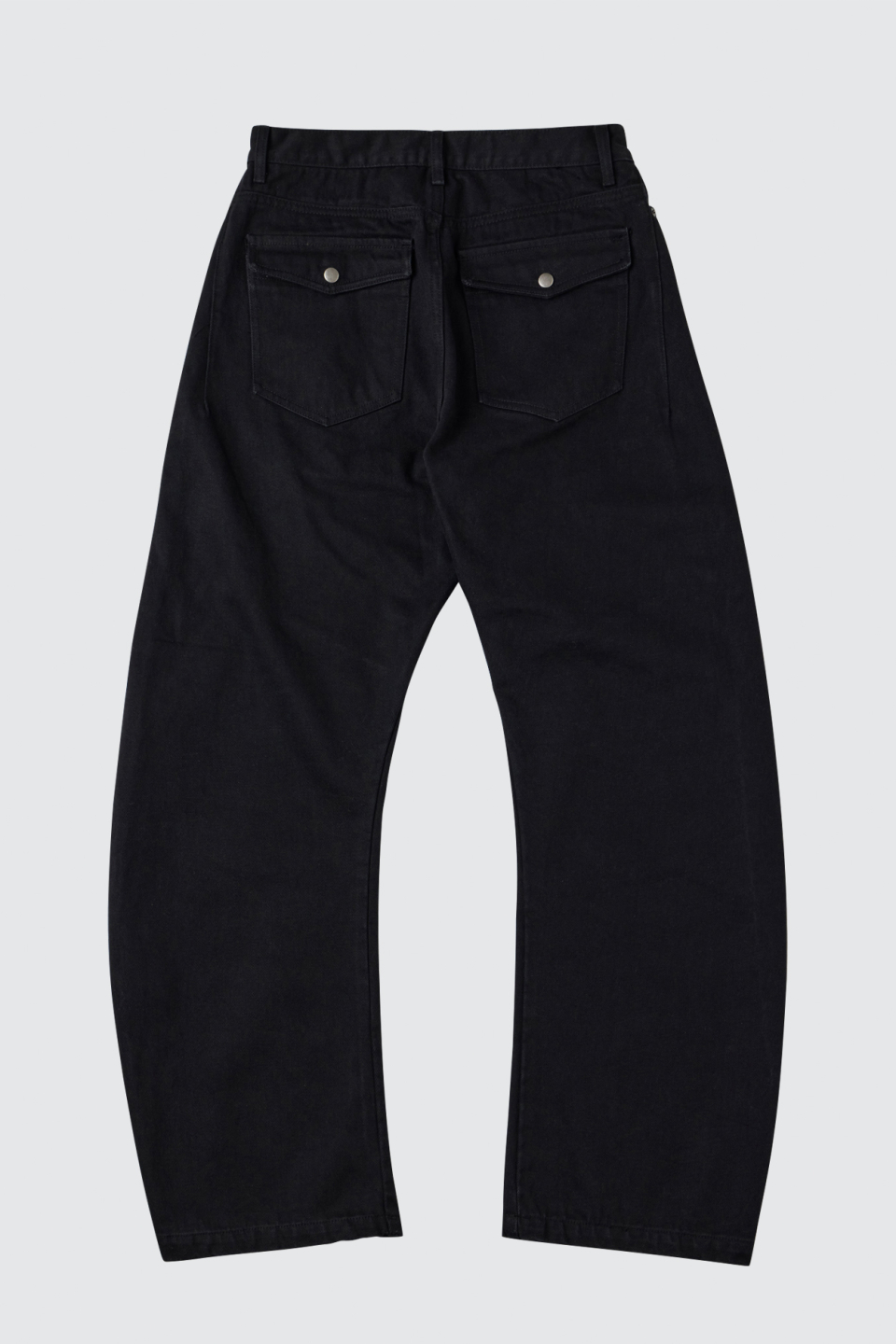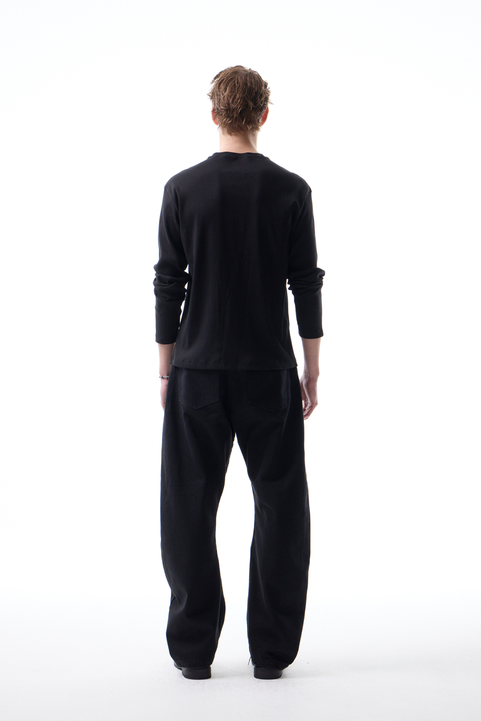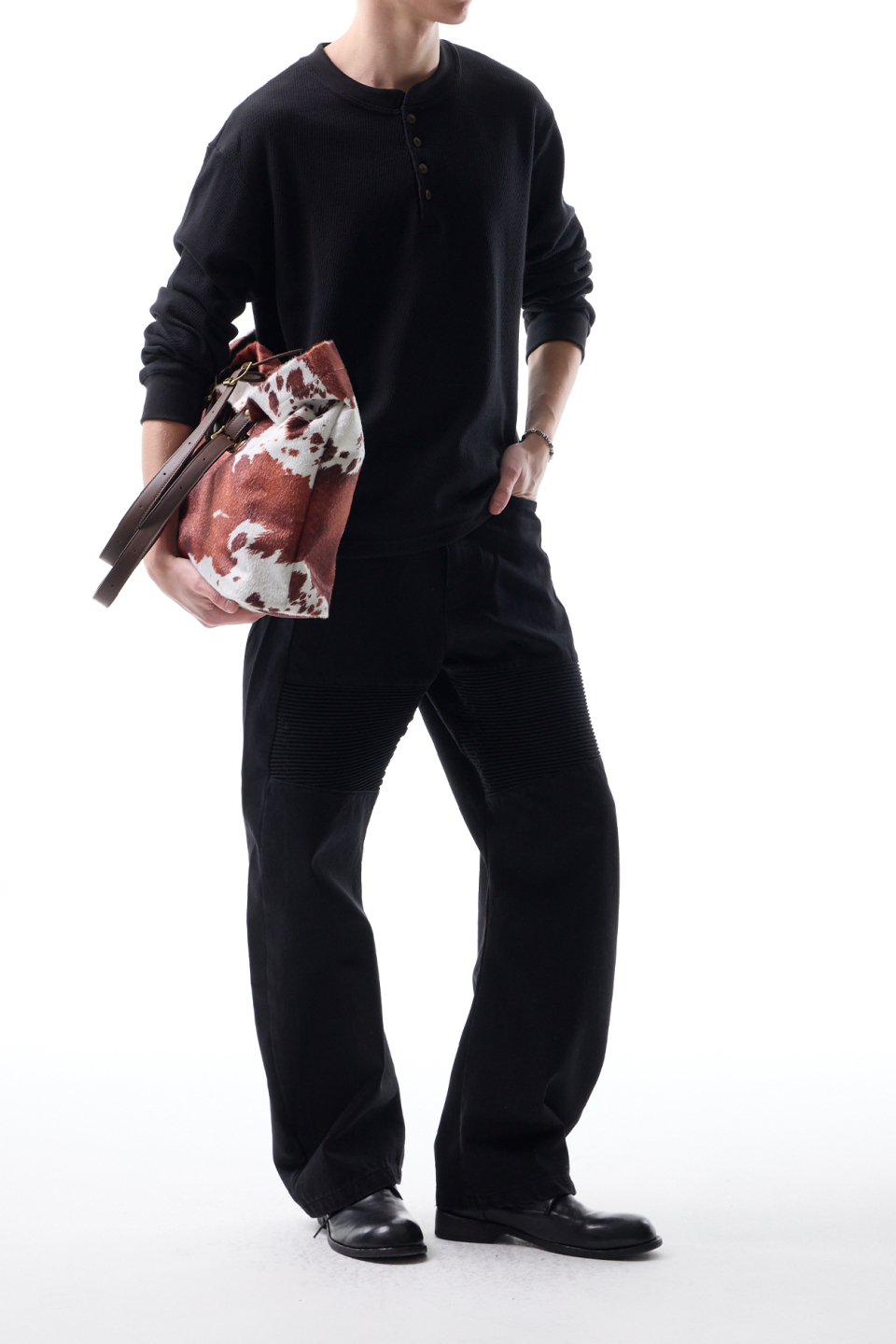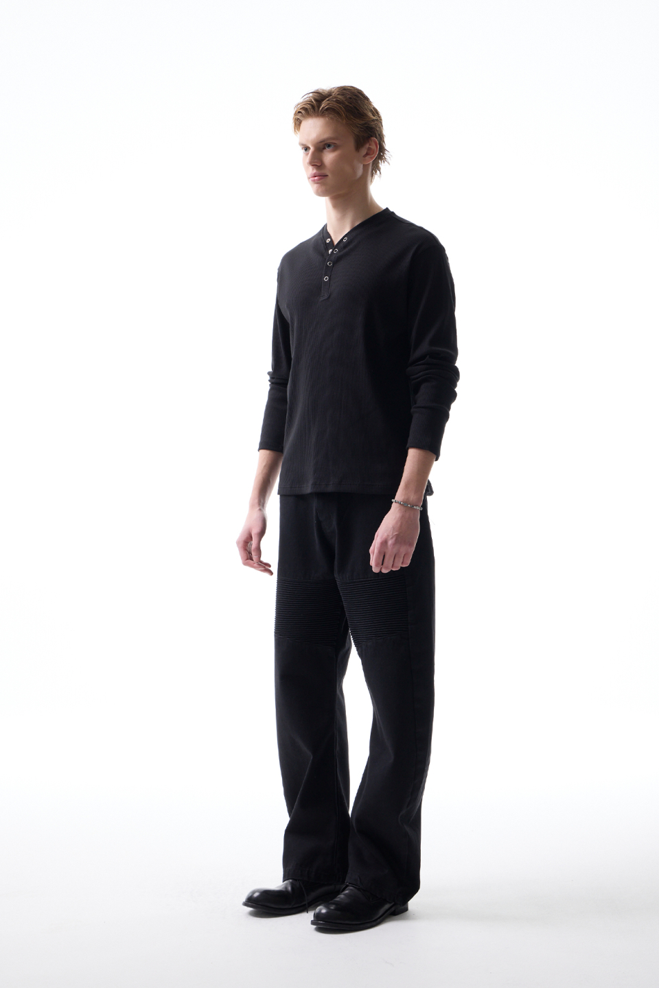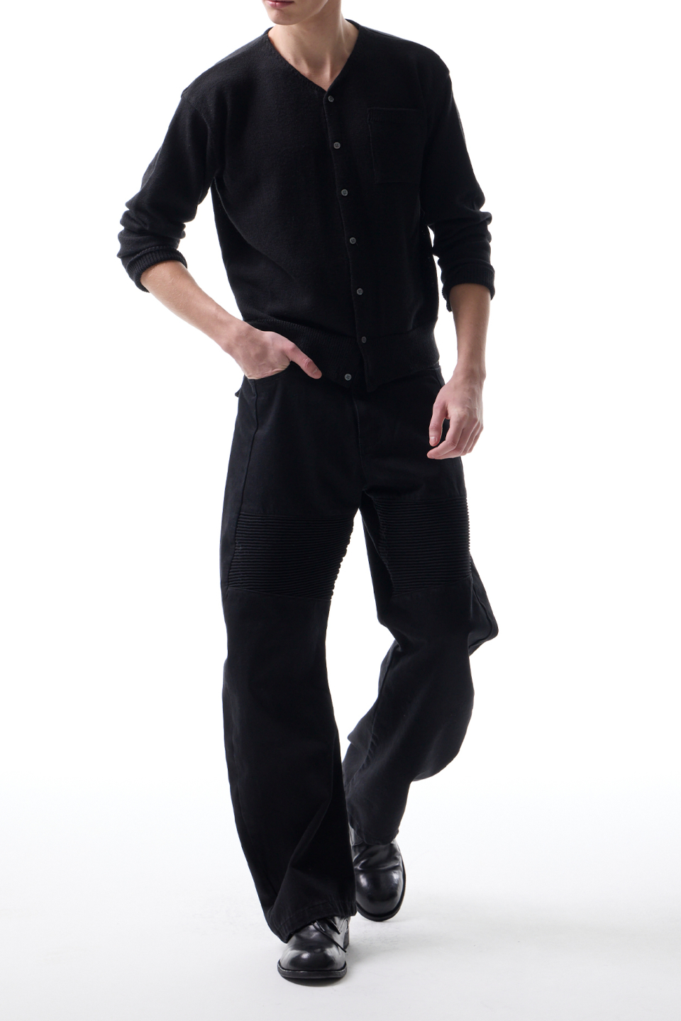 탄탄한 면 100% 데님 소재에 무릎 부분의 입체적인 바이커 리브 디테일이 포인트인 레귤러 데님 팬츠