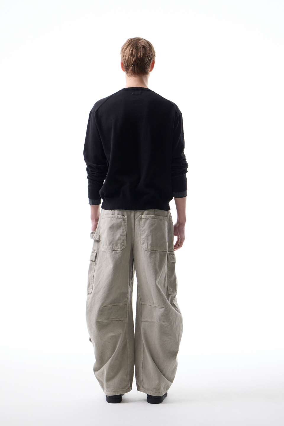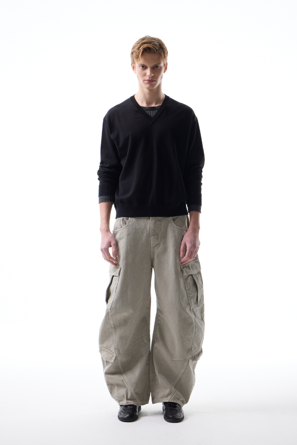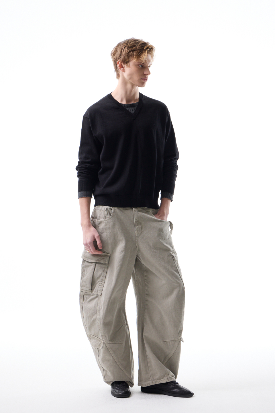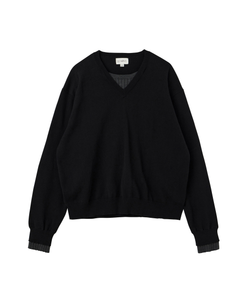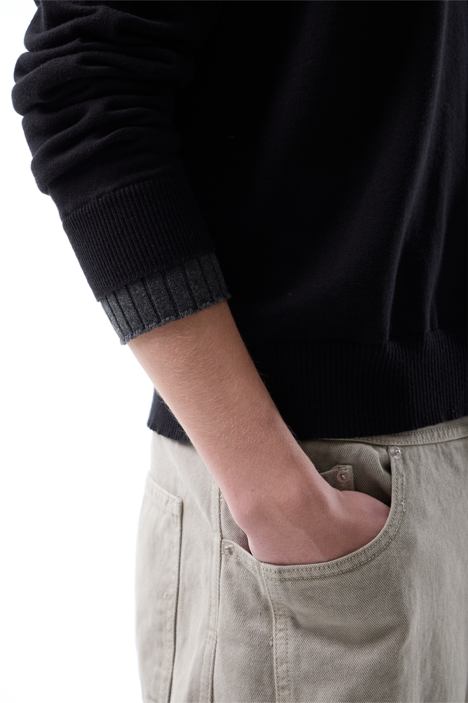 넥과 소매 끝단에 두가지 톤의 골지 조직으로 레이어드 한듯한 실루엣 표현