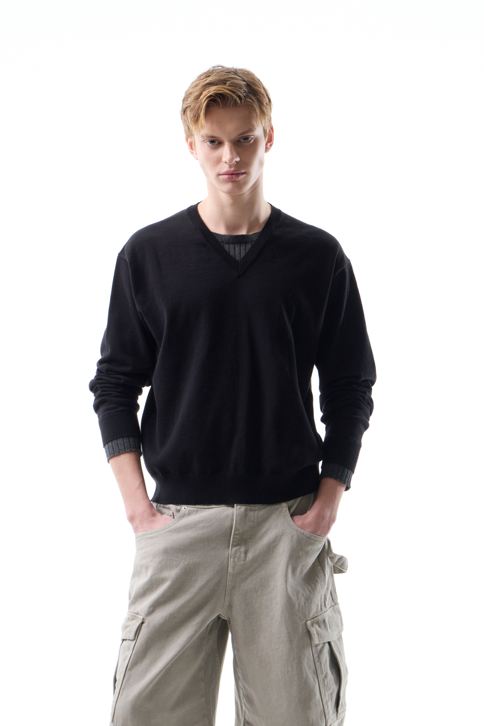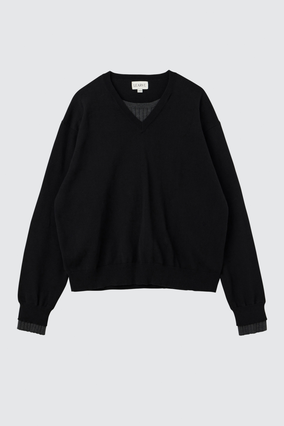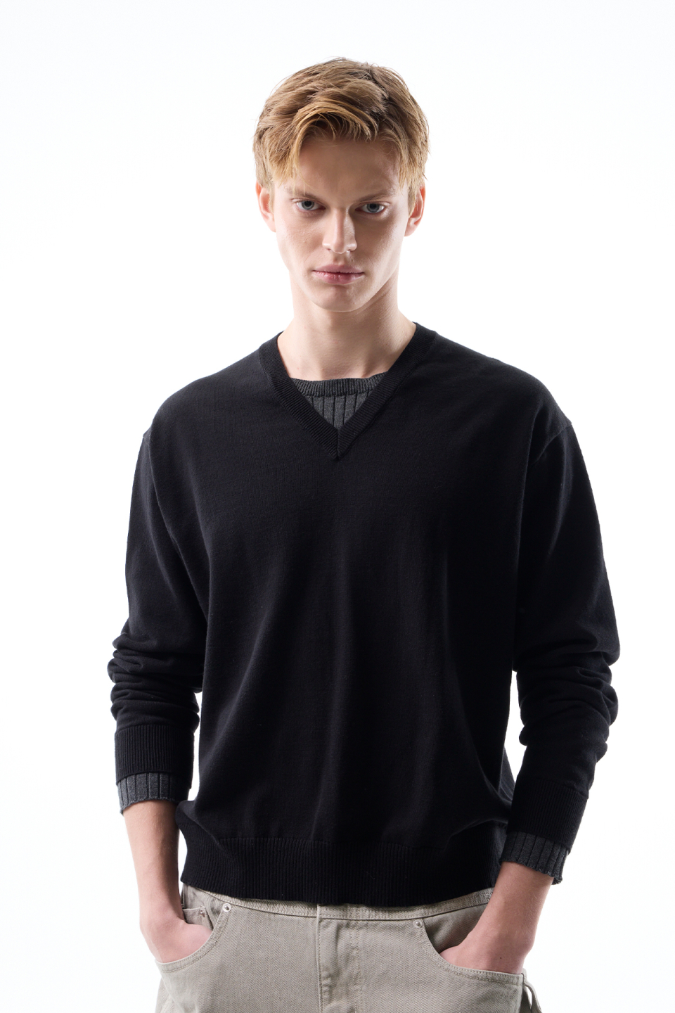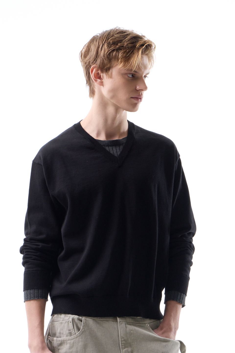 부드러운 터치의 베이직 브이넥 니트에 배색 립 조직을 더한 디자인