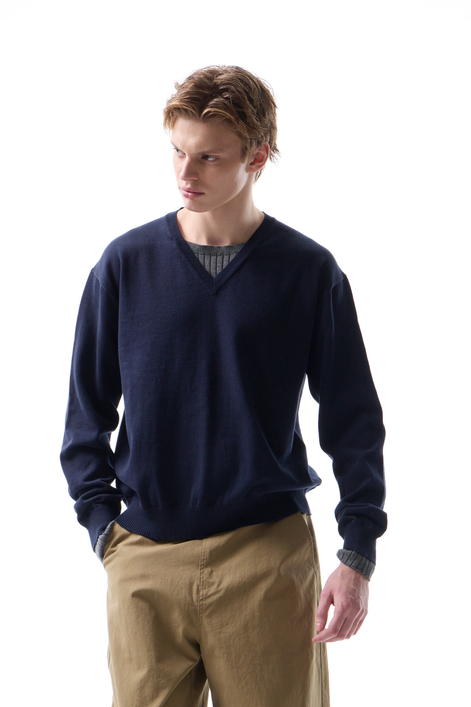 부드러운 터치의 베이직 브이넥 니트에 배색 립 조직을 더한 디자인