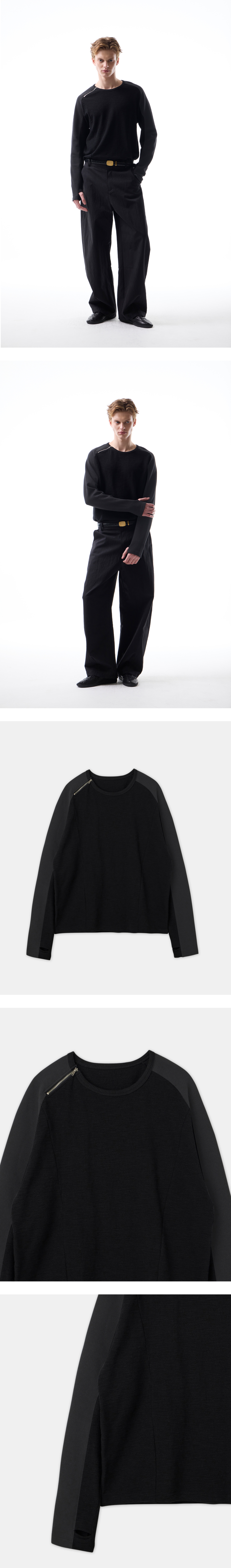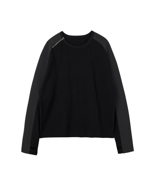 슬럽 조직의 몸판과 와플 조직의 소매를 배색하여 텍스처 대비를 보여주는 롱슬리브