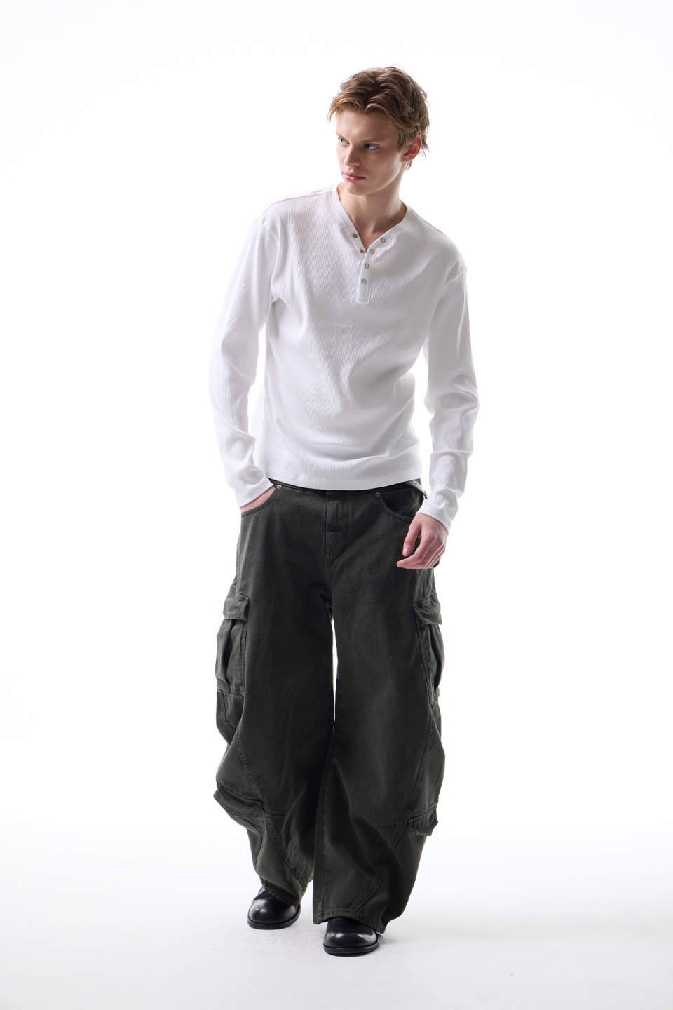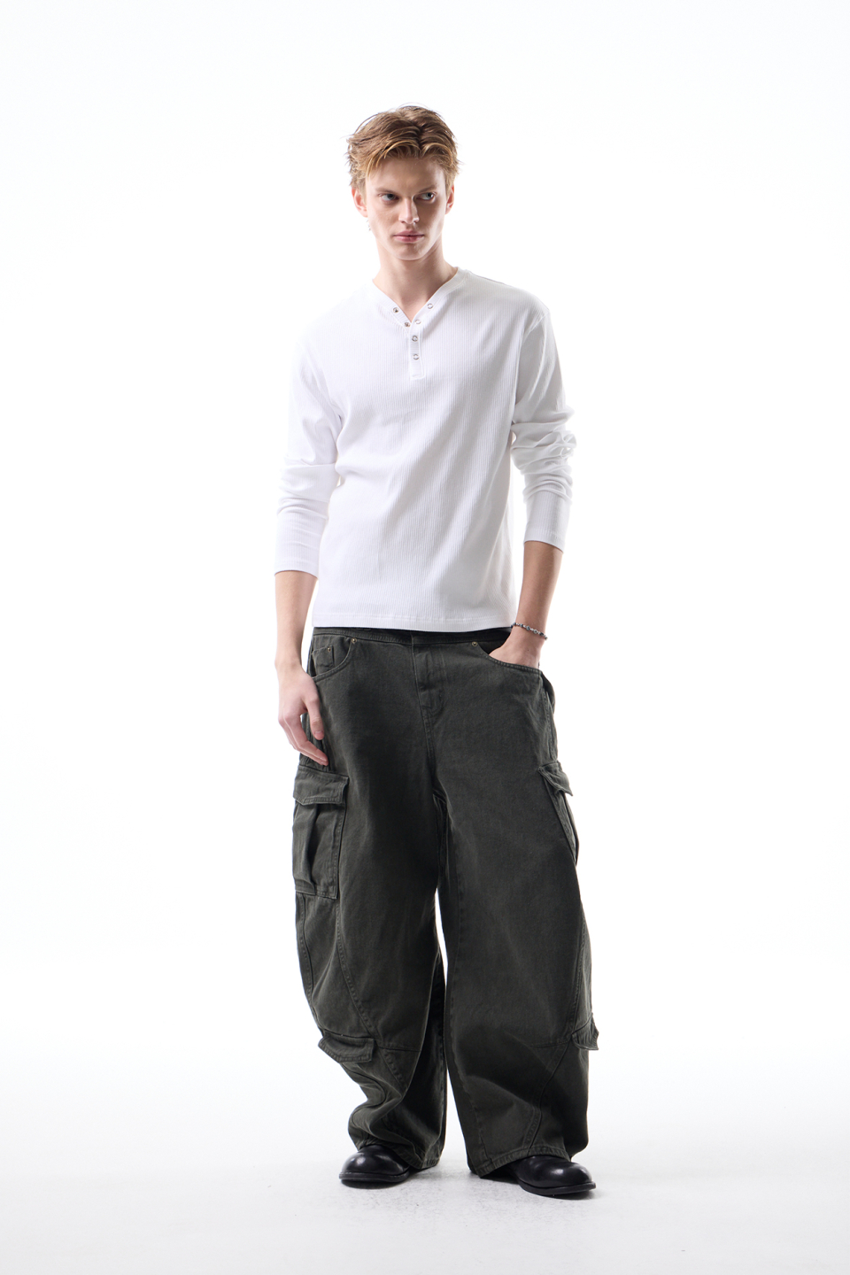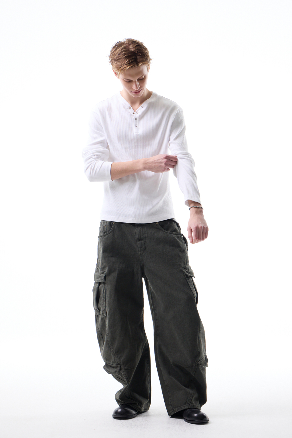 일반적인 헨리넥과 다른 브이넥 형태로 자연스러운 넥라인이 남성적인 분위기 연출