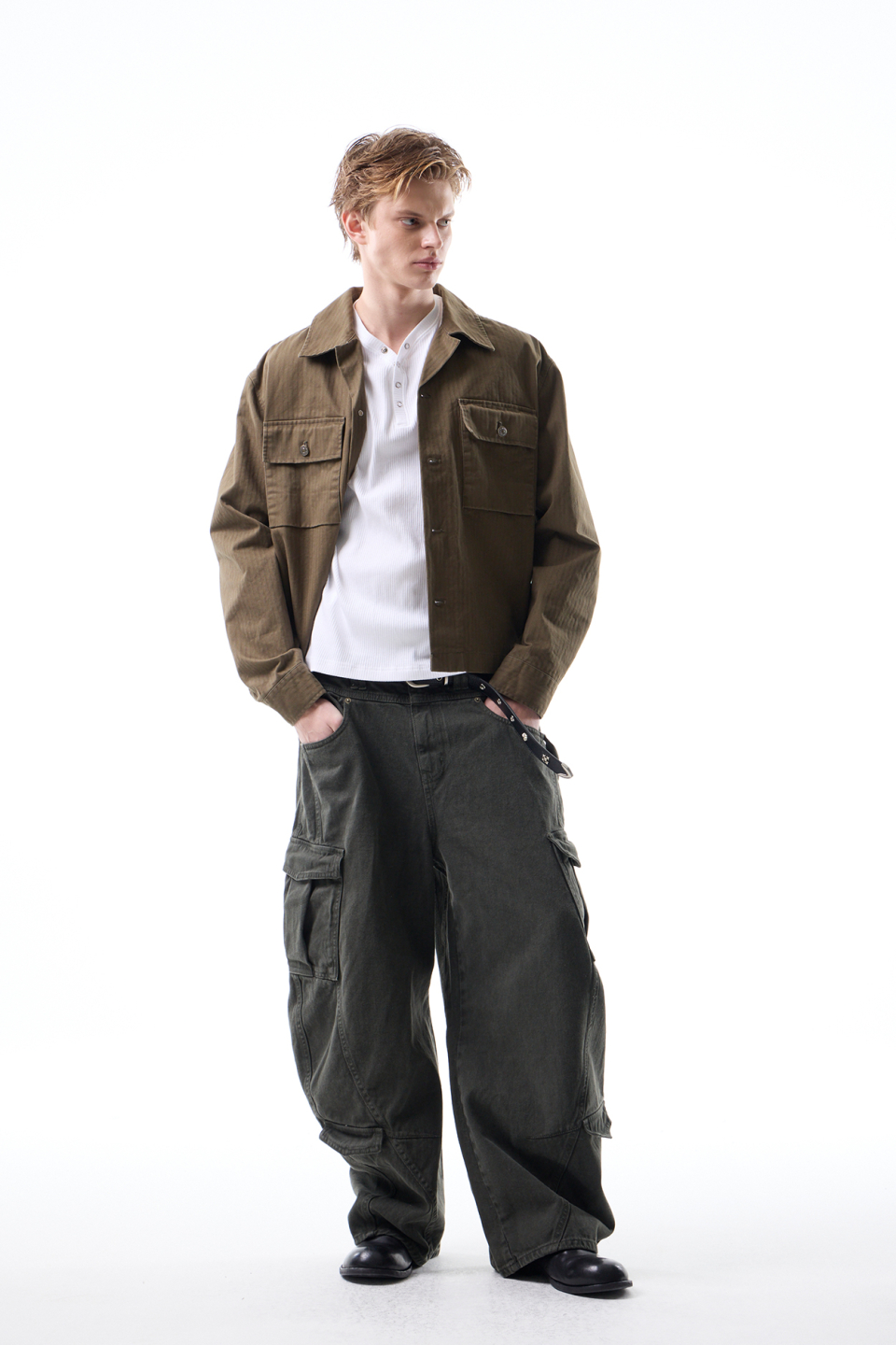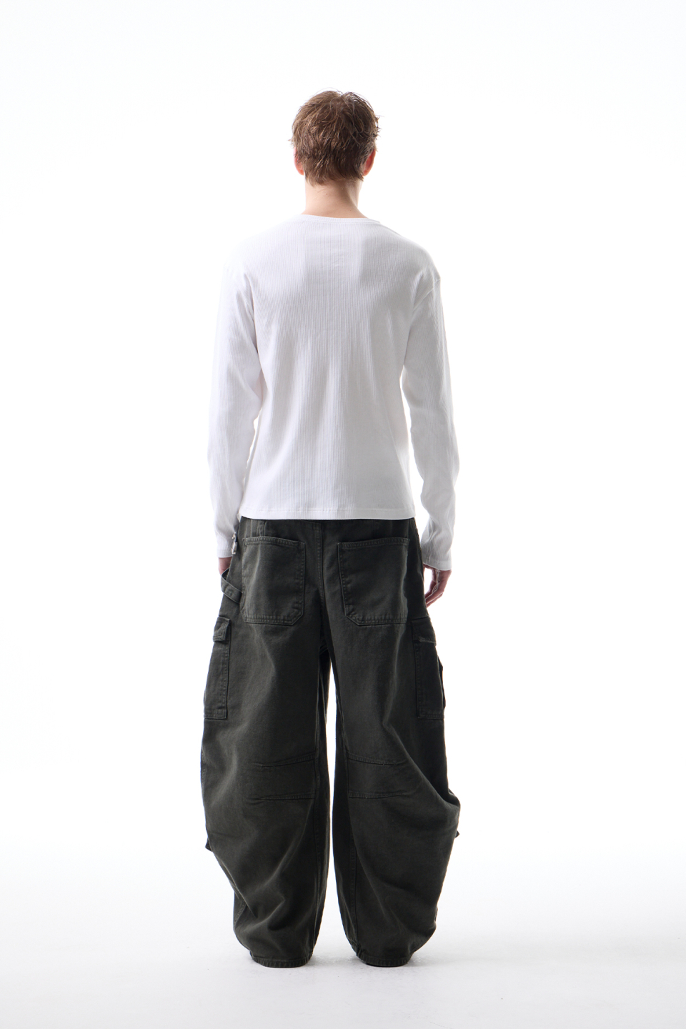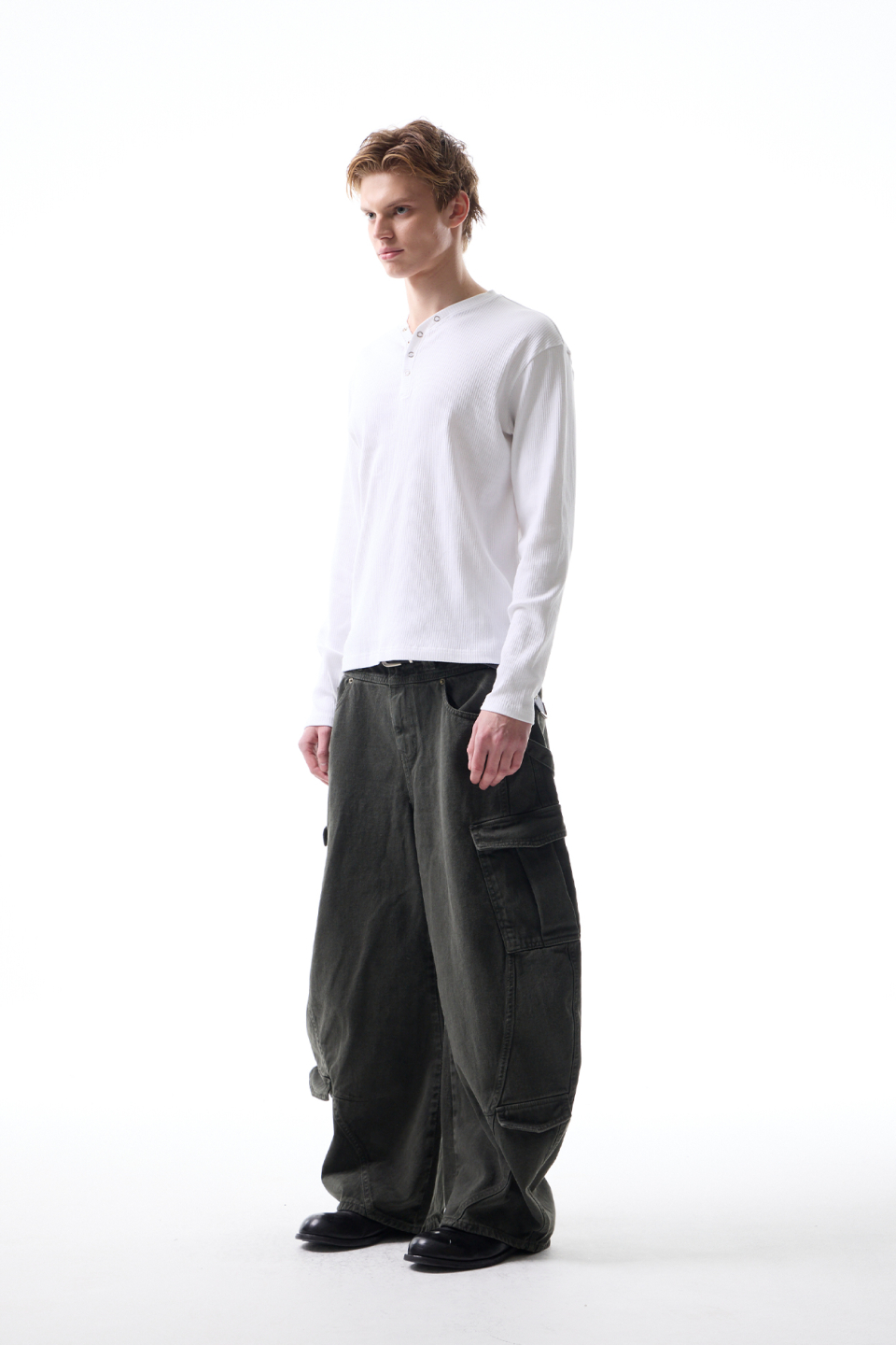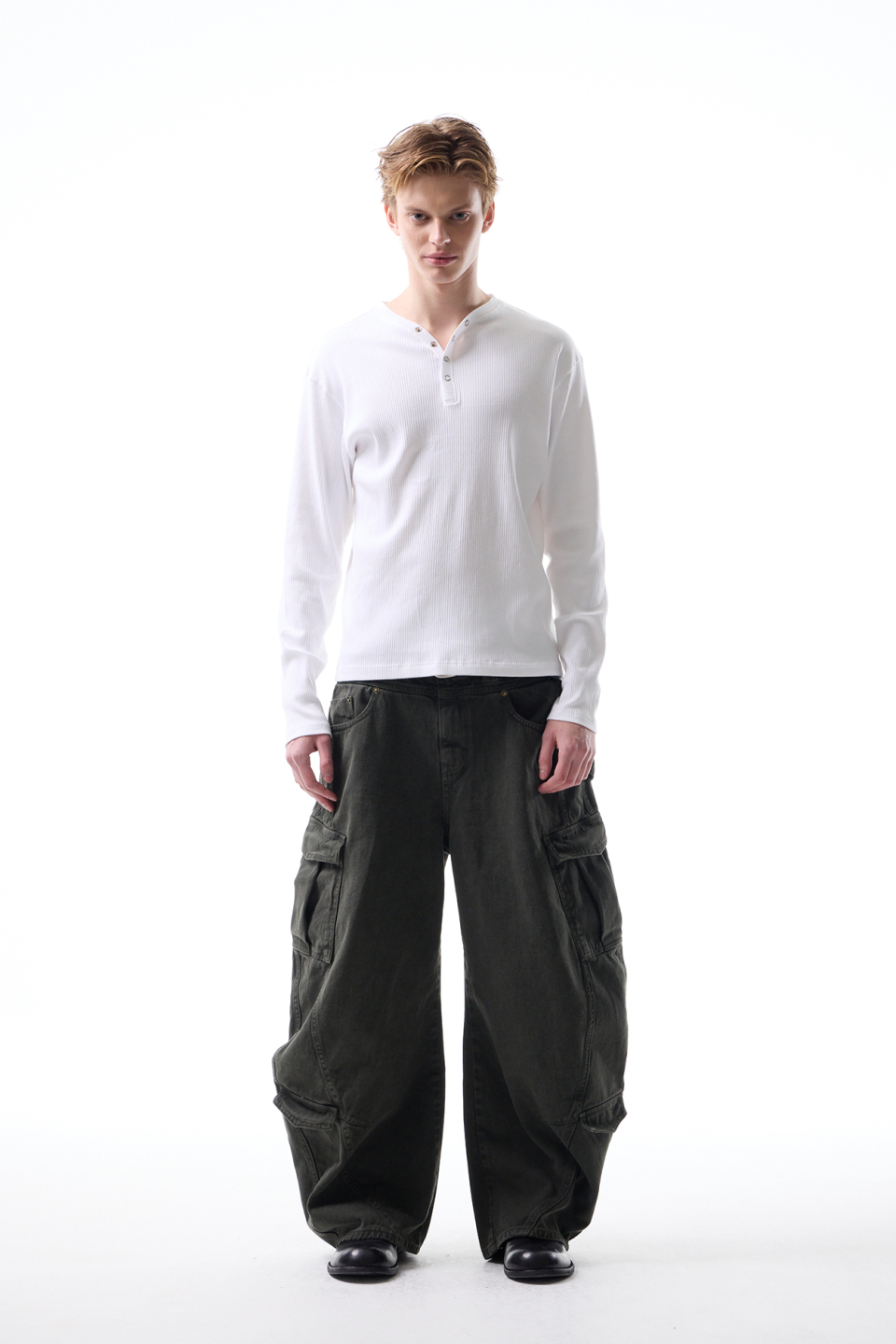 일반적인 헨리넥과 다른 브이넥 형태로 자연스러운 넥라인이 남성적인 분위기 연출