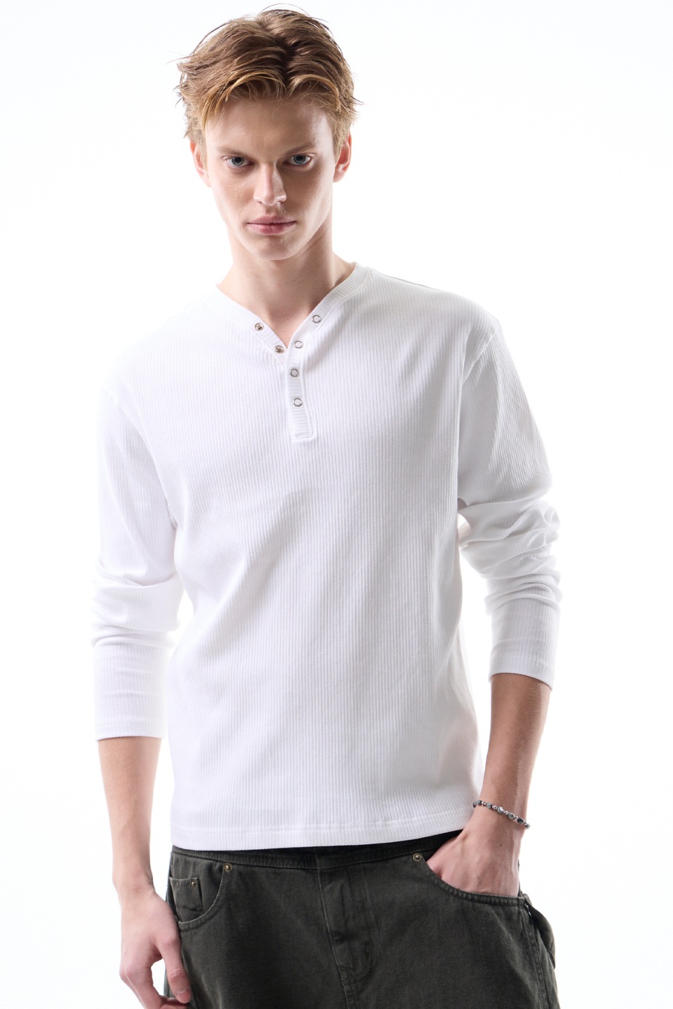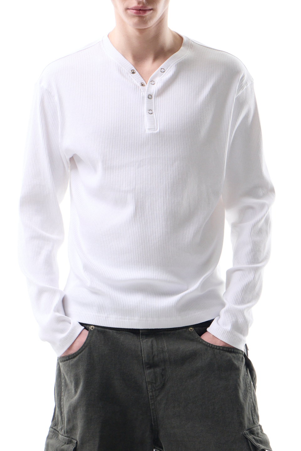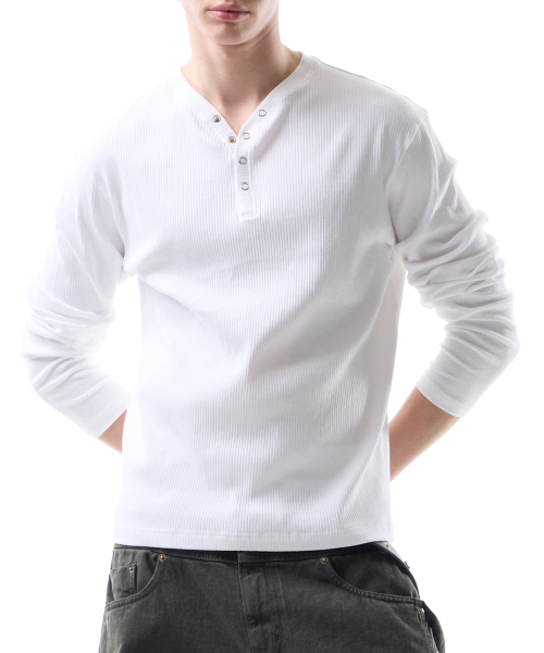 부드러운 텍스처의 골지 조직과 슬림한 핏을 연출하는 브이넥 스냅 롱슬리브 티셔츠