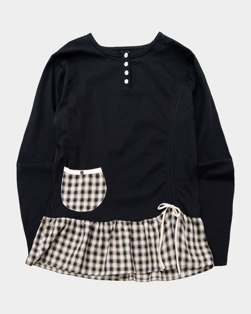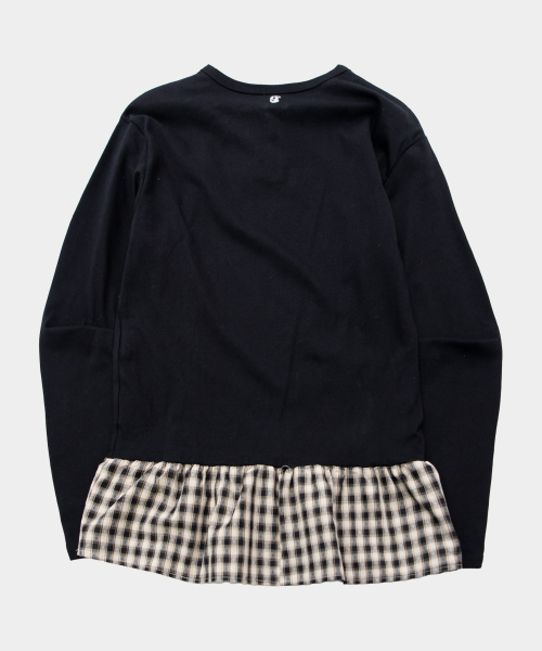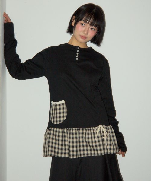 사이드 셔링 체크 배색 프릴 버튼 레이어드 롱슬리브 티셔츠 [블랙]