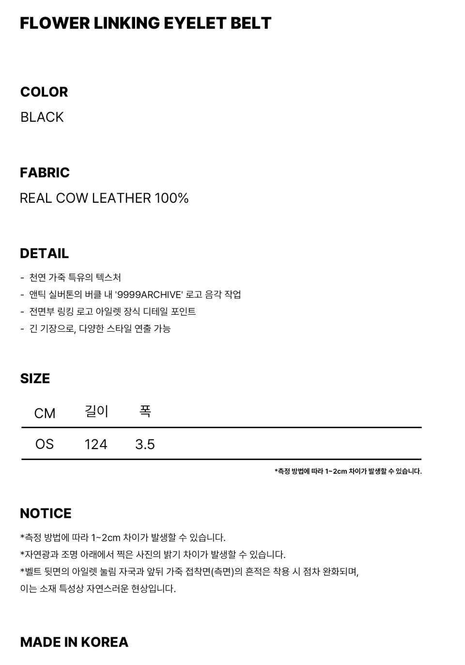 *벨트 뒷면의 아일렛 눌림 자국과 앞뒤 가죽 접착면(측면)의 흔적은 착용 시 점차 완화되며, 이는 소재 특성상 자연스러운 현상입니다.*