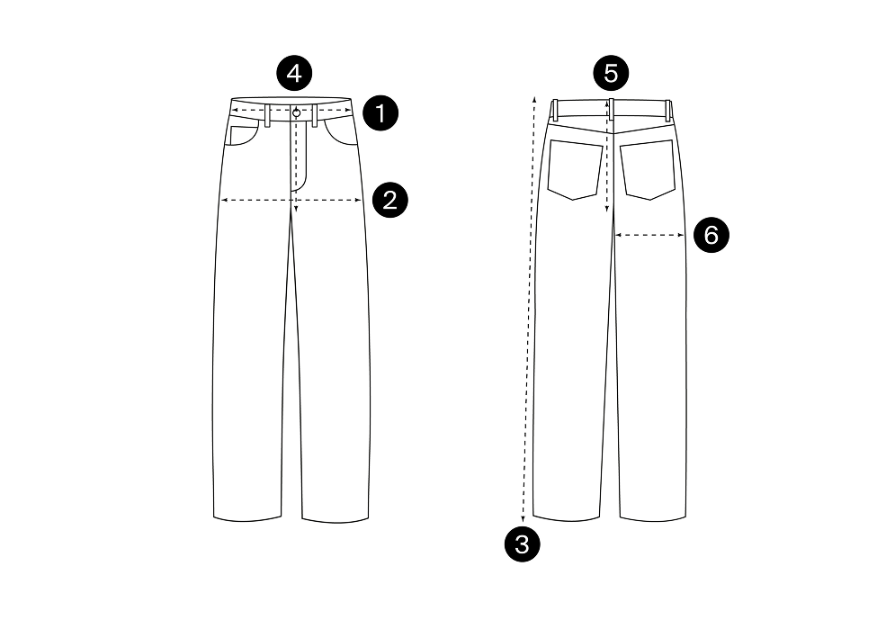 1 허리둘레 허리에서 가장 가는 부분으로 허리둘레를 측정합니다. 2 엉덩이둘레 엉덩이 높이에서 골반의 가장 넓은 부분 둘레를 측정합니다. 3 길이 의류의 최상단에서 하단까지 측정합니다. 4 앞 밑위 길이 앞쪽 밑위 아래 시접에서 허리 부분 끝까지 일직선으로 측정합니다. 5 뒷 밑위 길이 앞쪽 밑위 아래 시접에서 허리 부분 끝까지 일직선으로 측정합니다. 6 허벅지 너비 뒤쪽 밑위 아래 시접에서 허리 부분 끝까지 일직선으로 측정합니다. |