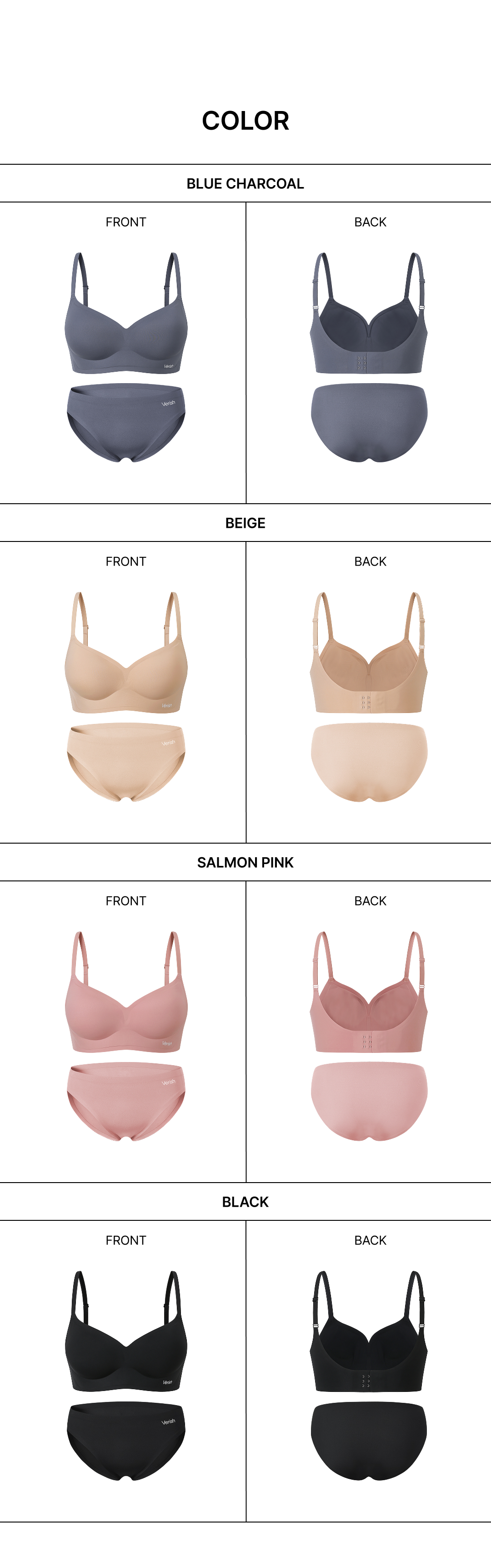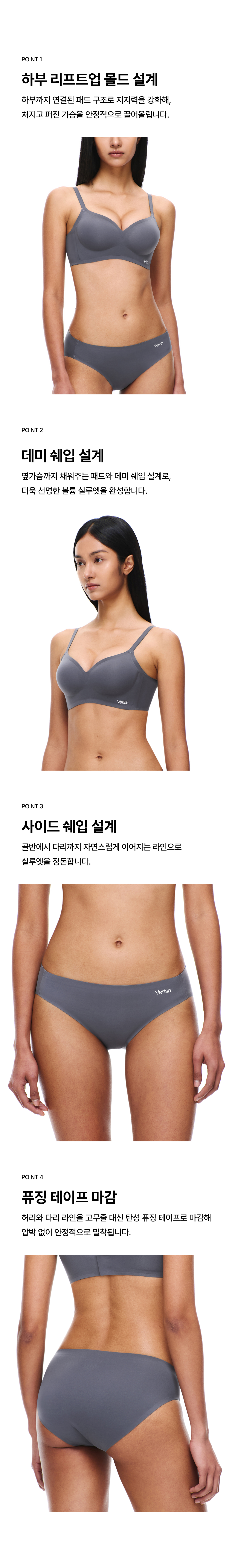 베리시(VERISH)는 'You are what you feel(좋은 느낌이, 좋은 나를 만든다)'라는 슬로건으로, 피부와 가장 가까운 언더웨어를 제안하는 브랜드입니다. 심리스 & 와이어리스 기술력과 부드러운 감촉으로, 보이는 것만큼 느끼는 것이 중요한 필링 웨어를 선보입니다.