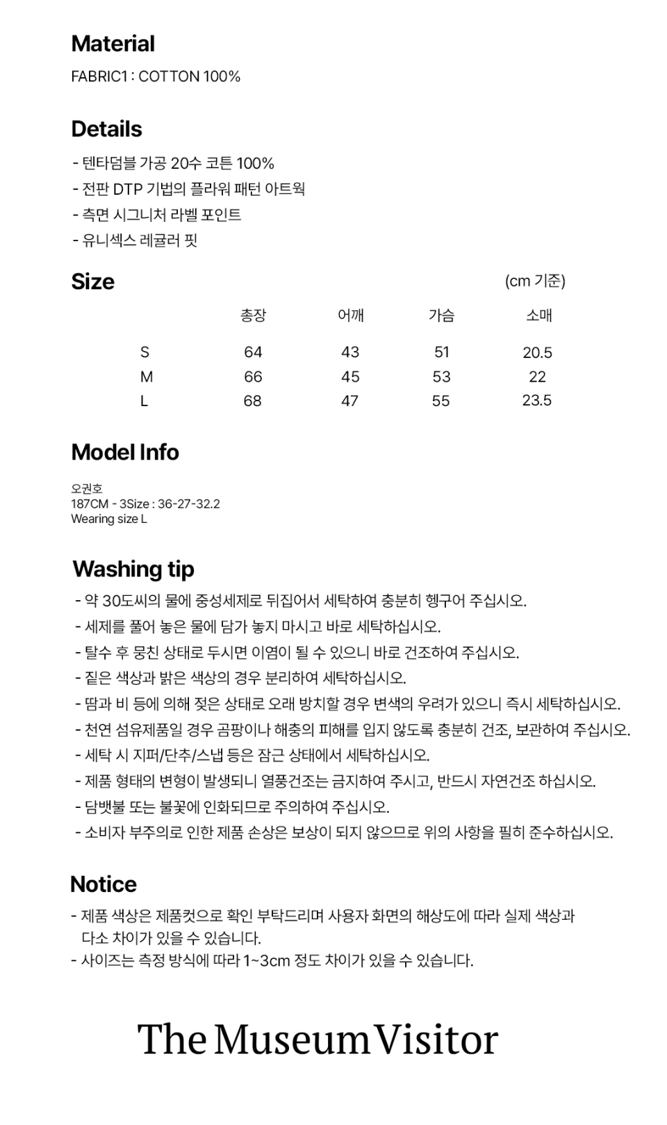 더뮤지엄비지터(THE MUSEUM VISITOR)는 2016년 디렉터 박문수의 독일 베를린 여정에서부터 시작된 브랜드입니다. 거리와 사람들에게서 느낀 자유와 사랑, 행복, 예술이 담긴 도시에서 받은 영감을 많은 이들에게 전하고자 합니다. 주로 꽃과 하트, 자연, 아이들이 디자인적 요소로 나타나며, 수작업이 가미된 차별적인 디자인 덕에 많은 마니아층의 사랑을 받고 있습니다.